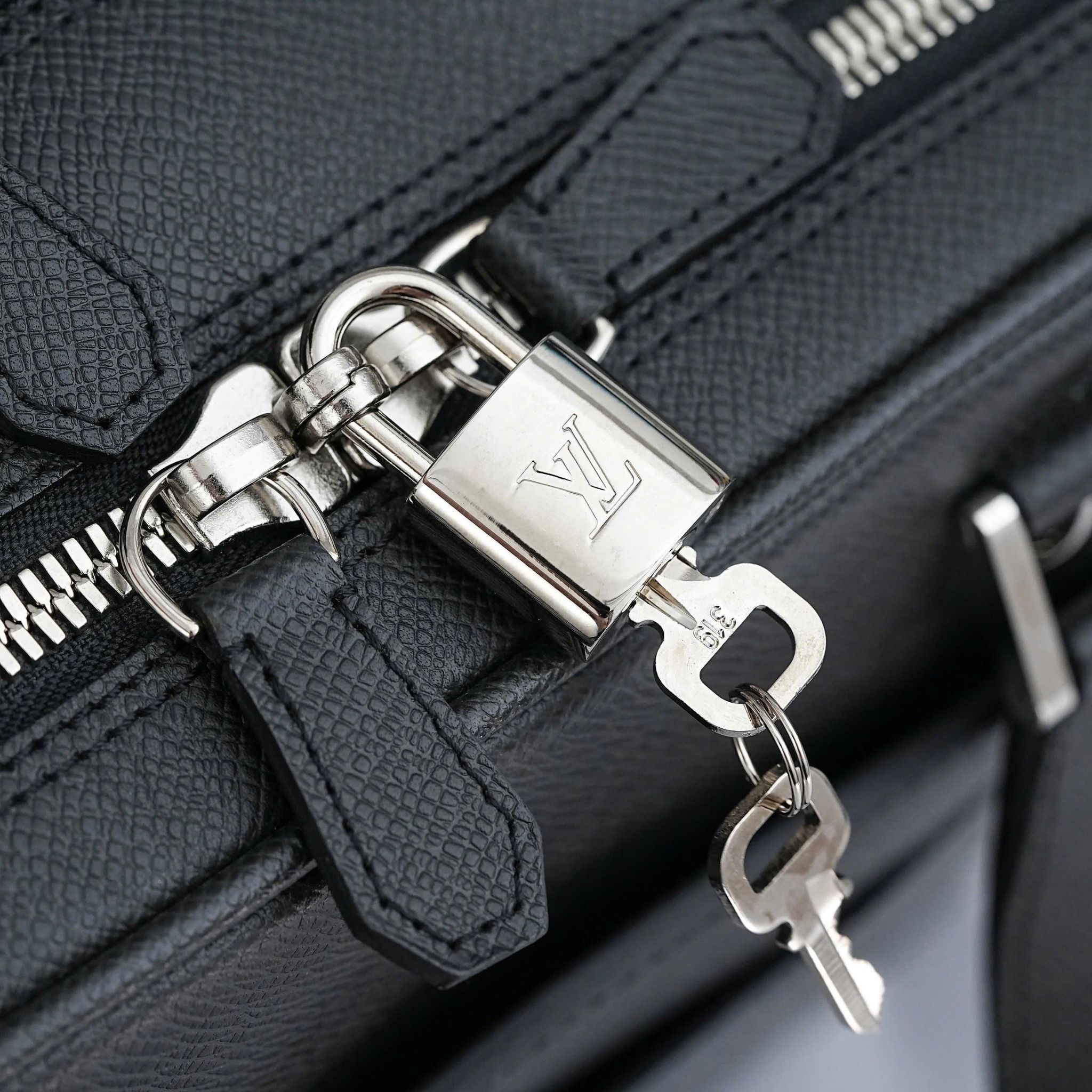 - Sử dụng chất liệu da Taiga đặc trưng, vốn là biểu tượng nổi tiếng của Louis Vuitton, chiếc cặp được bao phủ bởi tông màu đen quyền lực và huyền bí. Logo LV dập chìm tinh tế ở góc, kết hợp với chi tiết khóa ánh bạc, tạo nên tổng thể nổi bật và sang trọng cho sản phẩm.