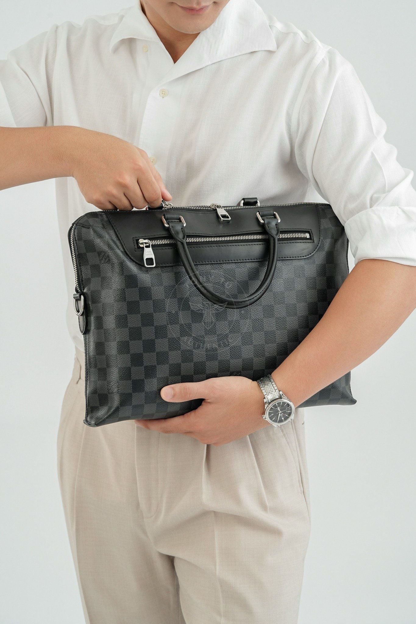- Thiết kế Porte-Documents Jour NM mang đậm chất công sở gọn gàng, nay được kết hợp cùng màu đen xám với họa tiết Damier của Louis Vuitton, mang tới dấu ấn hiện đại và tinh tế.