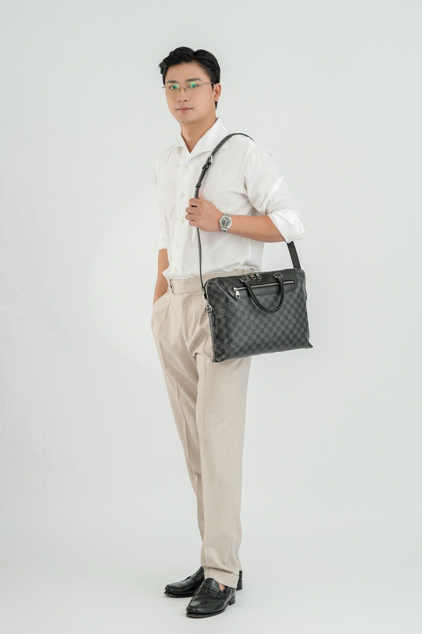 - Tông đen xám tinh giản kết hợp cùng họa tiết Damier ô vuông đặc trưng của Louis Vuitton.