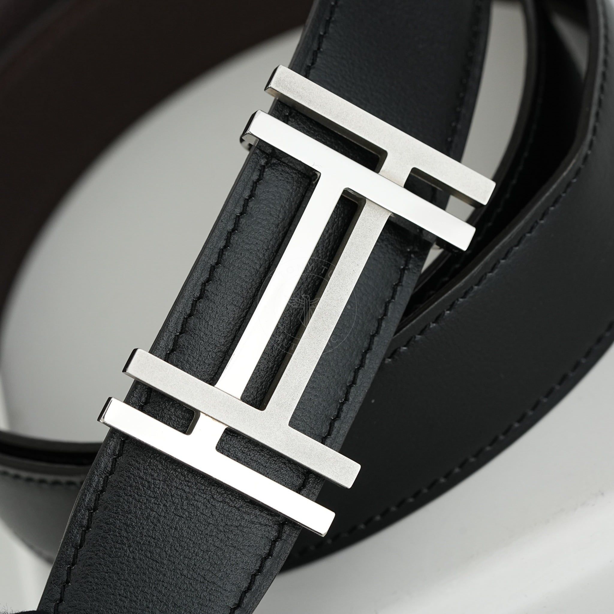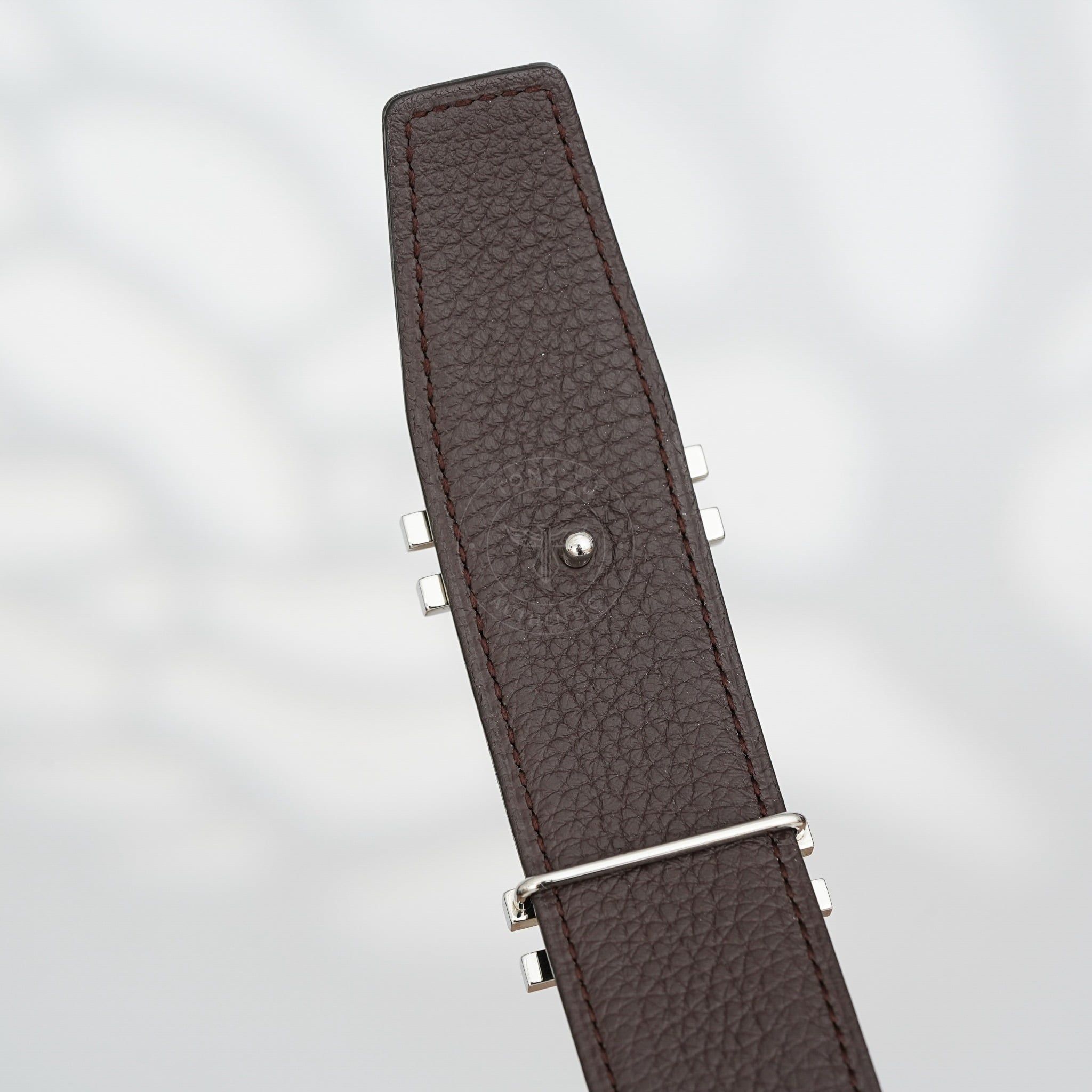 - Dây da reversible kết hợp giữa Box Calf đen và Togo nâu – hai tông màu kinh điển, dễ phối với mọi kiểu trang phục, từ suit công sở cho đến blazer dạo phố.