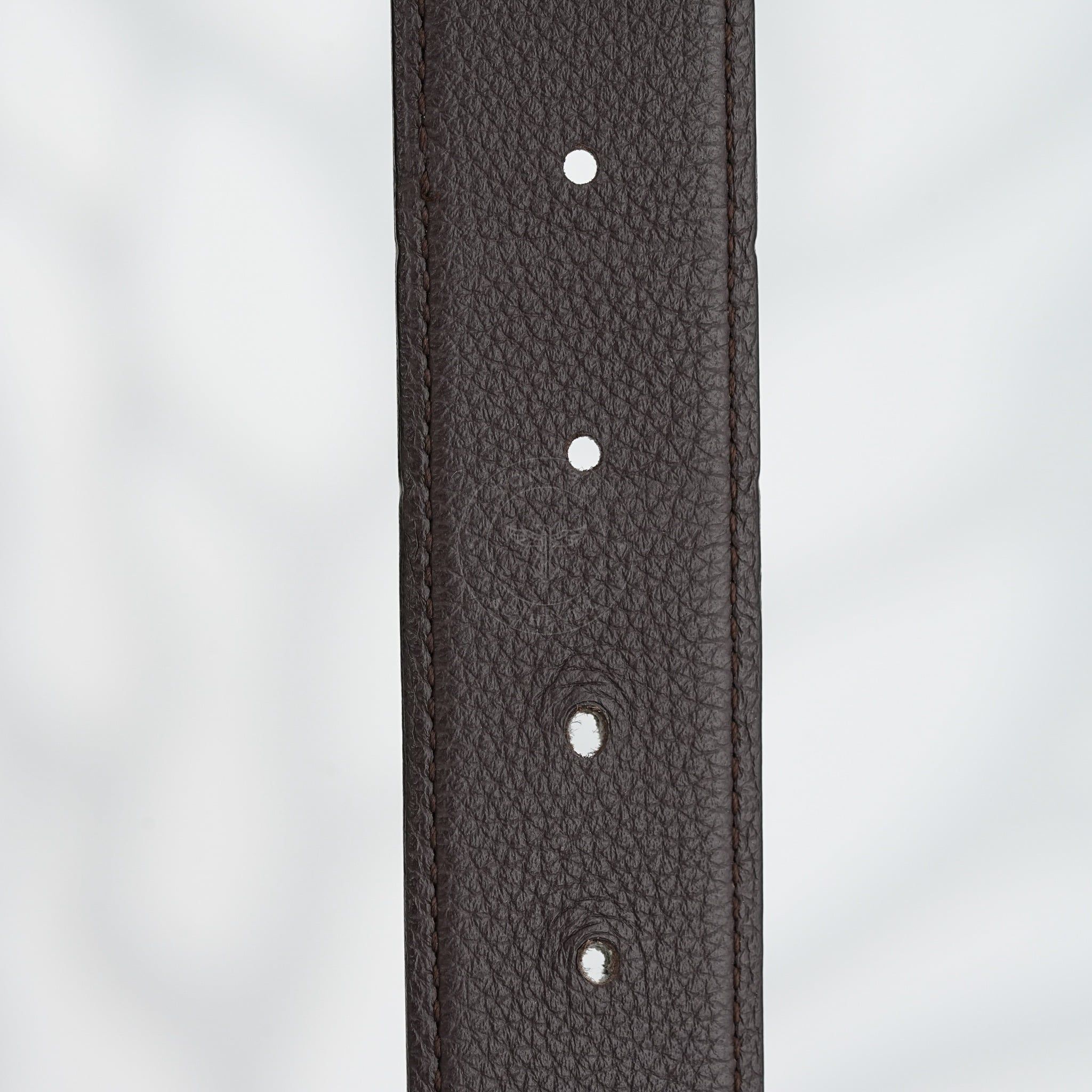 - Dây da Reversible kết hợp giữa Box Calf đen và Togo nâu – hai tông màu kinh điển, dễ phối với mọi kiểu trang phục, từ suit công sở cho đến blazer dạo phố.