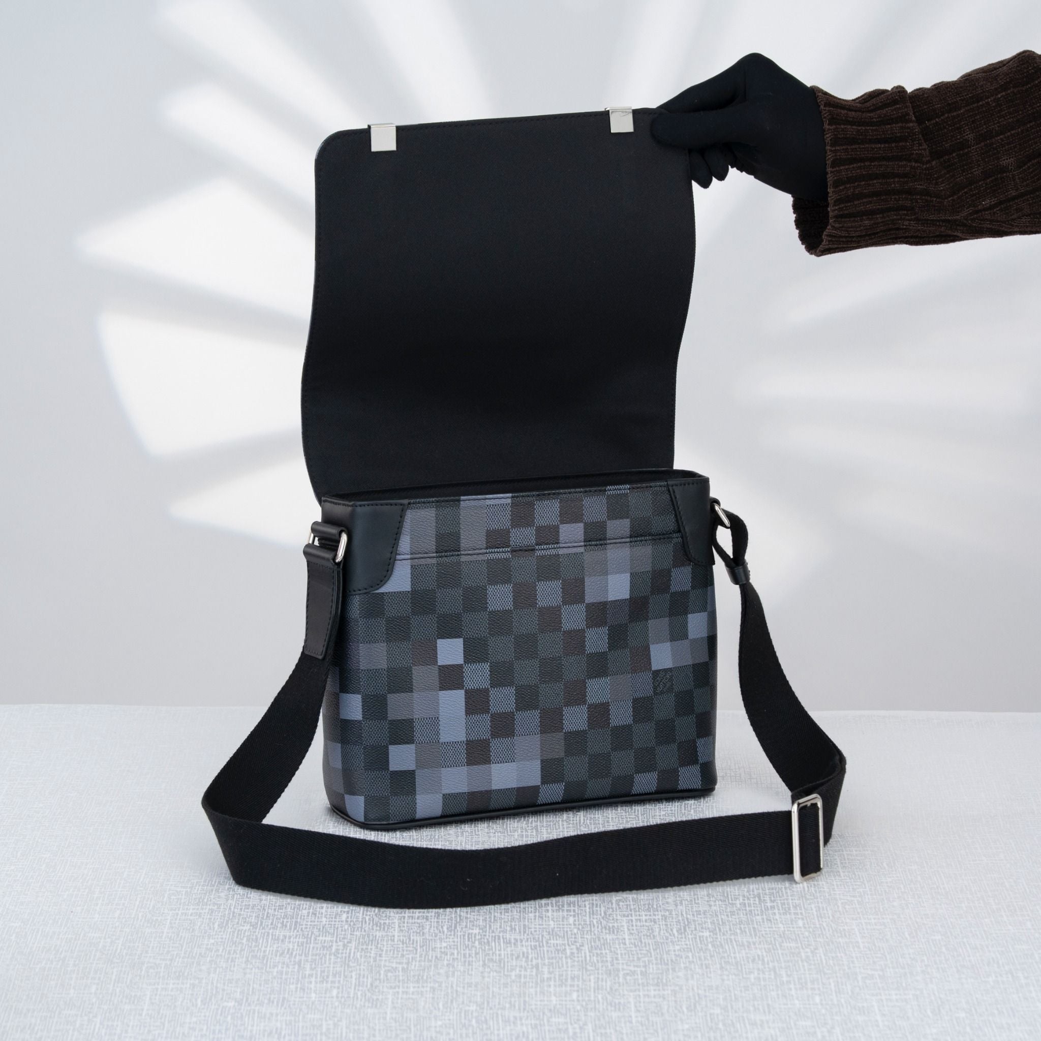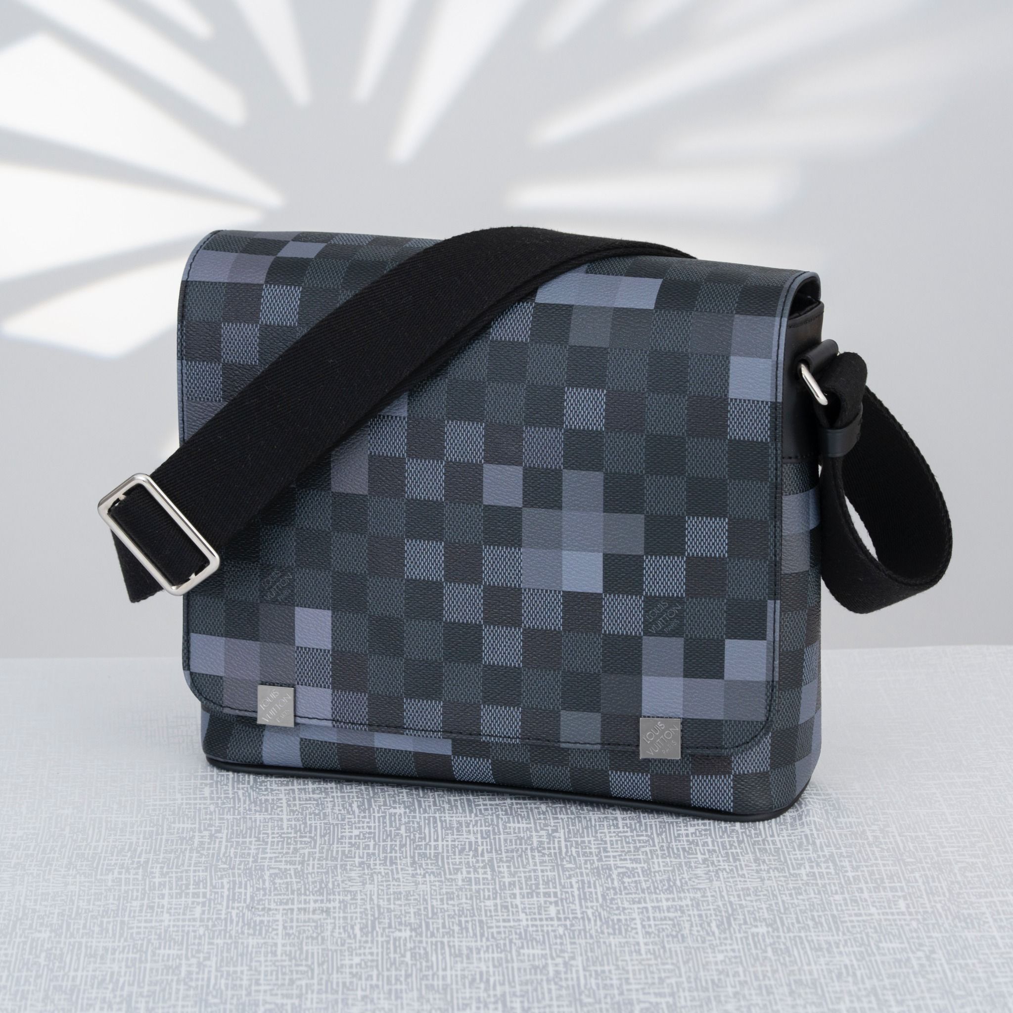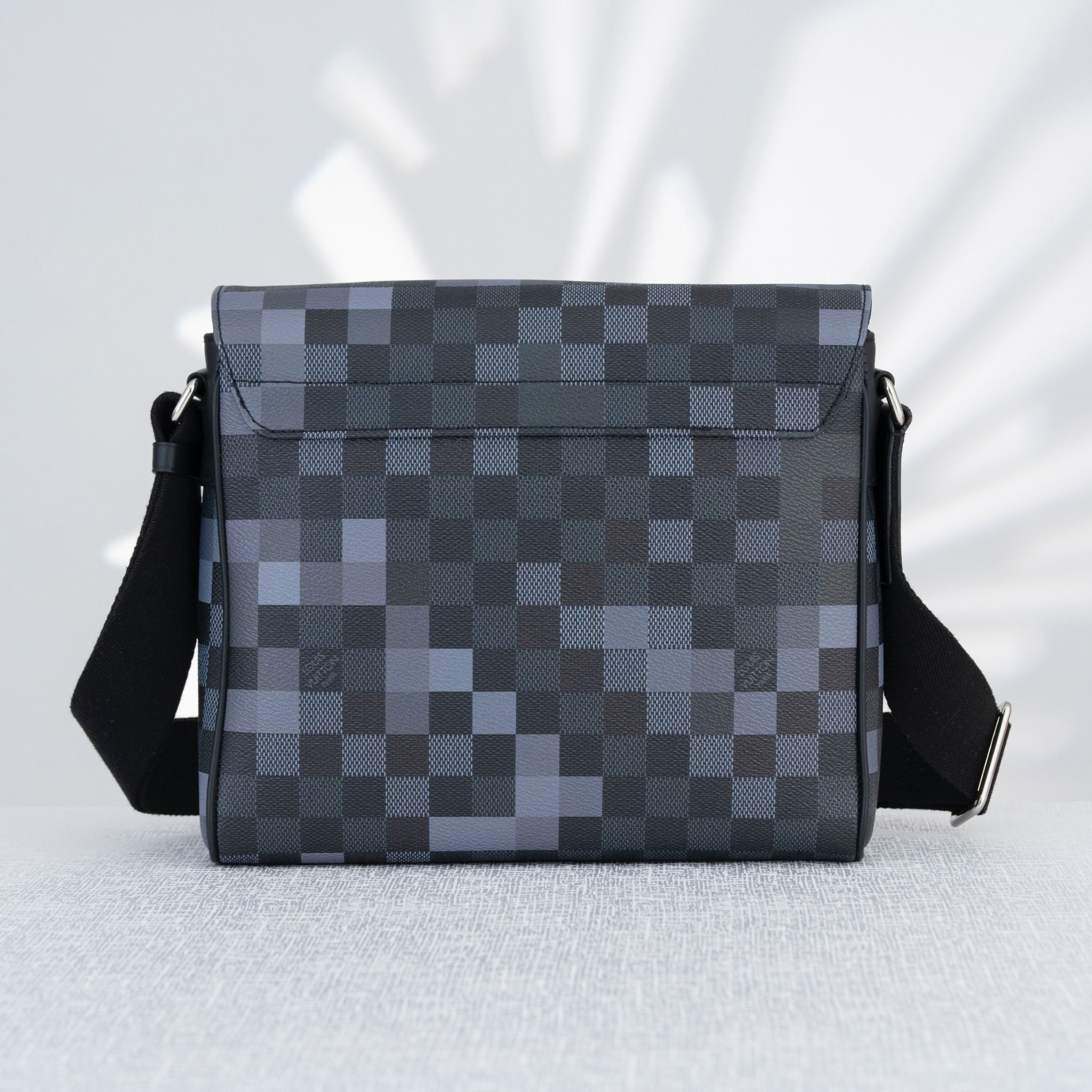 -Phiên bản Louis Vuitton District PM Damier Graphite Pixel Gray mang tinh thần hiện đại và cá tính, nổi bật với họa tiết Damier Graphite được làm mới bằng hiệu ứng pixel xám độc đáo, tạo chiều sâu thị giác ấn tượng.