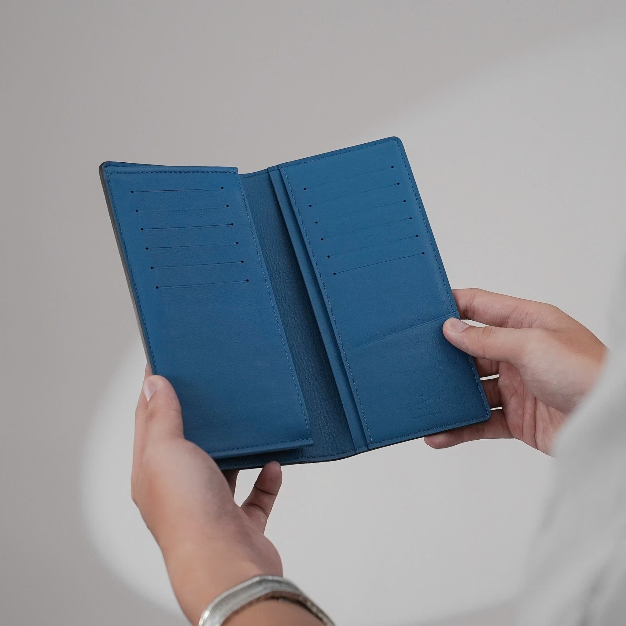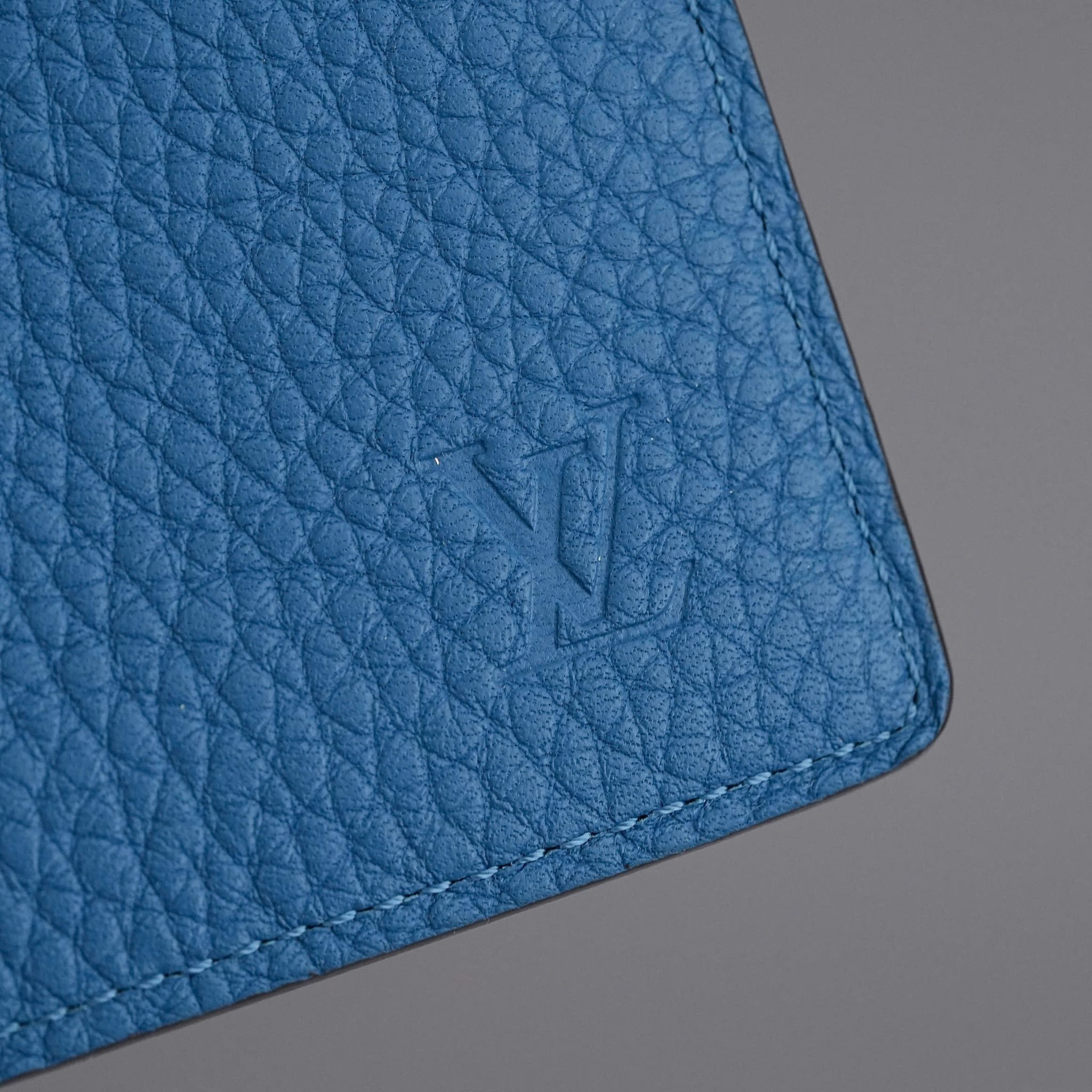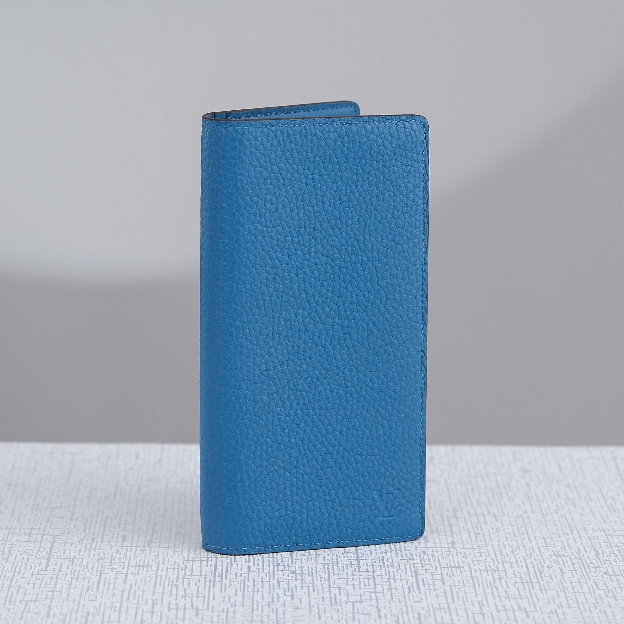 - This Brazza wallet from Louis Vuitton effortlessly blends a classic long-wallet design with a fresh, modern twist, thanks to its vibrant Cyan hue. Made from the finest Taurillon leather, one of Louis Vuitton's most luxurious materials, the wallet showcases the leather’s unique grain and a subtle embossed LV logo in the corner, creating a perfect balance of sophistication and contemporary style.