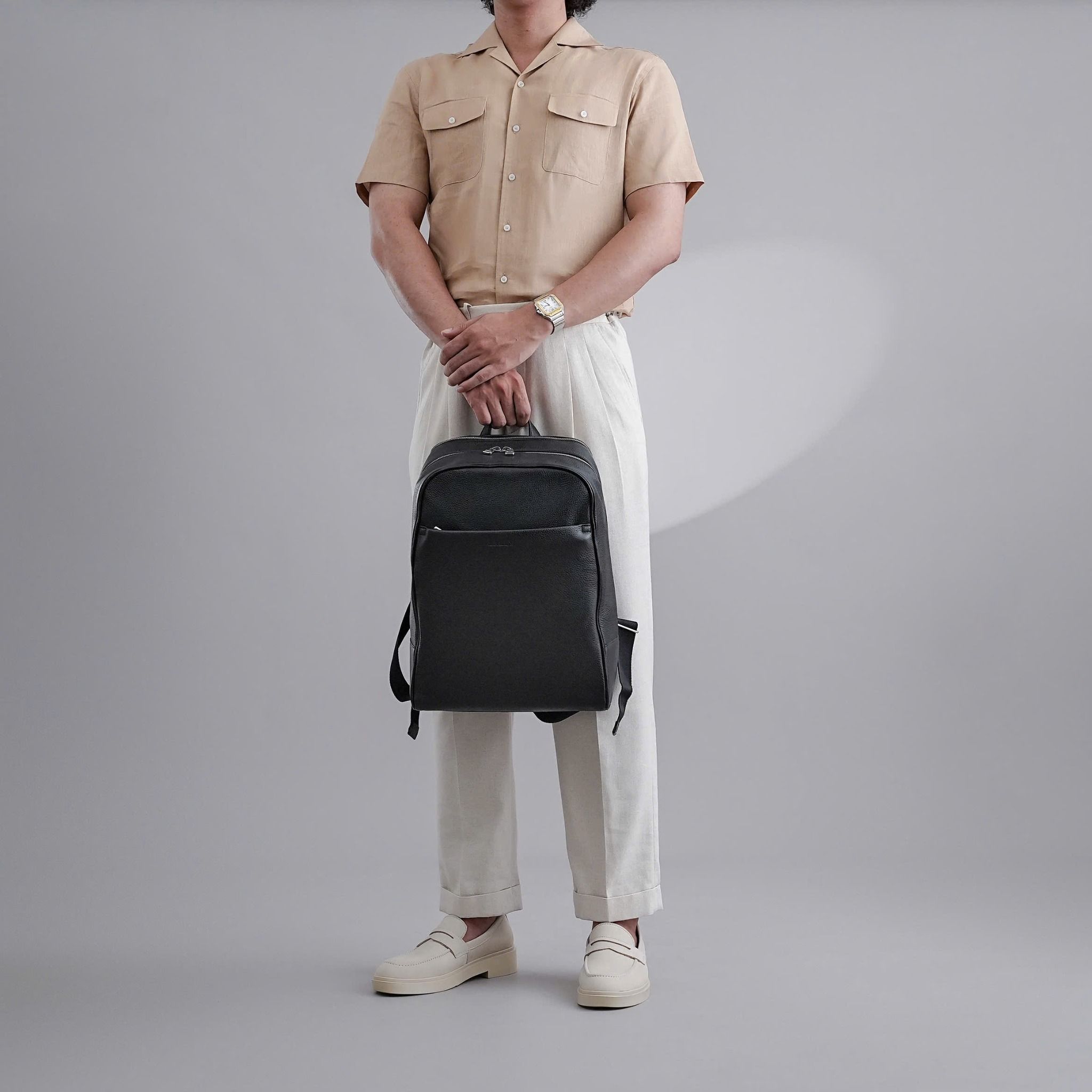 - Sản phẩm được chế tác chất liệu da bê (calf leather) chất lượng cao, mang đến cảm giác mềm mại và độ bền vượt trội. Được tuyển chọn kỹ càng từ các trang trại chăn nuôi công nghệ cao trên các đồi thảo nguyên Thụy Sĩ và cho ra những tấm da bền bỉ và dẻo dai hạng nhất.