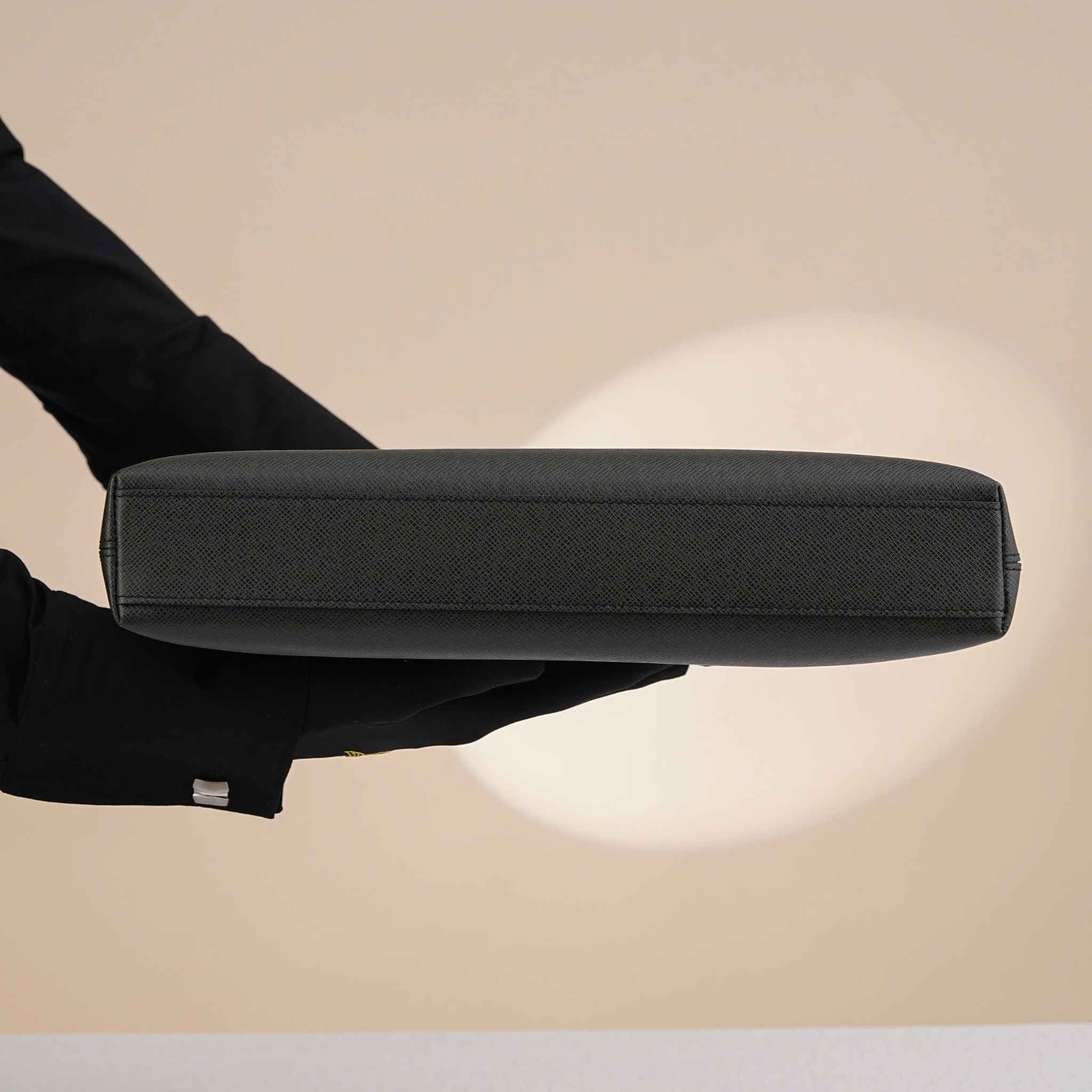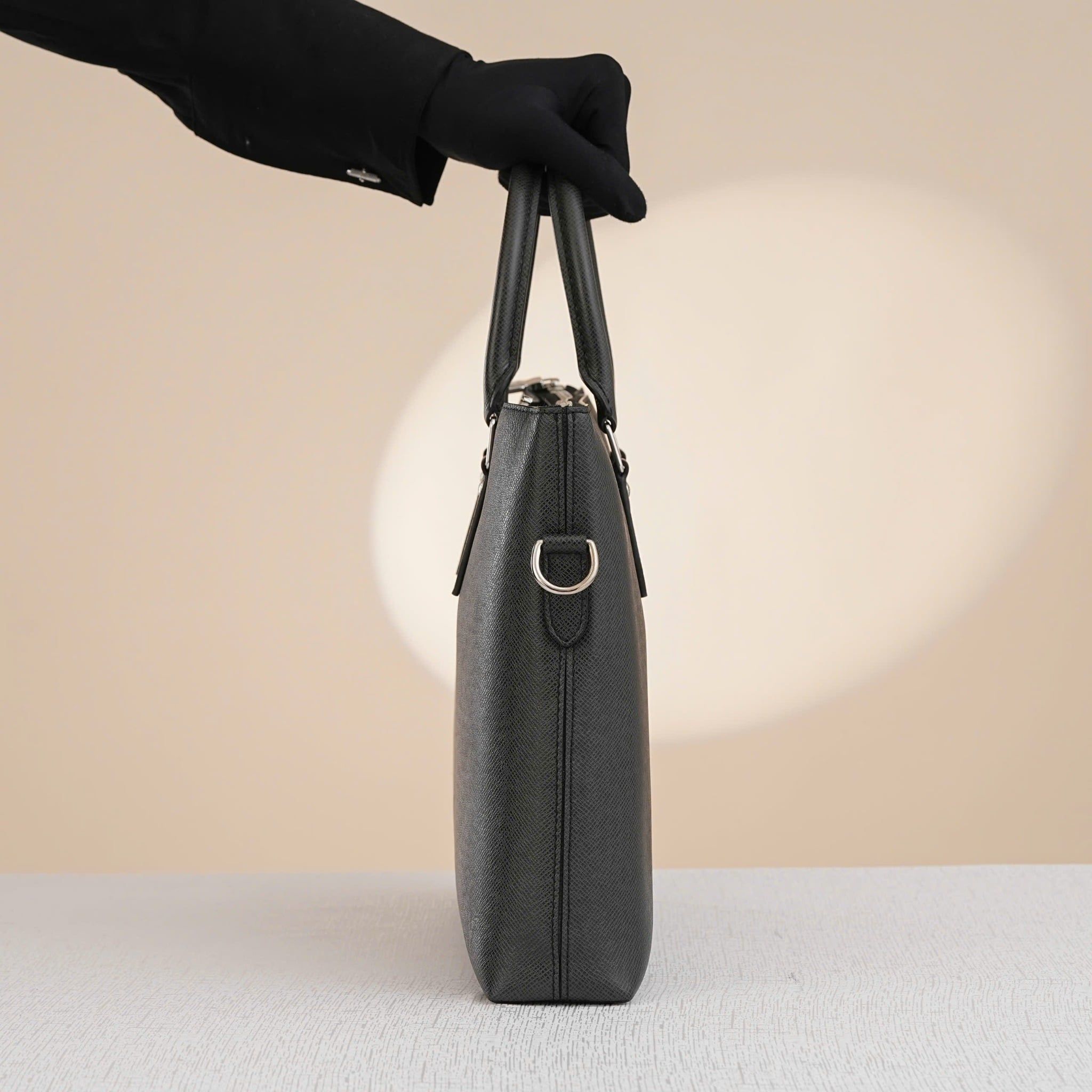 - Crafted from luxurious Taiga leather, inspired by the vast northern Russian forests, the material exudes durability and sophistication. The classic black hue, paired with silver-tone hardware, makes this briefcase a timeless choice for professional meetings and business engagements.