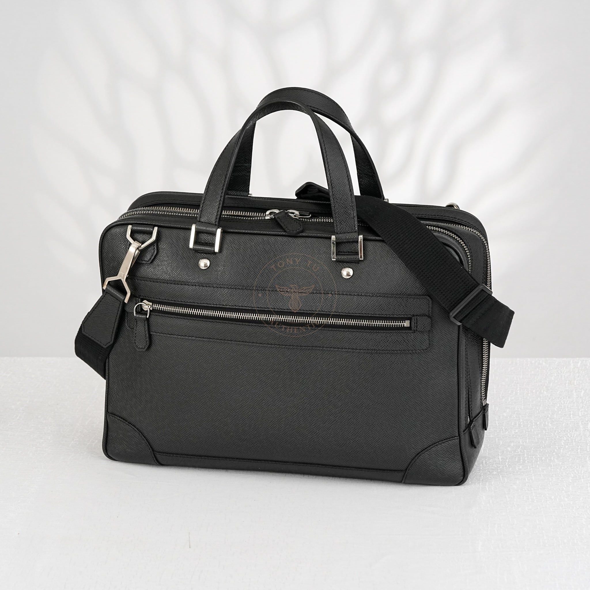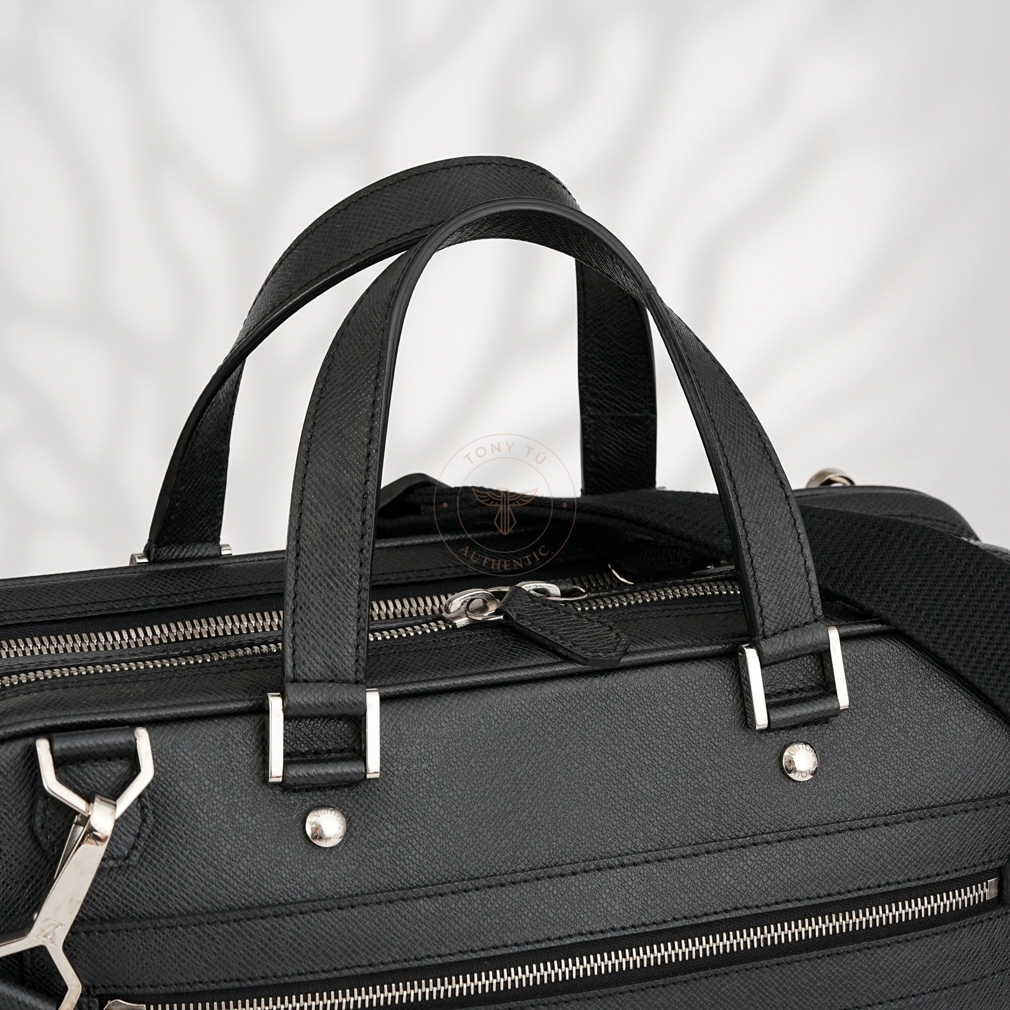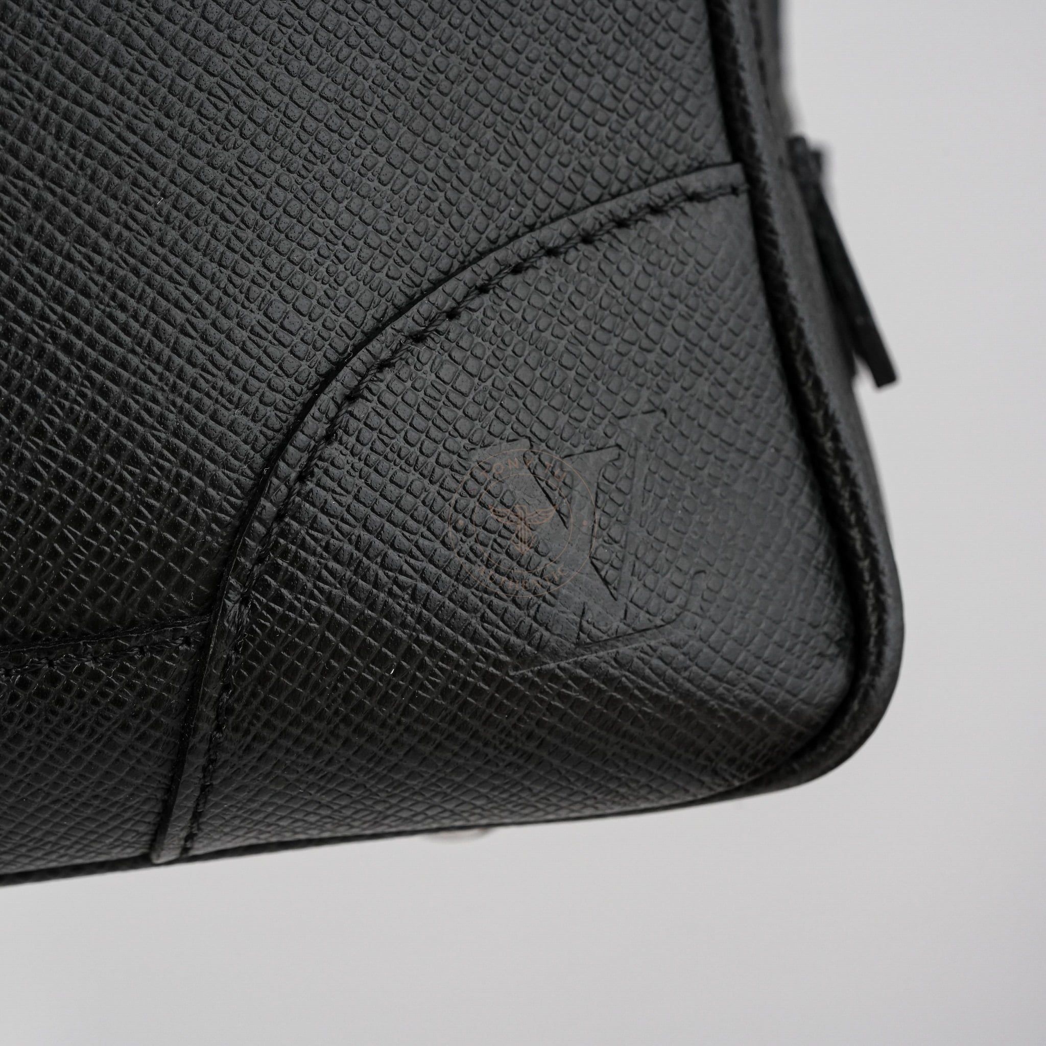 - Sử dụng chất liệu da Taiga đặc trưng, vốn là biểu tượng nổi tiếng của Louis Vuitton, chiếc cặp được bao phủ bởi tông màu đen quyền lực và huyền bí. Logo LV dập chìm tinh tế ở góc, kết hợp với chi tiết khóa ánh bạc, tạo nên tổng thể nổi bật và sang trọng cho sản phẩm.