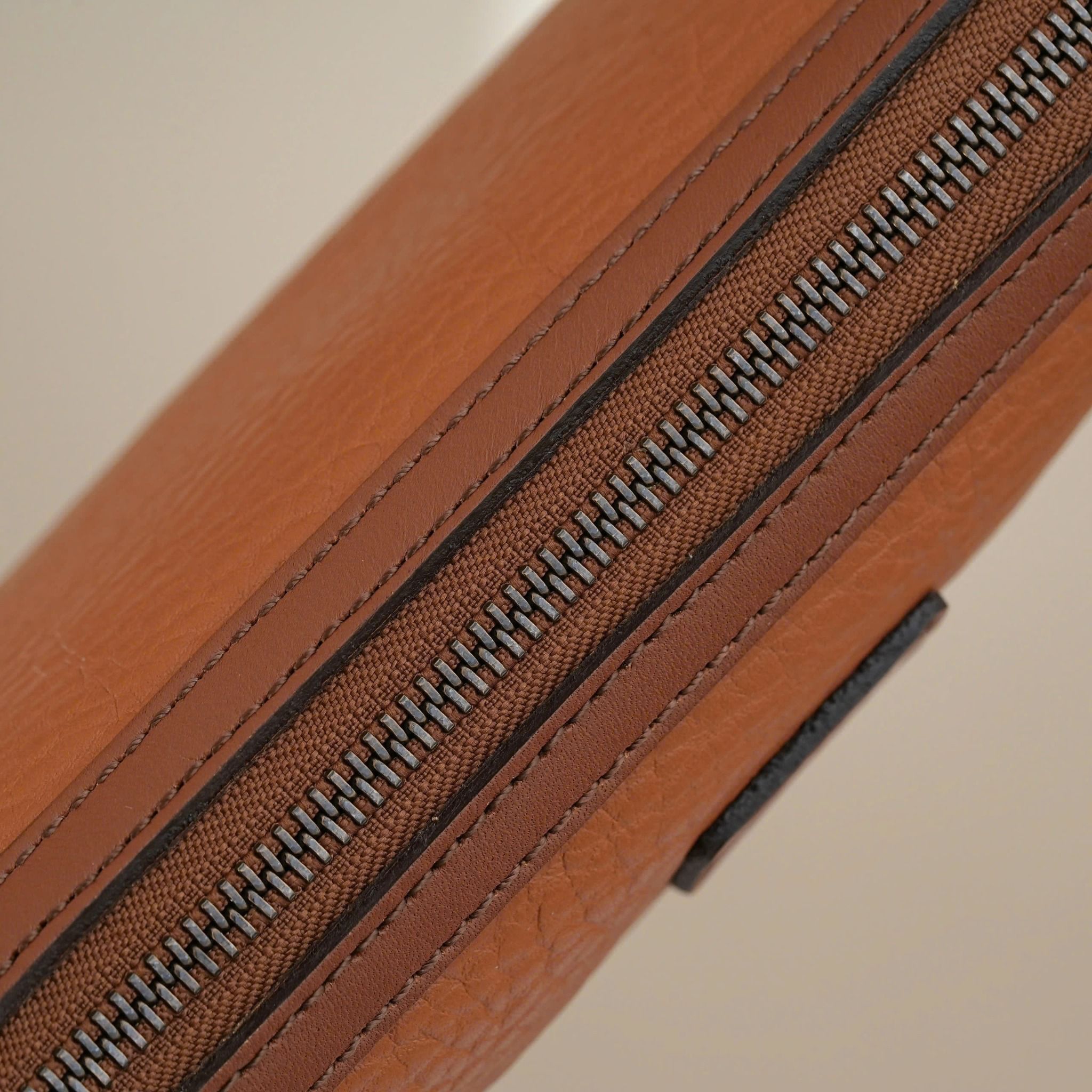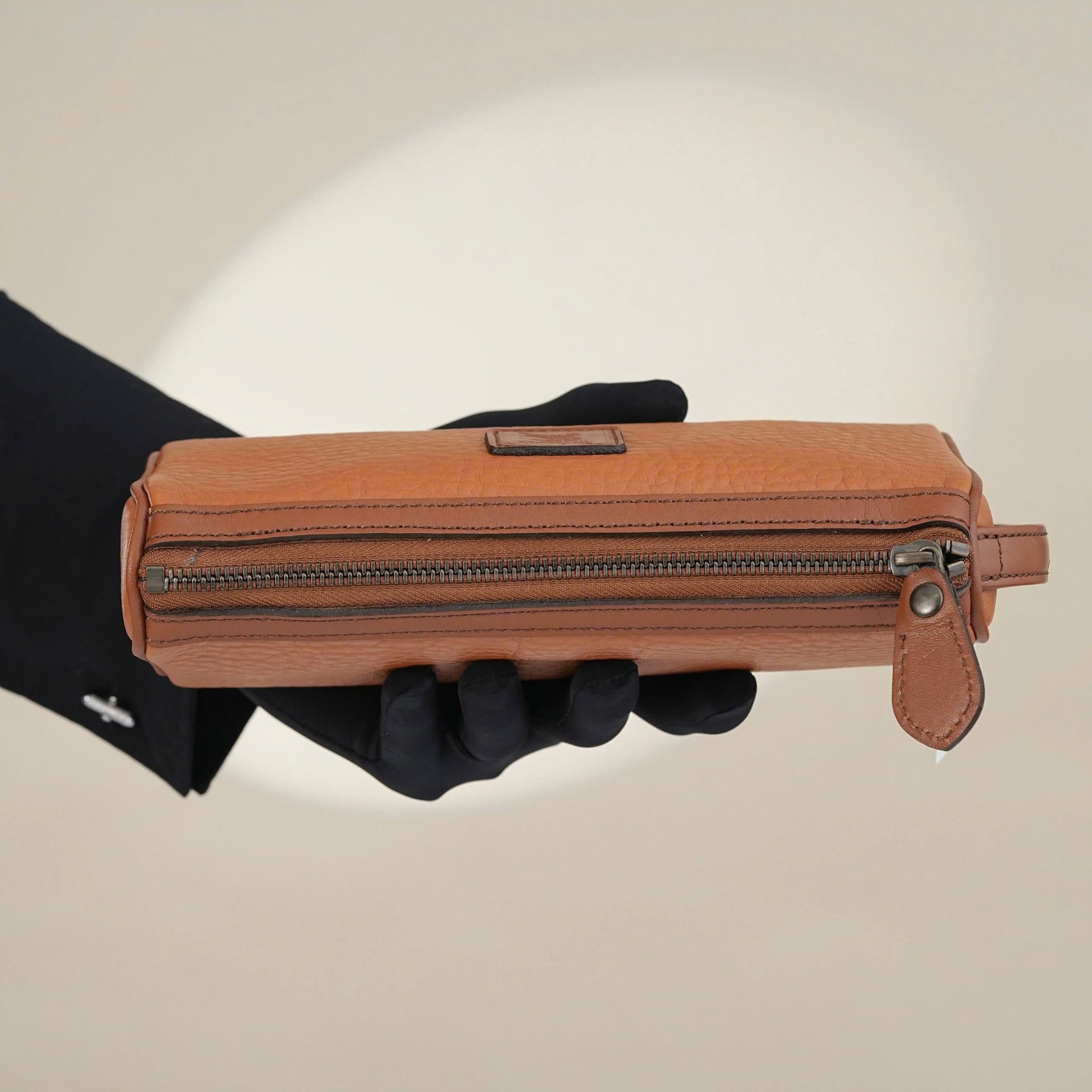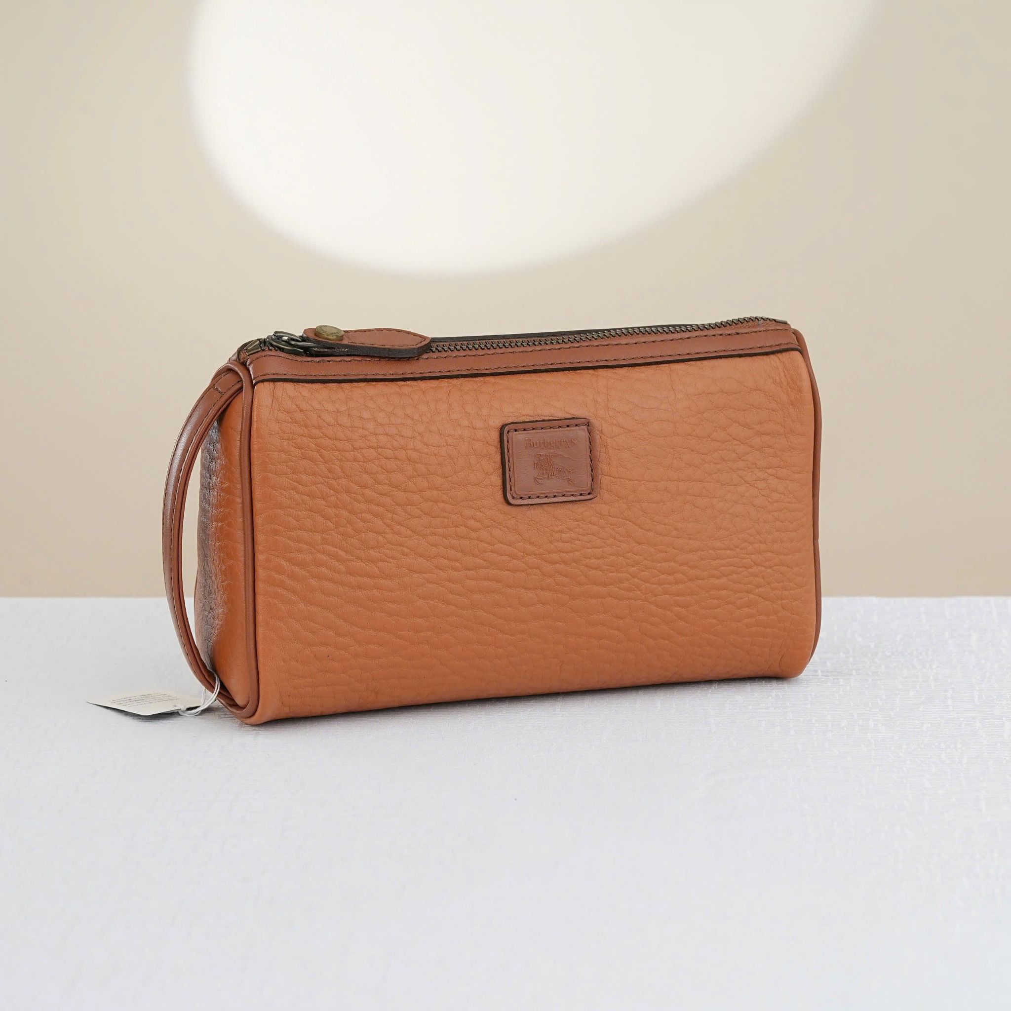 - A rare hybrid clutch from Burberry London, blending the elegance of a clutch with the practicality of a wash bag in a unique light brown tone.