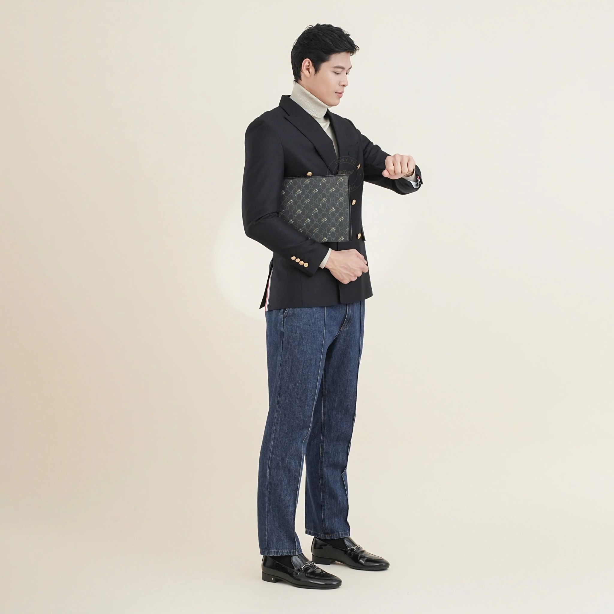 - Tone đen - xám thanh lịch, điểm xuyết vàng nổi bật khiến trang phục của anh trở nên nổi bật trong mọi dịp từ đi chơi, du lịch, tiệc gặp gỡ đến những sự kiện xa hoa nhất.
