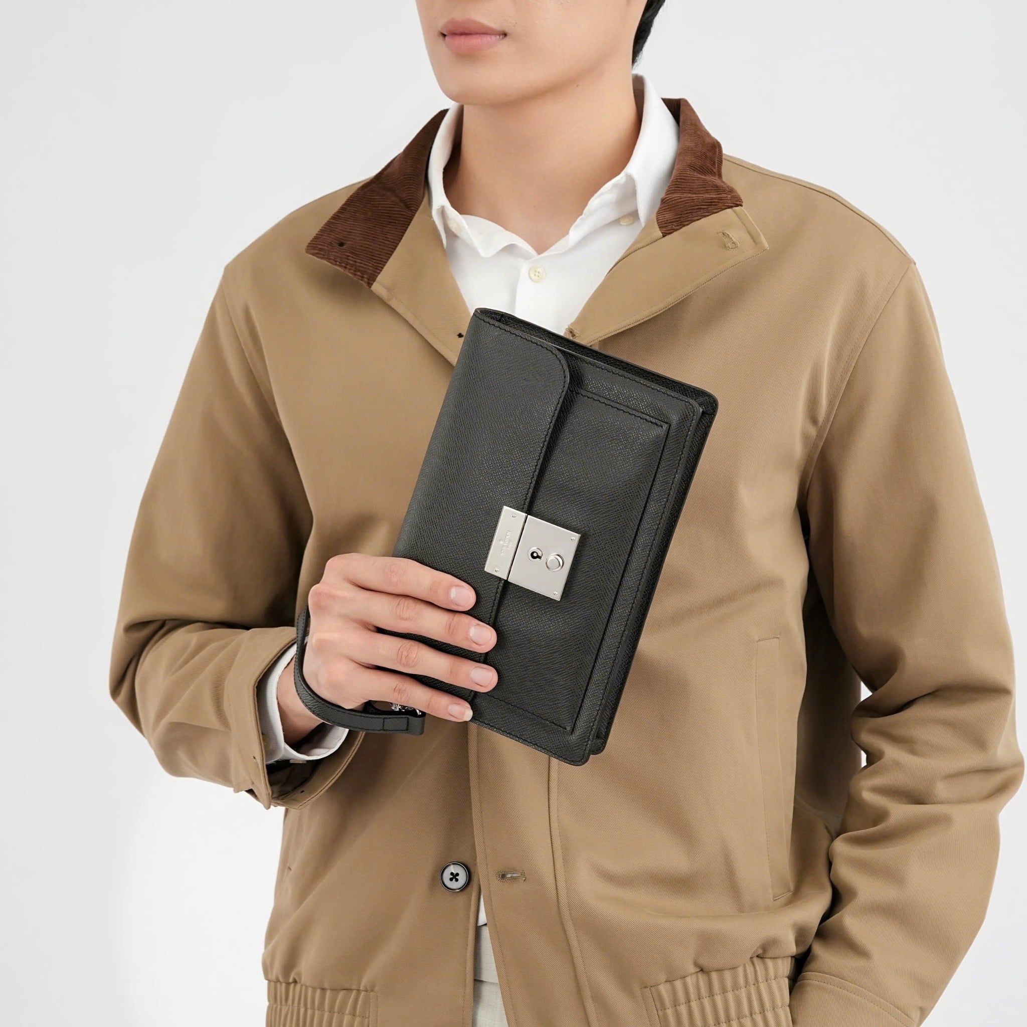 - Clutch được trang bị 1 ngăn chính rộng rãi, thoải mái vừa vặn điện thoại cỡ lớn, hộp kính hay phong bì. Ngoài ra, sản phẩm còn có 1 ngăn có khóa kéo và 2 ngăn phẳng tiện lợi, đảm bảo đáp ứng sự ngăn nắp và gọn gàng khi cần. Dây cổ tay có thể tháo rời, mang lại tính linh hoạt và sự thanh thoát cho các anh.