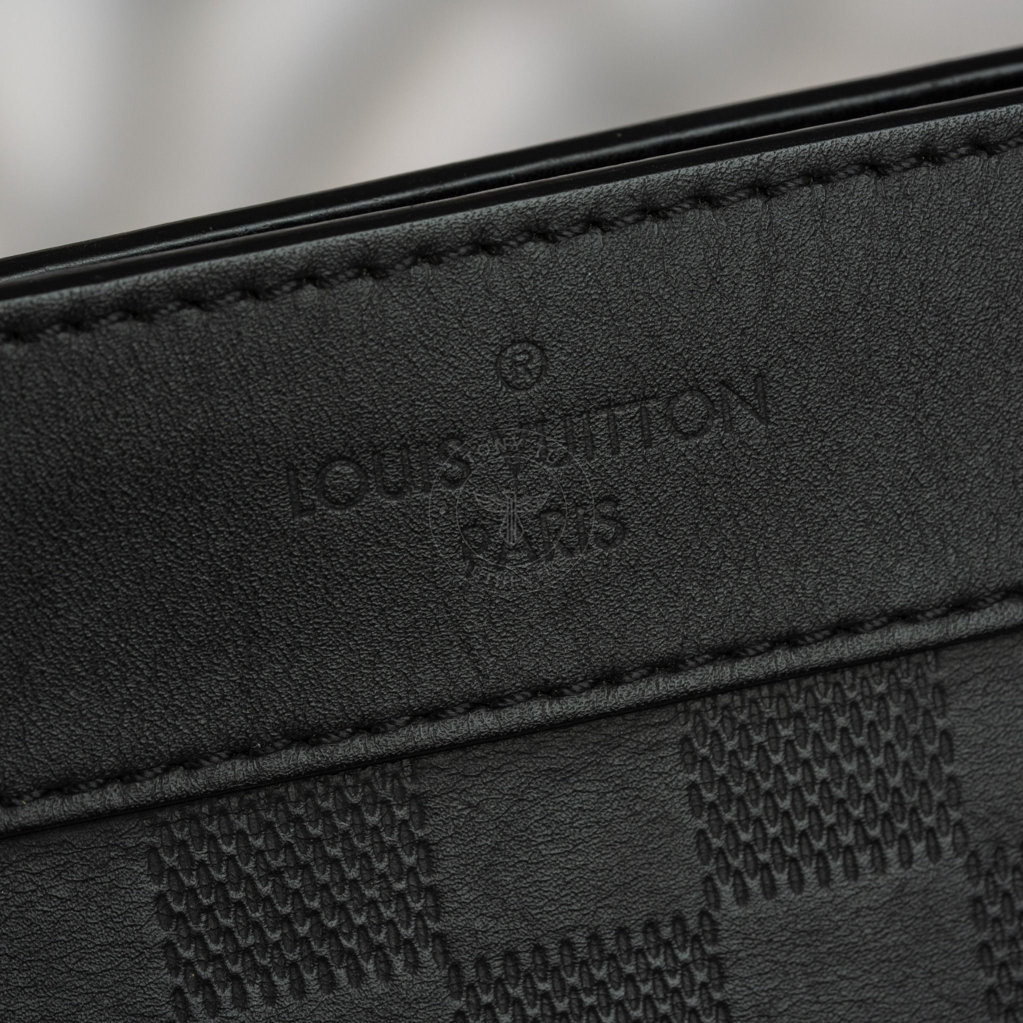- Chế tắc từ da bê kết hợp hoạ tiết Damier Infini dập chìm với họa tiết bàn cờ huyền thoại. Tông đen bao trùm với những chi tiết kim loại ánh bạc mang lại cảm giác kín đáo nhưng vẫn giữ được nét sang trọng.