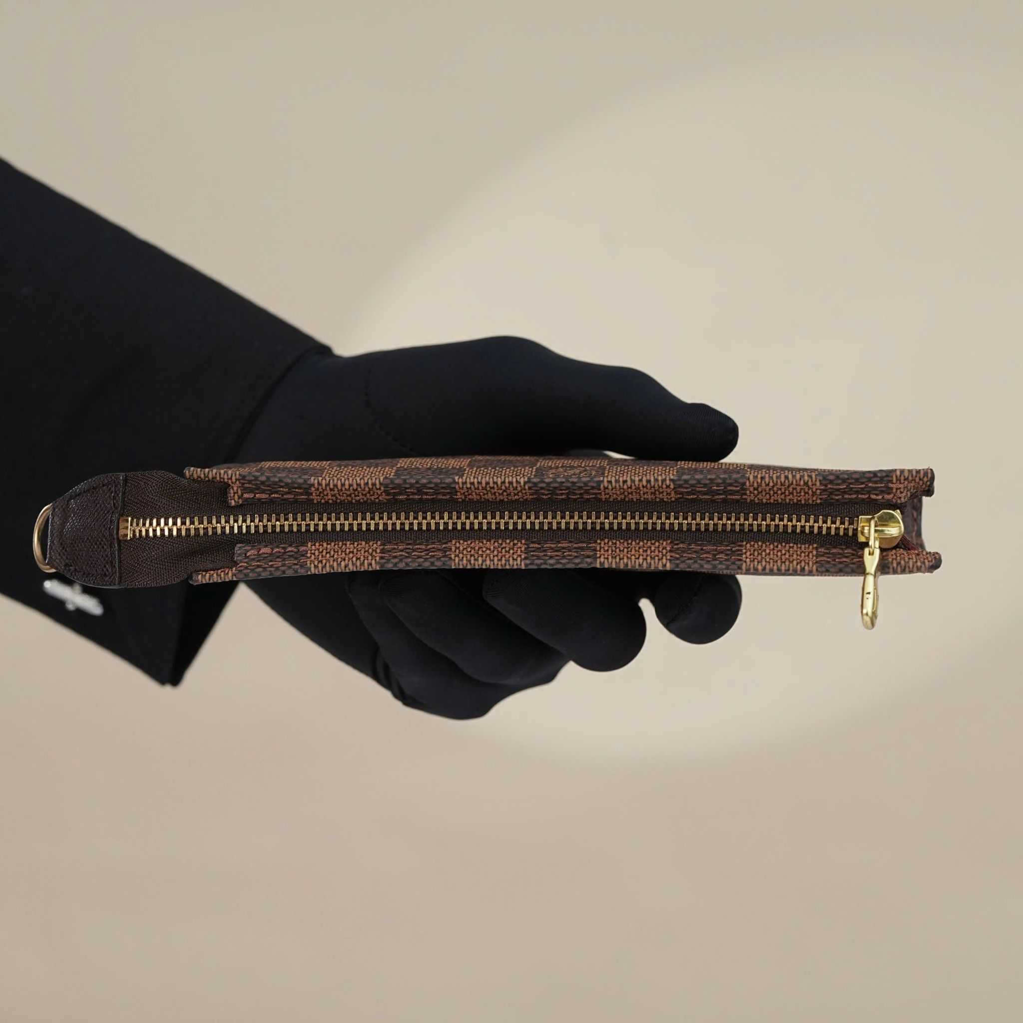 - Với sự kết hợp tinh tế giữa các ô vuông Damier nâu đậm và nhạt, chiếc pouch tạo nên một tổng thể vừa sang trọng vừa cổ điển.