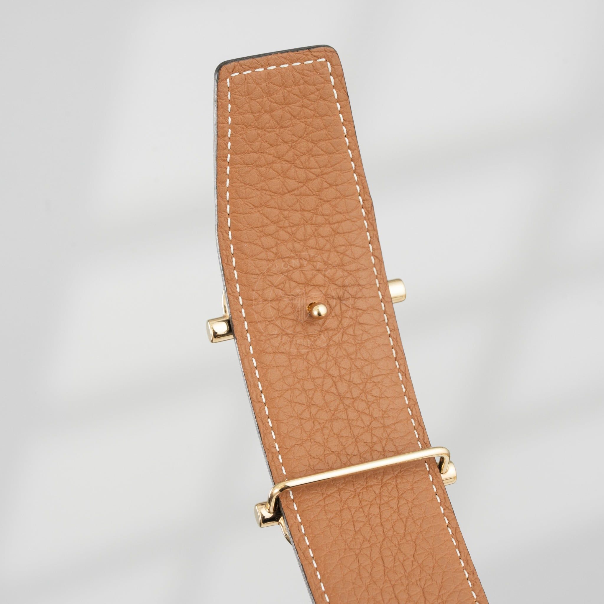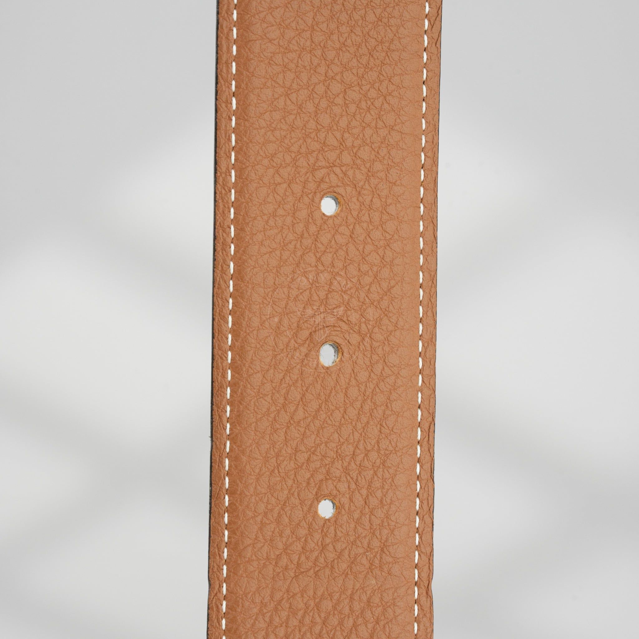 - Dây da reversible kết hợp giữa Box Calf đen và Togo Nâu Gold– hai tông màu kinh điển, dễ phối với mọi kiểu trang phục, từ suit công sở cho đến blazer dạo phố.