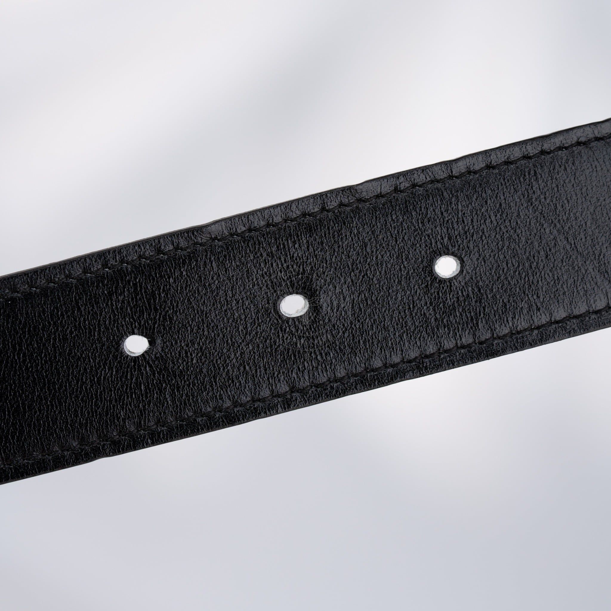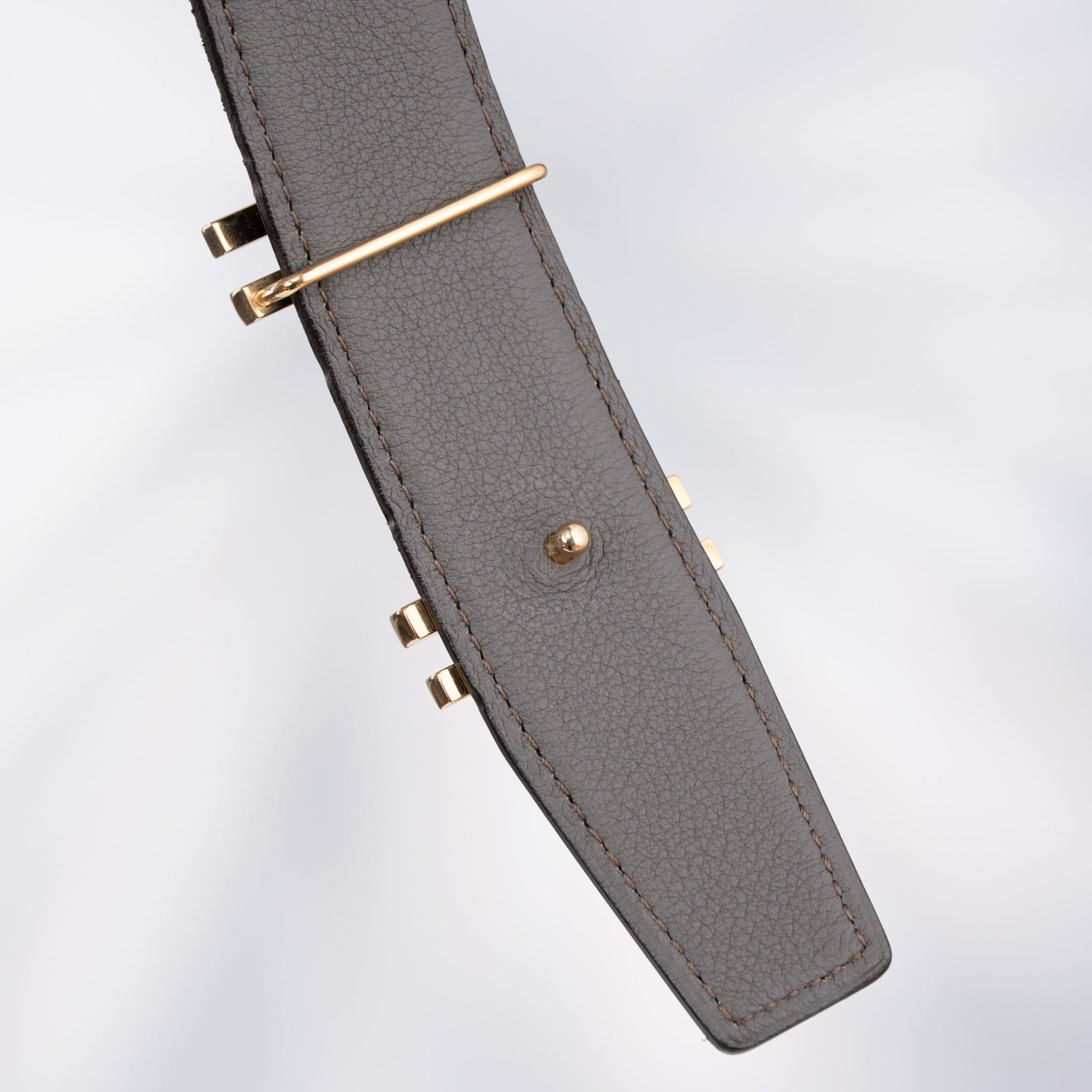 - Dây da reversible kết hợp giữa Box Calf đen và Togo xám, hai tông màu kinh điển, dễ phối với mọi kiểu trang phục, từ suit công sở cho đến blazer dạo phố.