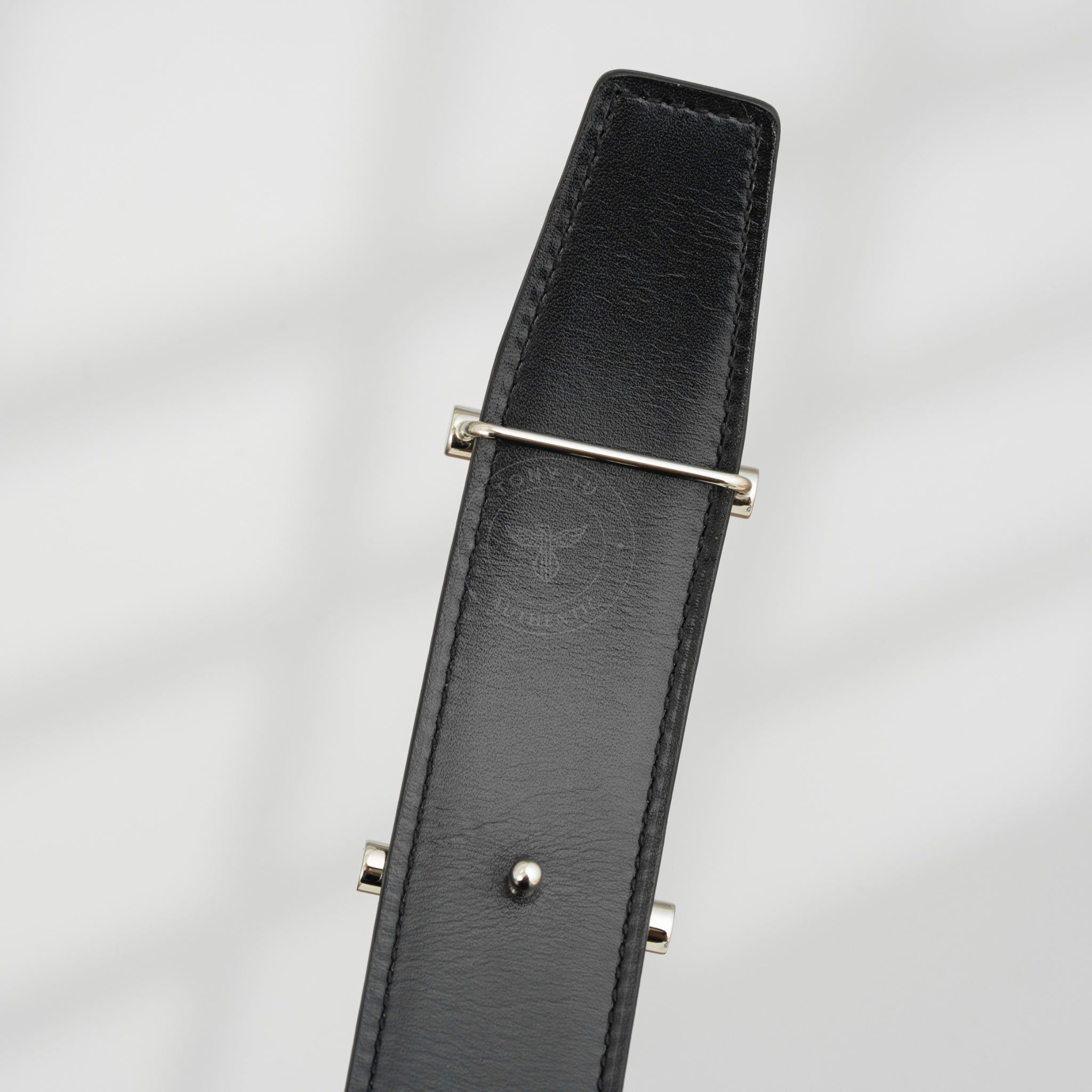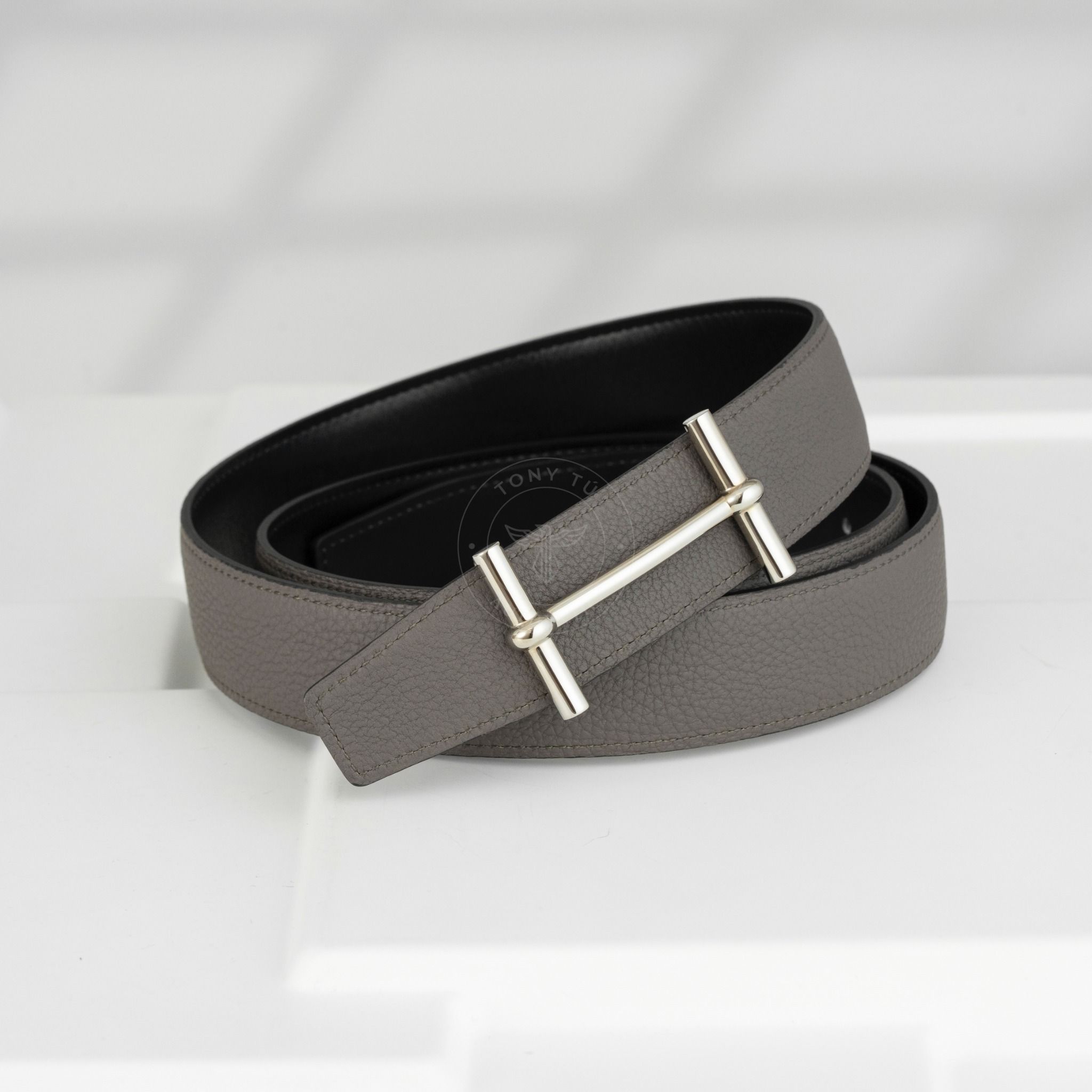 - Dây da Reversible kết hợp giữa Box Calf đen và Togo xám – hai tông màu kinh điển, dễ phối với mọi kiểu trang phục, từ suit công sở cho đến blazer dạo phố.