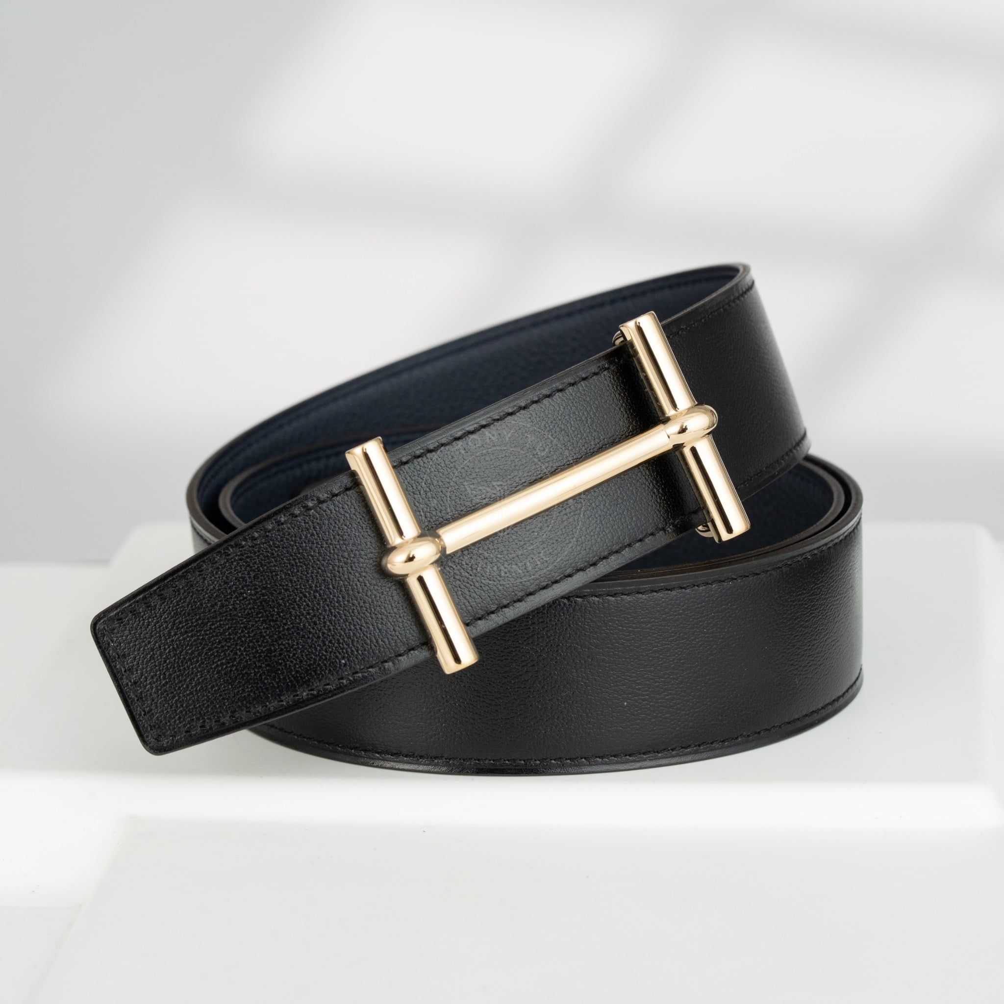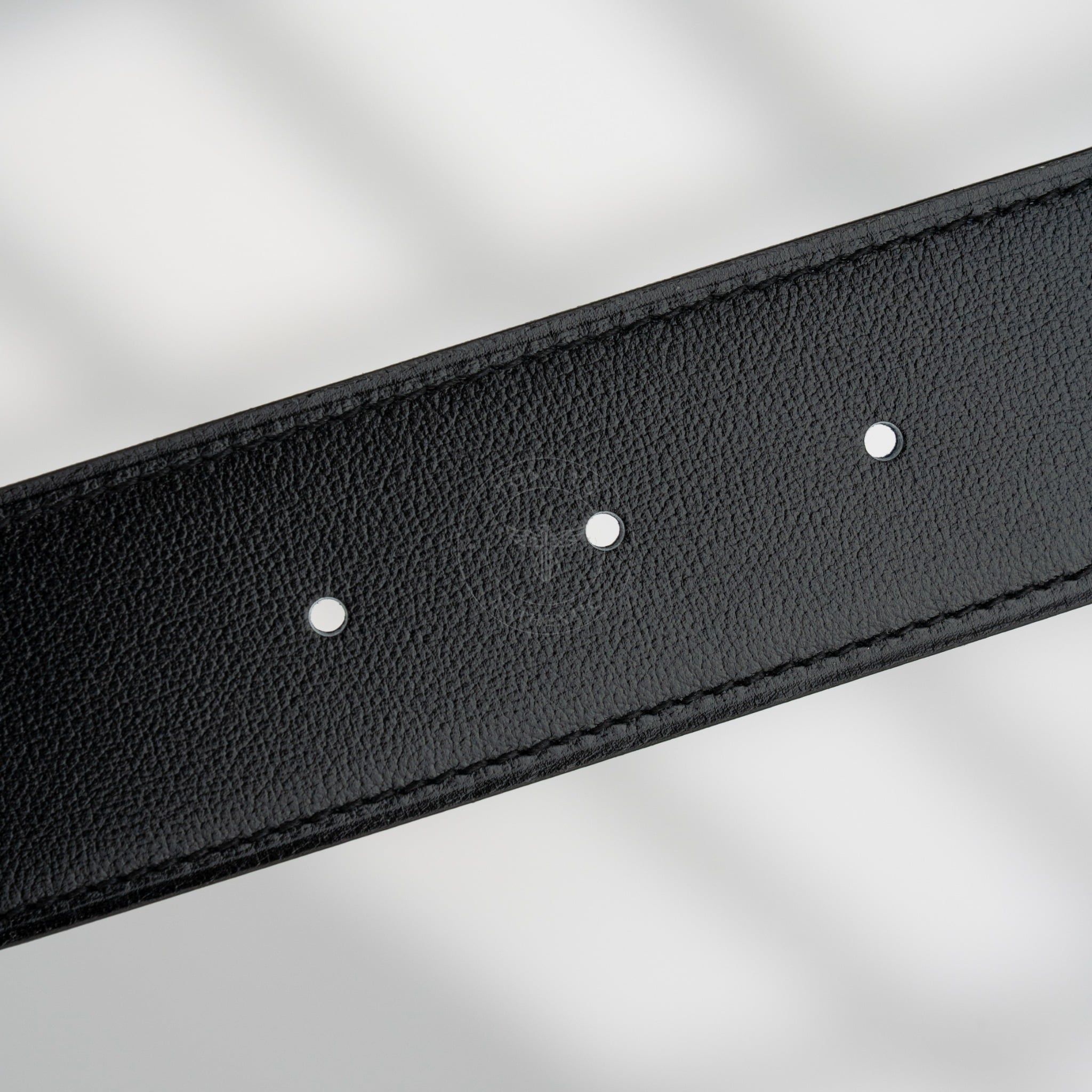 - Dây da Reversible kết hợp giữa Box Calf đen và Togo Blue Nuit – hai tông màu kinh điển, dễ phối với mọi kiểu trang phục, từ suit công sở cho đến blazer dạo phố.