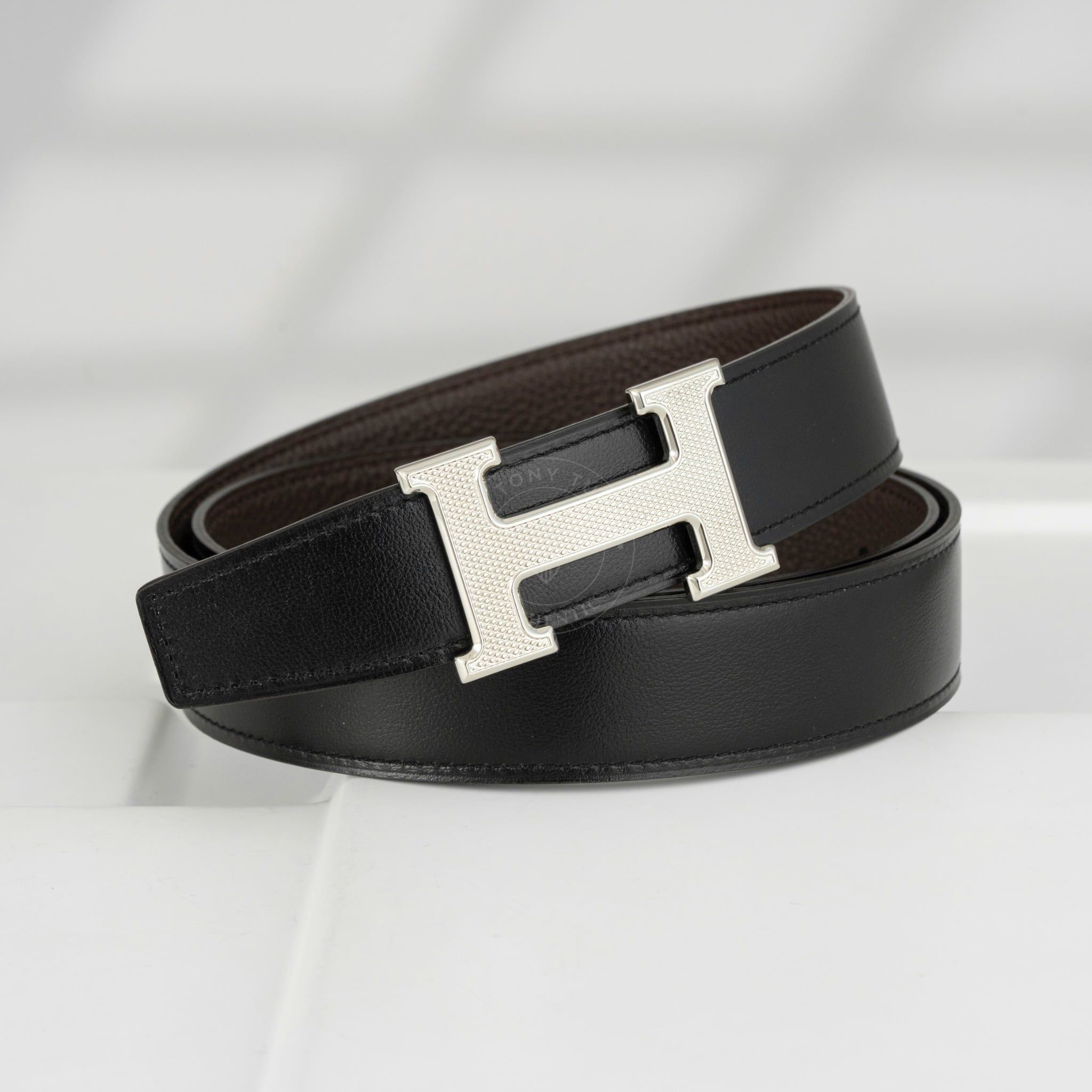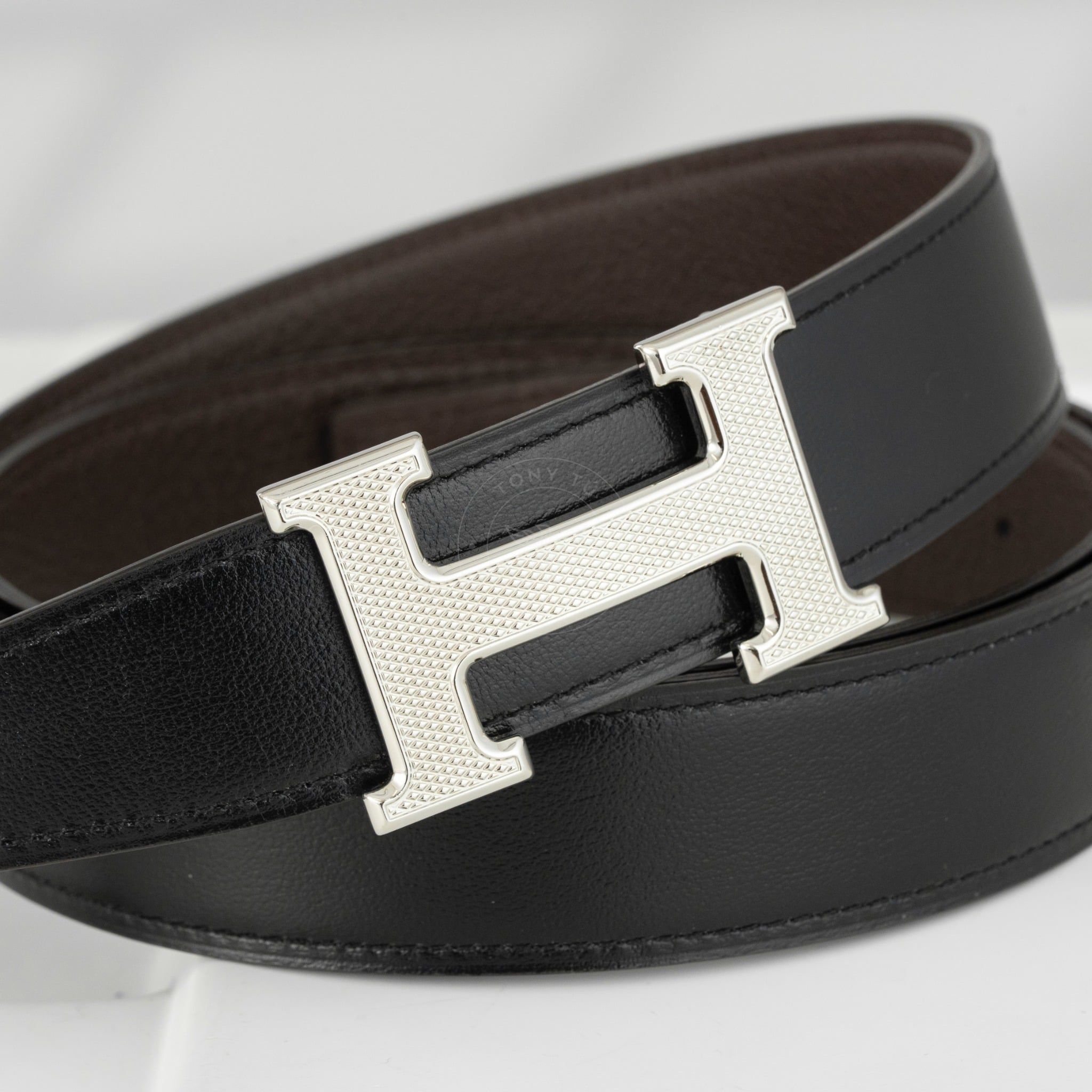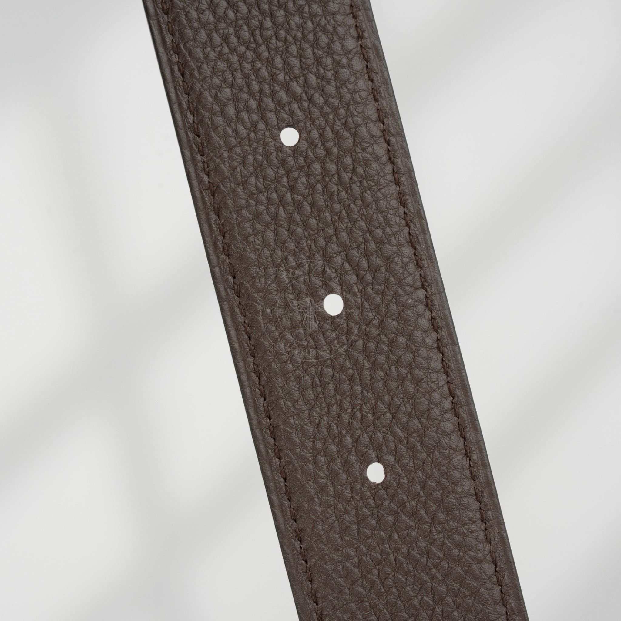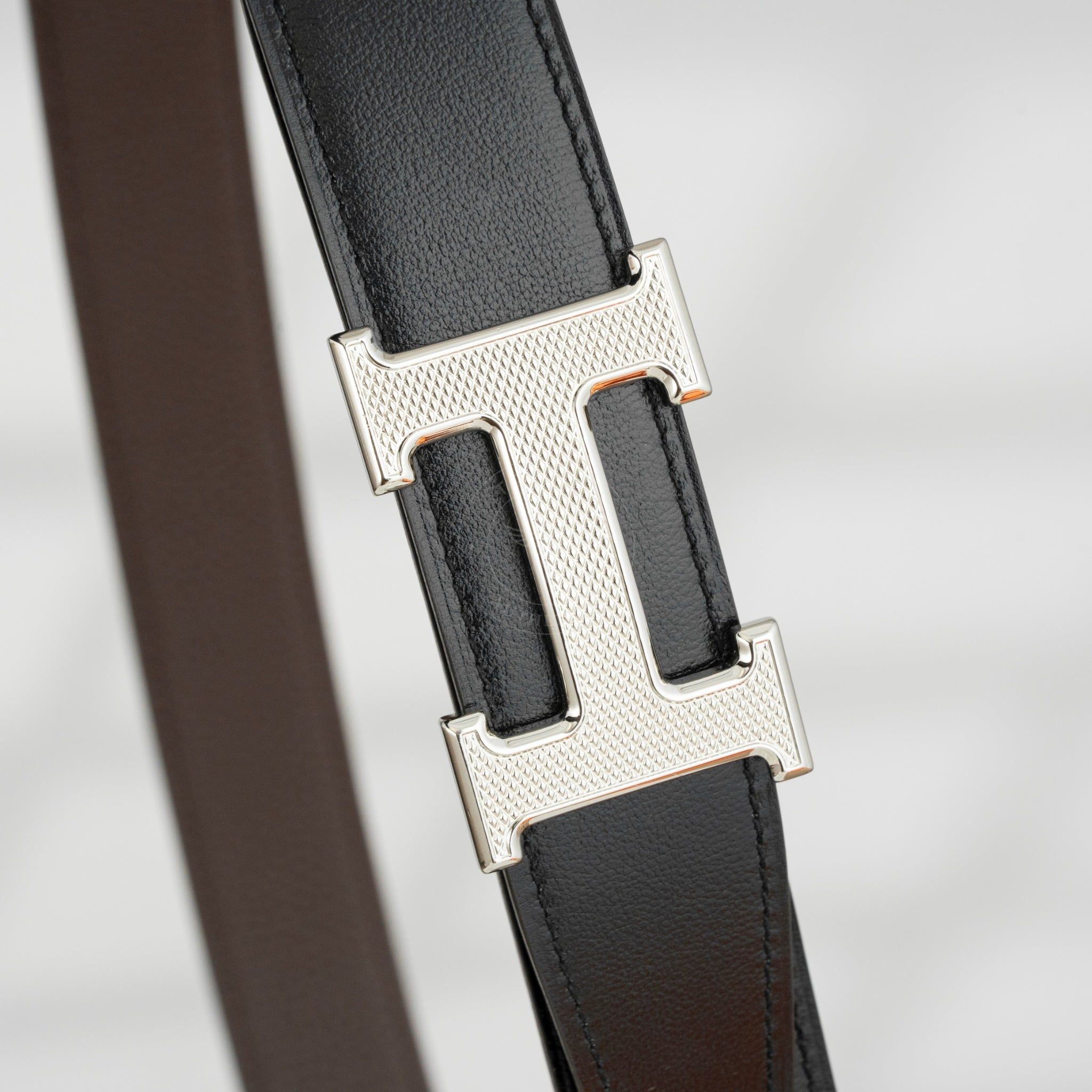 - Dây da reversible kết hợp giữa Box Calf đen và Togo nâu, hai tông màu kinh điển, dễ phối với mọi kiểu trang phục, từ suit công sở cho đến blazer dạo phố.
