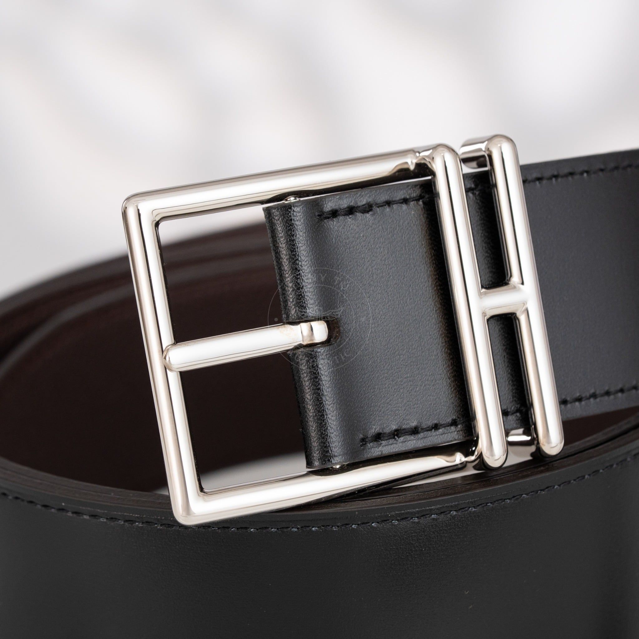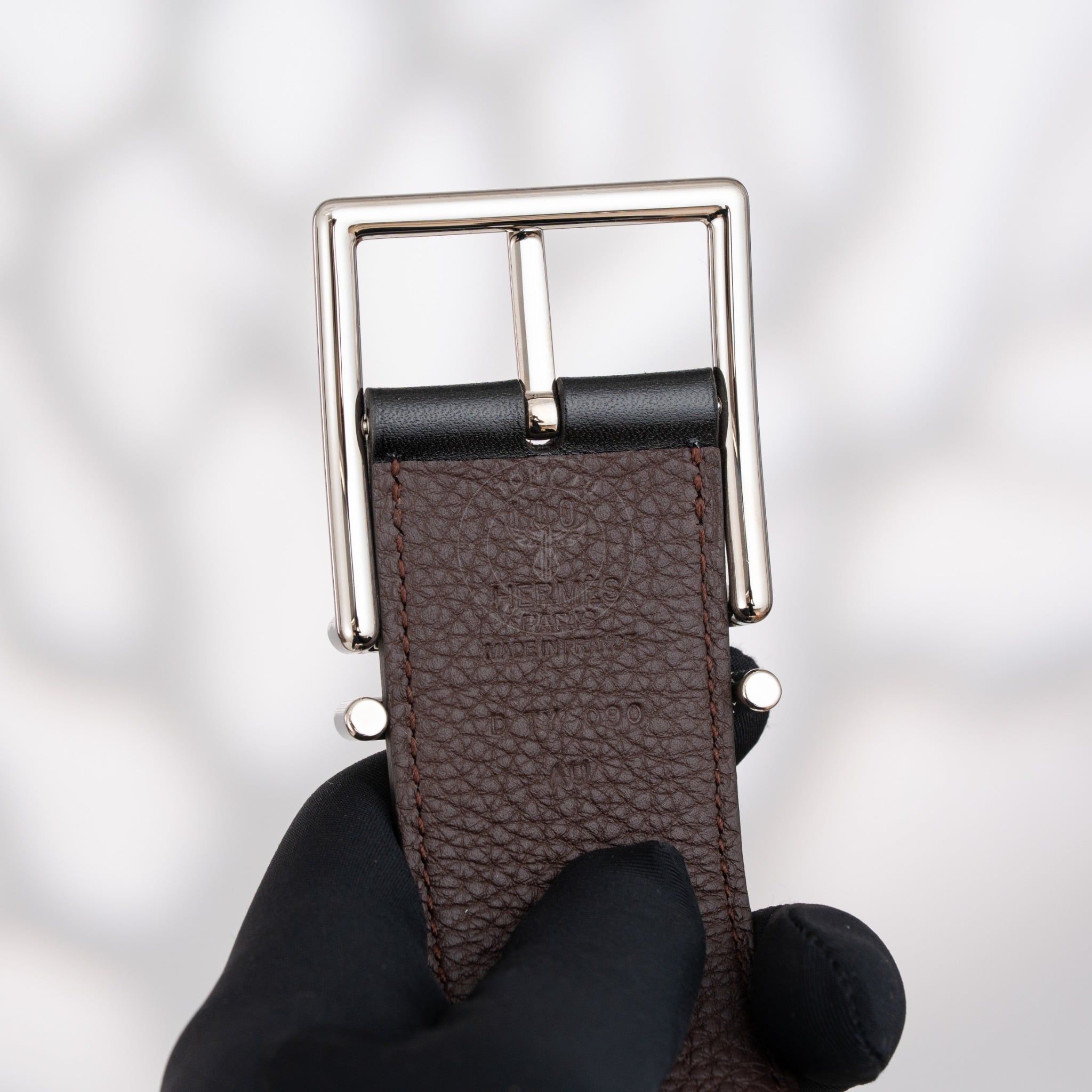 - Một mặt thắt lưng được chế tác từ da Box Calf, với bề mặt bóng nhẹ và mượt mà, mang lại cảm giác sang trọng khi chạm vào. Mặt còn lại sử dụng da Togo cao cấp của Hermès, nổi bật với vân da mềm mại và tinh tế. Thiết kế Reversible linh hoạt sử dụng 2 mặt màu Đen/Nâu giúp các anh có thể thay đổi phong cách trong nhiều hoàn cảnh.