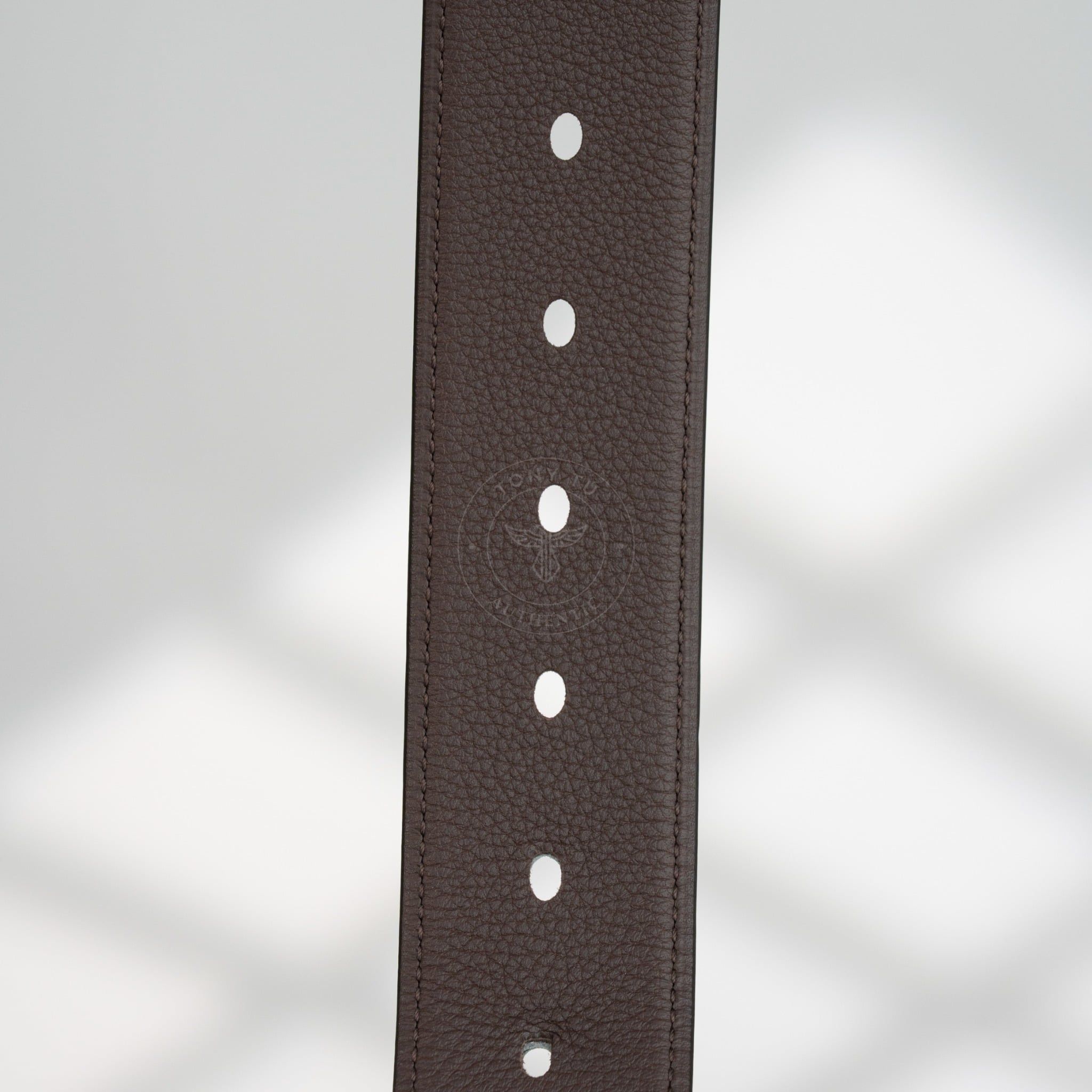 - Một mặt thắt lưng được chế tác từ da Box Calf, với bề mặt bóng nhẹ và mượt mà, mang lại cảm giác sang trọng khi chạm vào. Mặt còn lại sử dụng da Togo cao cấp của Hermès, nổi bật với vân da mềm mại và tinh tế. Thiết kế Reversible linh hoạt sử dụng 2 mặt màu Đen/Nâu giúp các anh có thể thay đổi phong cách trong nhiều hoàn cảnh.