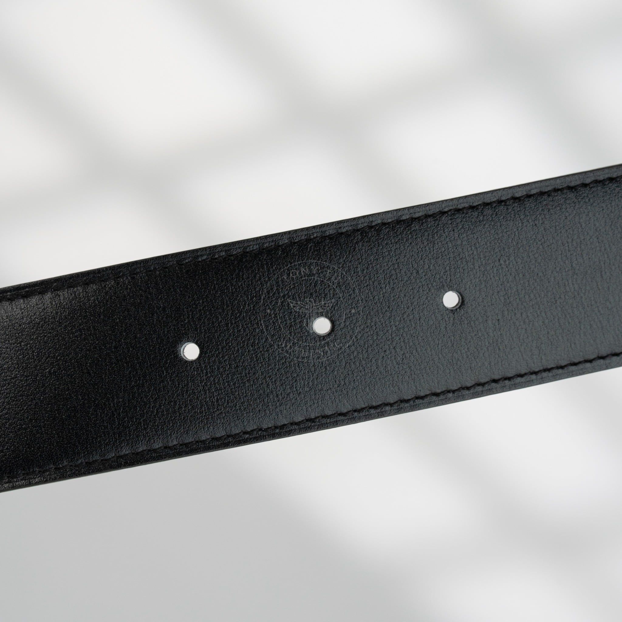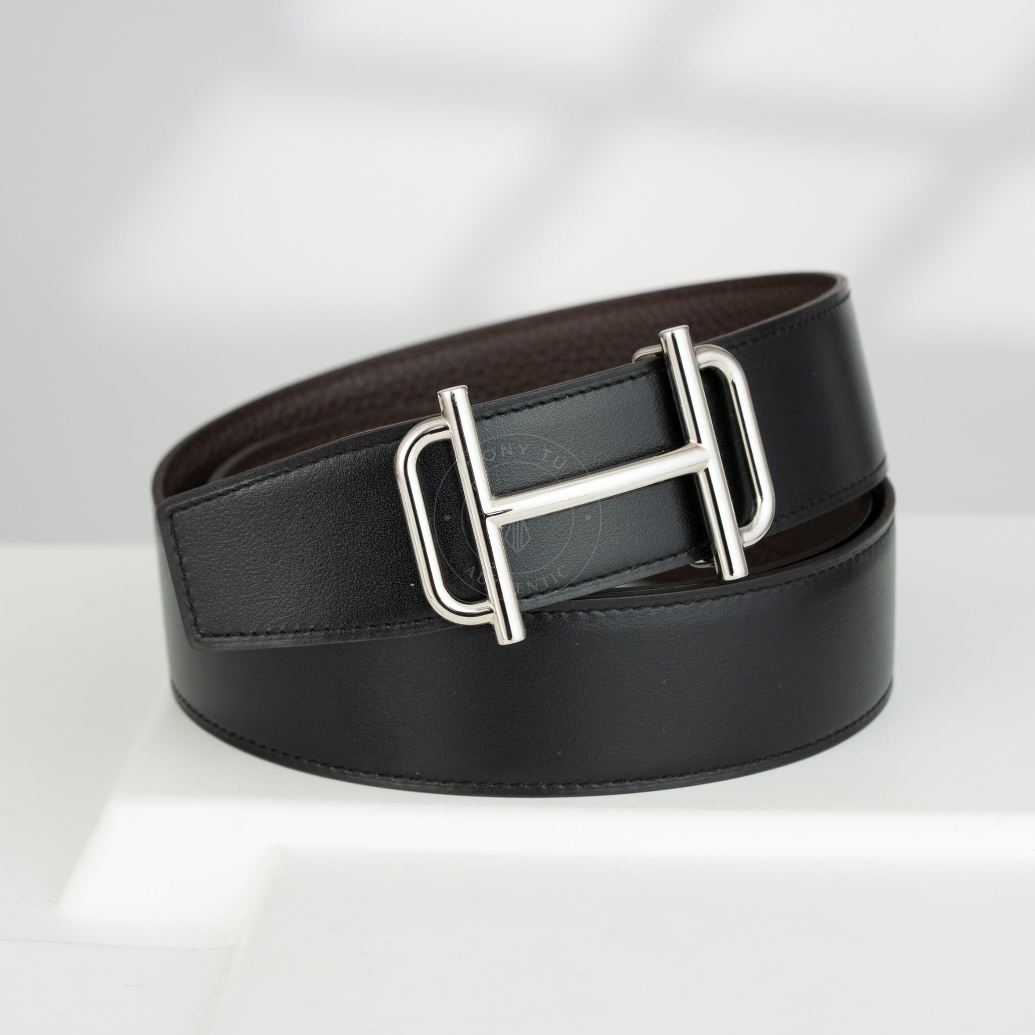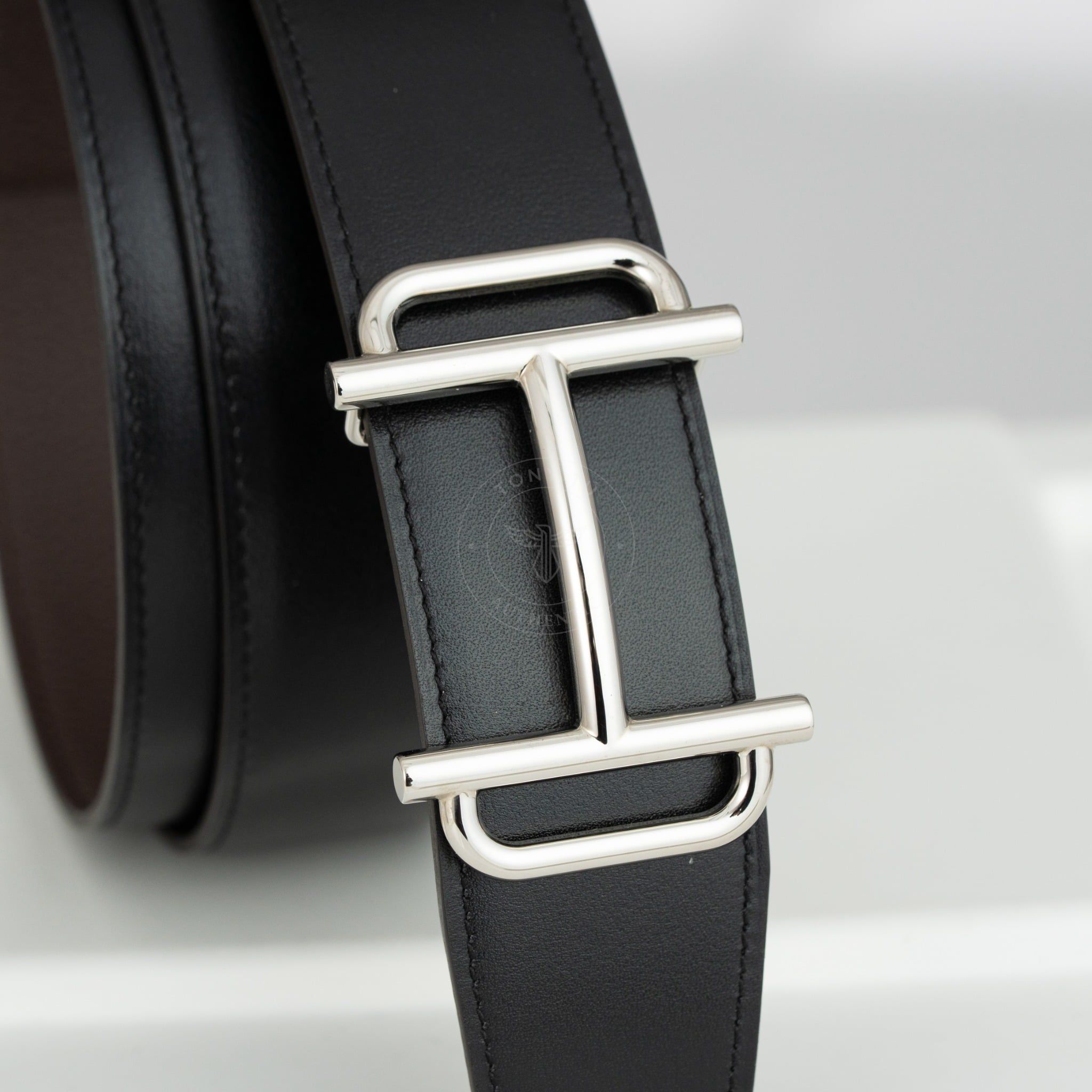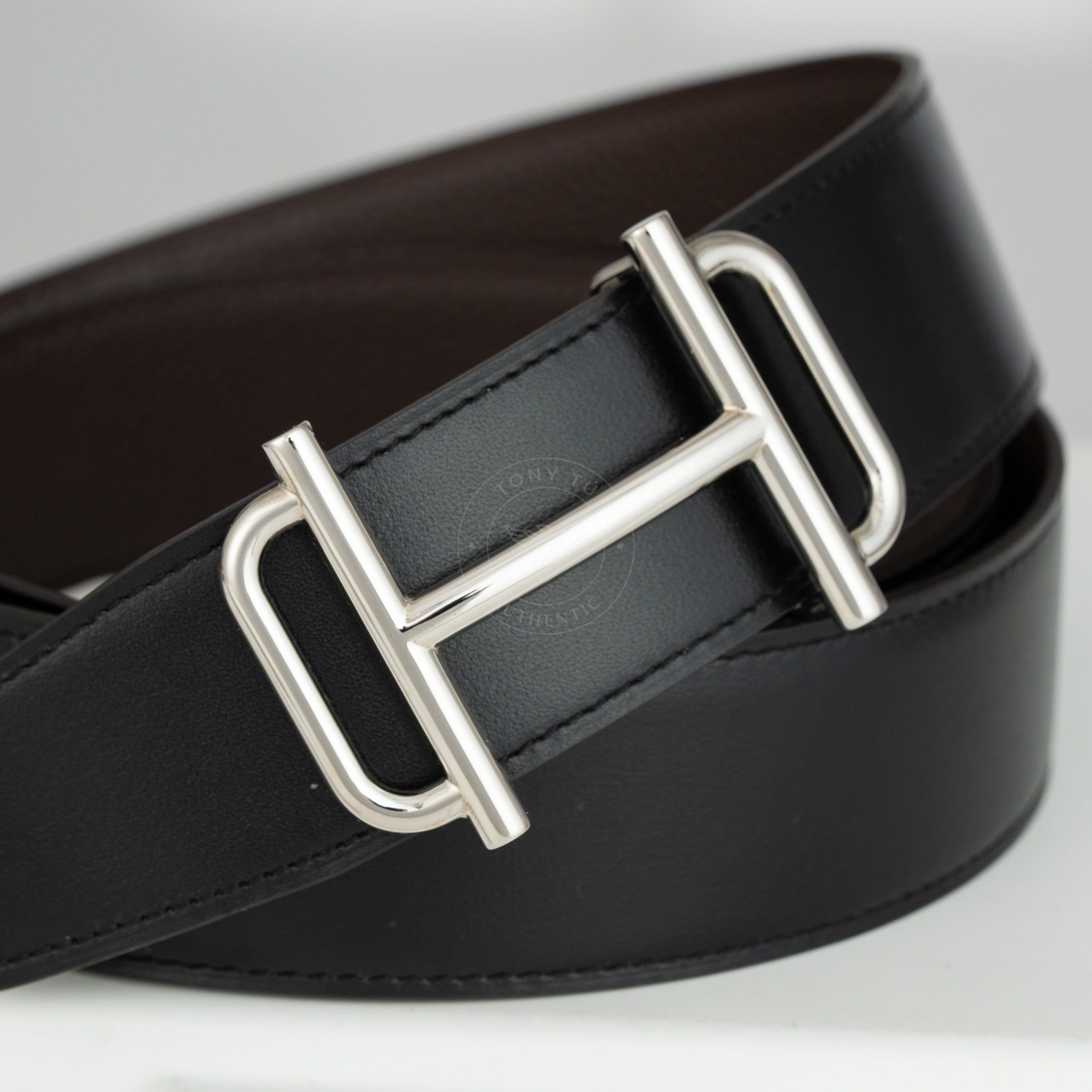 - Dây da reversible kết hợp giữa Box Calf đen và Togo nâu – hai tông màu kinh điển, dễ phối với mọi kiểu trang phục, từ suit công sở cho đến blazer dạo phố.