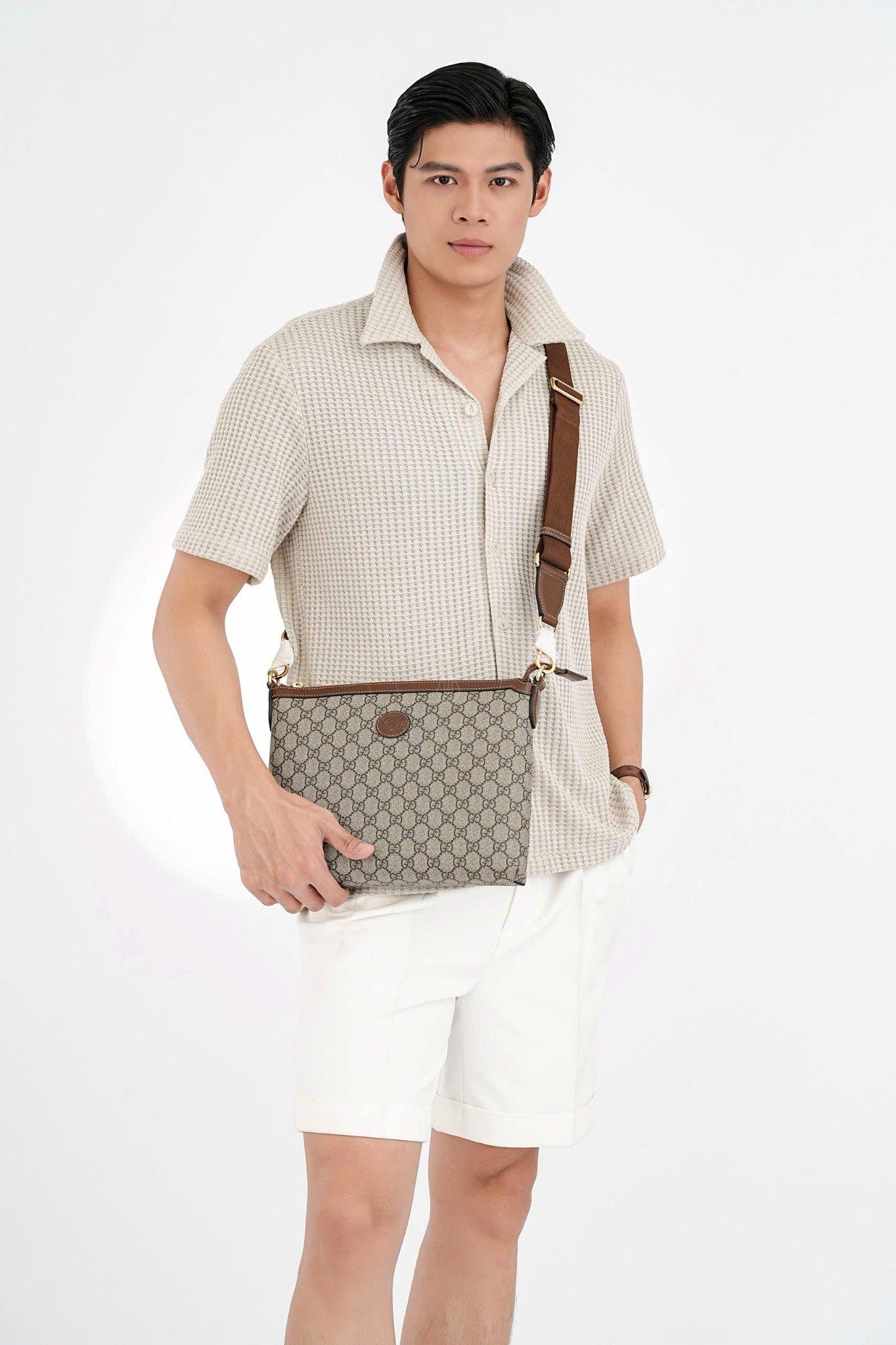 - Đây là mẫu túi ngang Gucci, mang trên mình chính là họa tiết họa tiết Signature “GG” Supreme kinh điển. Điển hình với sự phối hợp thường thấy giữa màu nâu và be, đậm chất giá trị cốt lõi của Gucci.