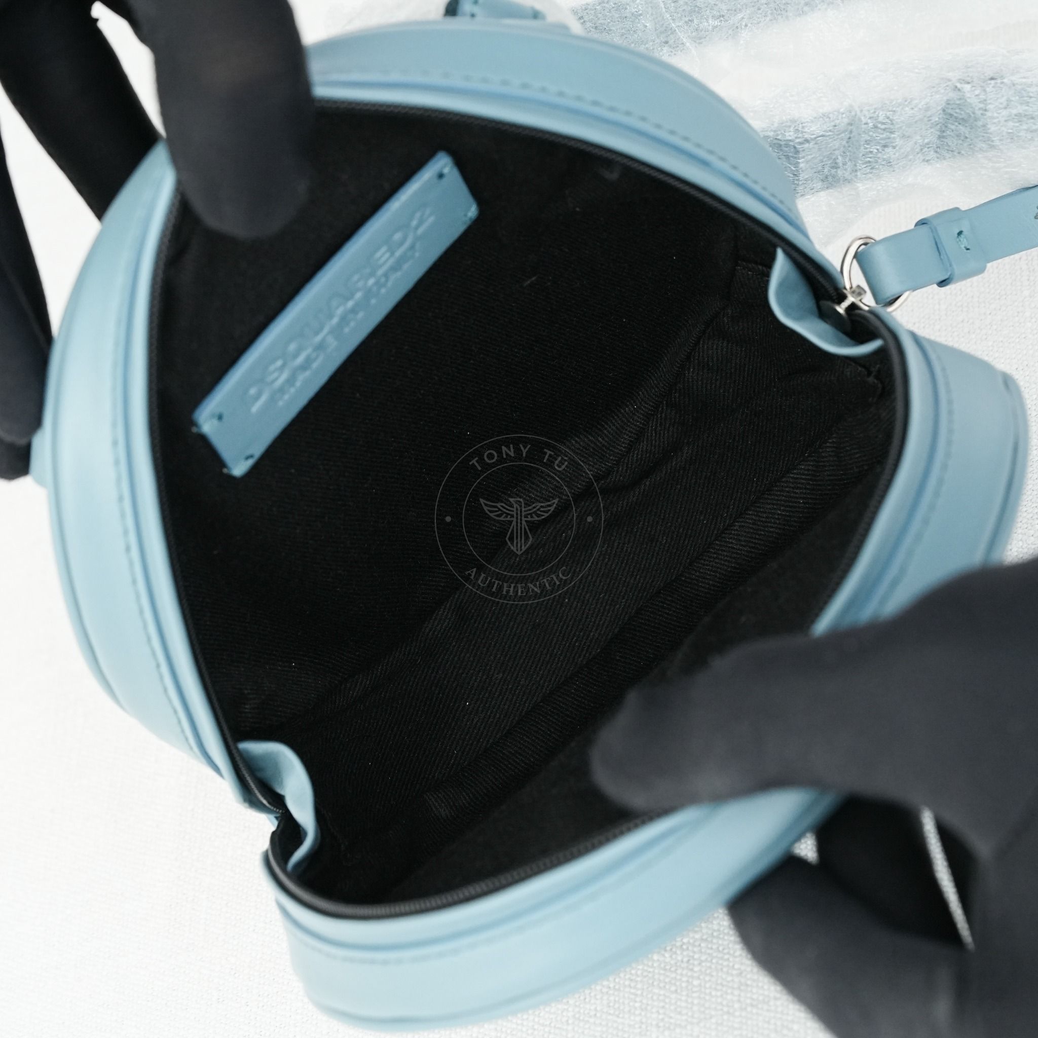 - Túi gồm 1 ngăn chứa duy nhất dáng tròn, cùng dây đeo có thể tháo rời. Chế tác từ 100% chất da bê mềm mịn Dsquared2, mang tới cảm giác mượt mà thướt tha mỗi khi chạm