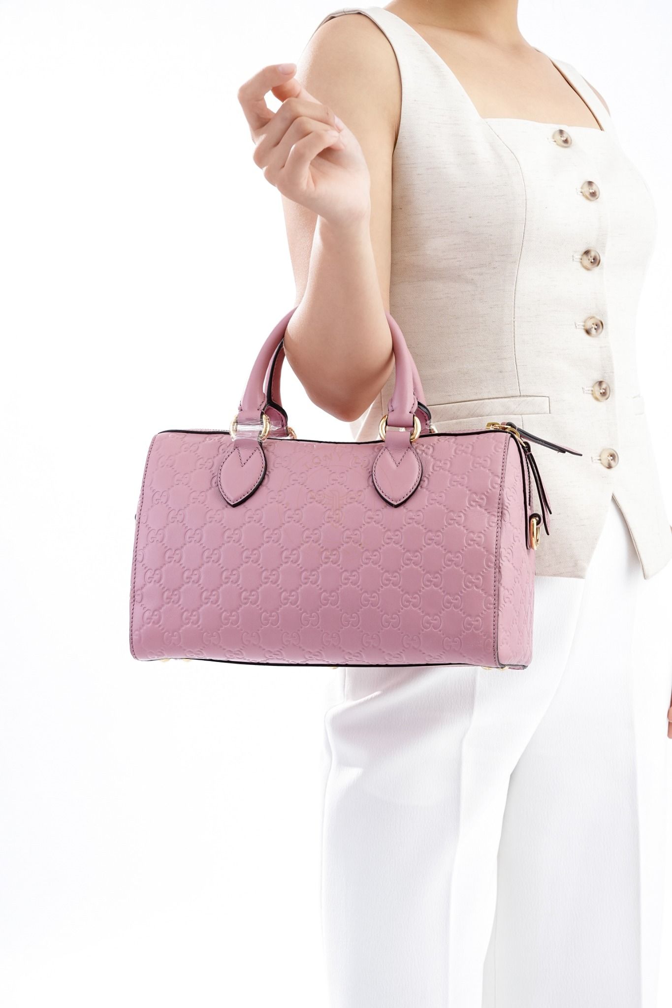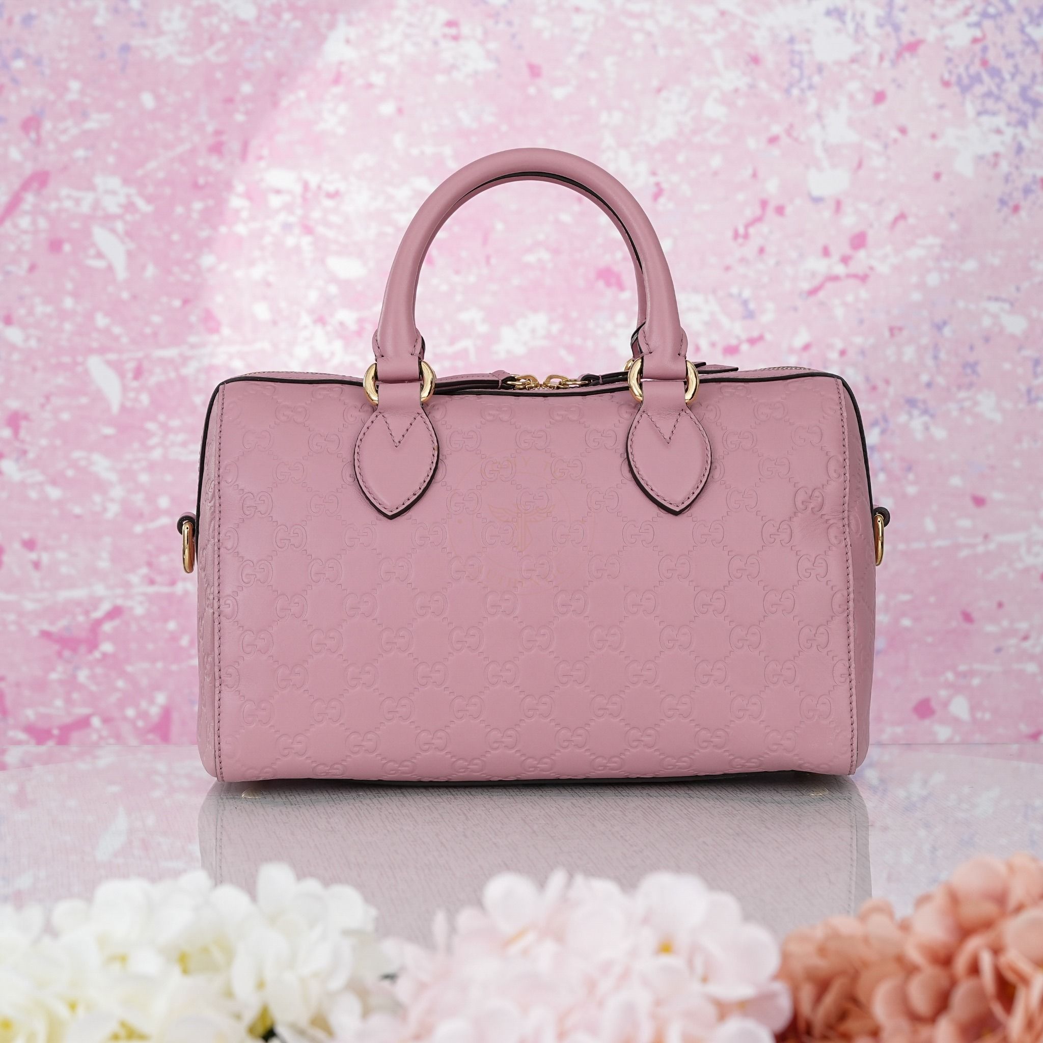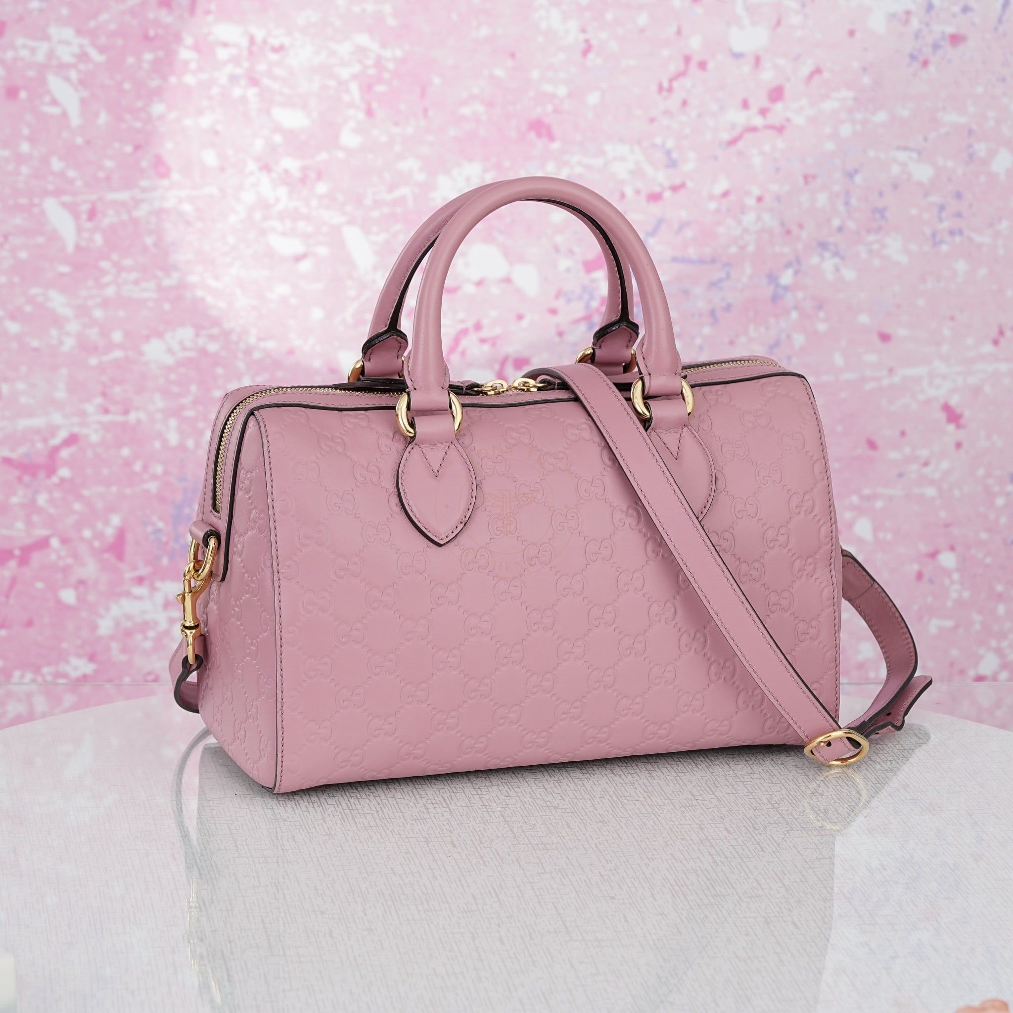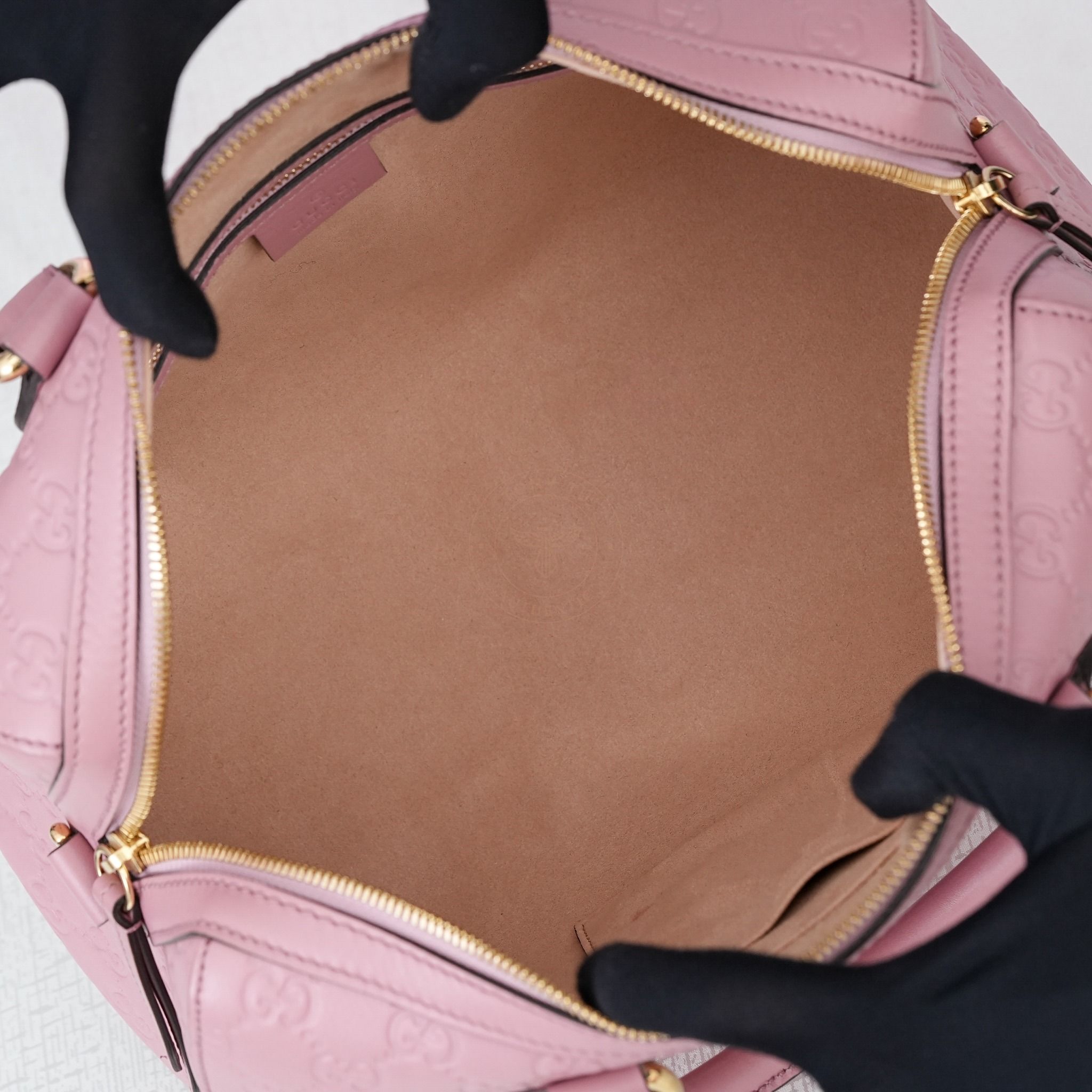 - Hoạ tiết Guccissima dập chìm trên nền da bê hồng tinh tế cực kỳ hút mắt, đảm bảo chủ nhân luôn nổi bật mỗi khi xách hoặc đeo.