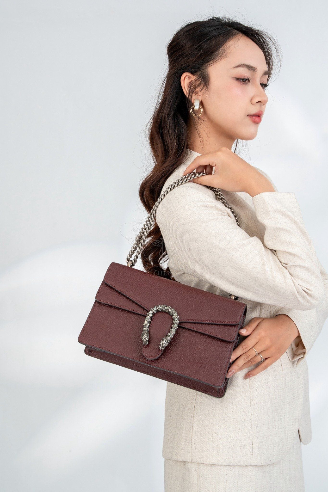 - Phần khoá antique silver uốn cong hình đầu hổ đôi – chi tiết vừa dữ dội, vừa trau chuốt. Đi kèm màu burgundy đỏ rượu – sâu, dày, và có chiều – tạo nên tổng thể bí ẩn, cực kỳ lôi cuốn.