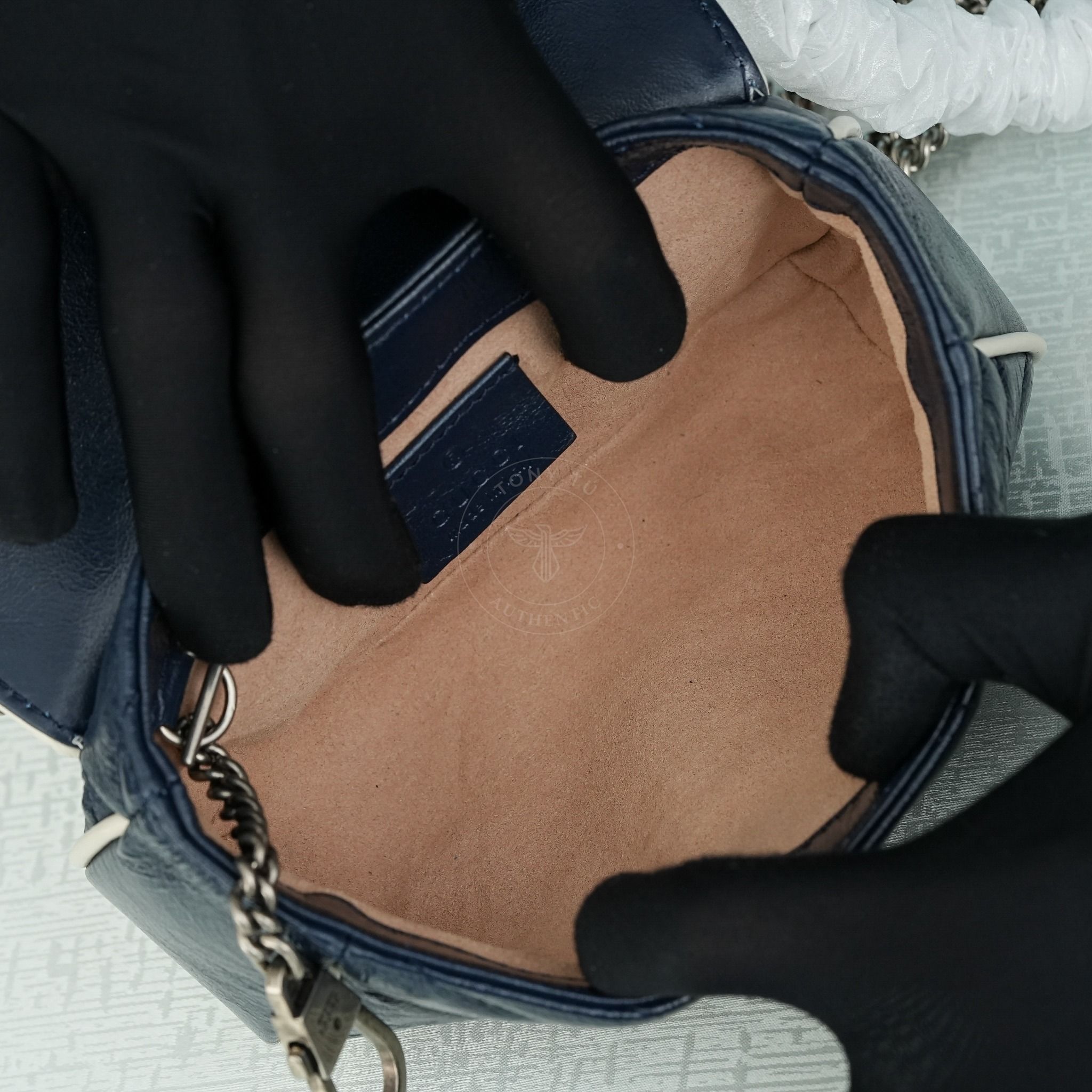 - Tông Xanh Navy bao phủ trên toàn bộ sản phẩm, kết hợp với đường viền trắng và mặt Logo ánh bạc GG điển hình của dòng túi Gucci Marmont tạo điểm nhấn hoàn hảo.
