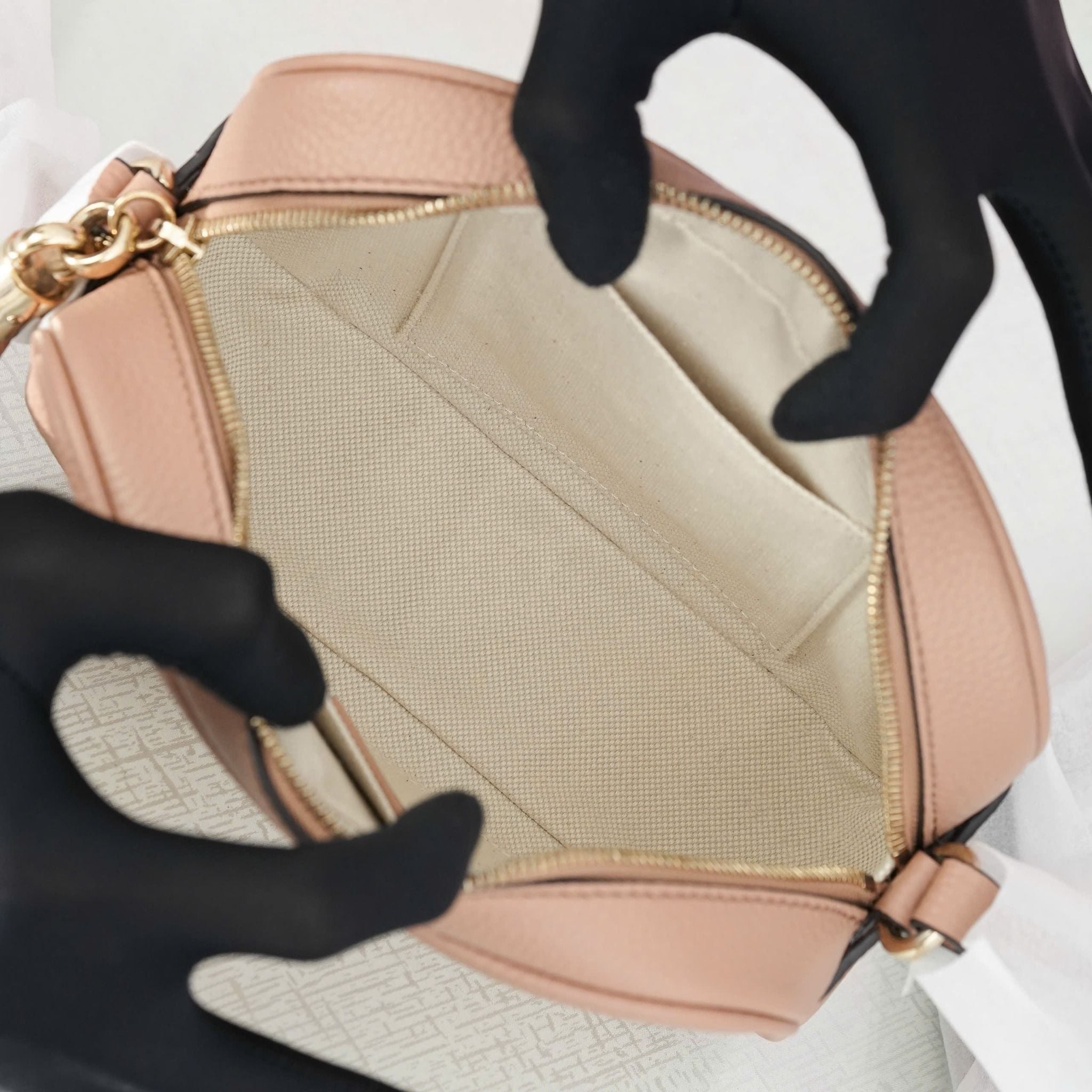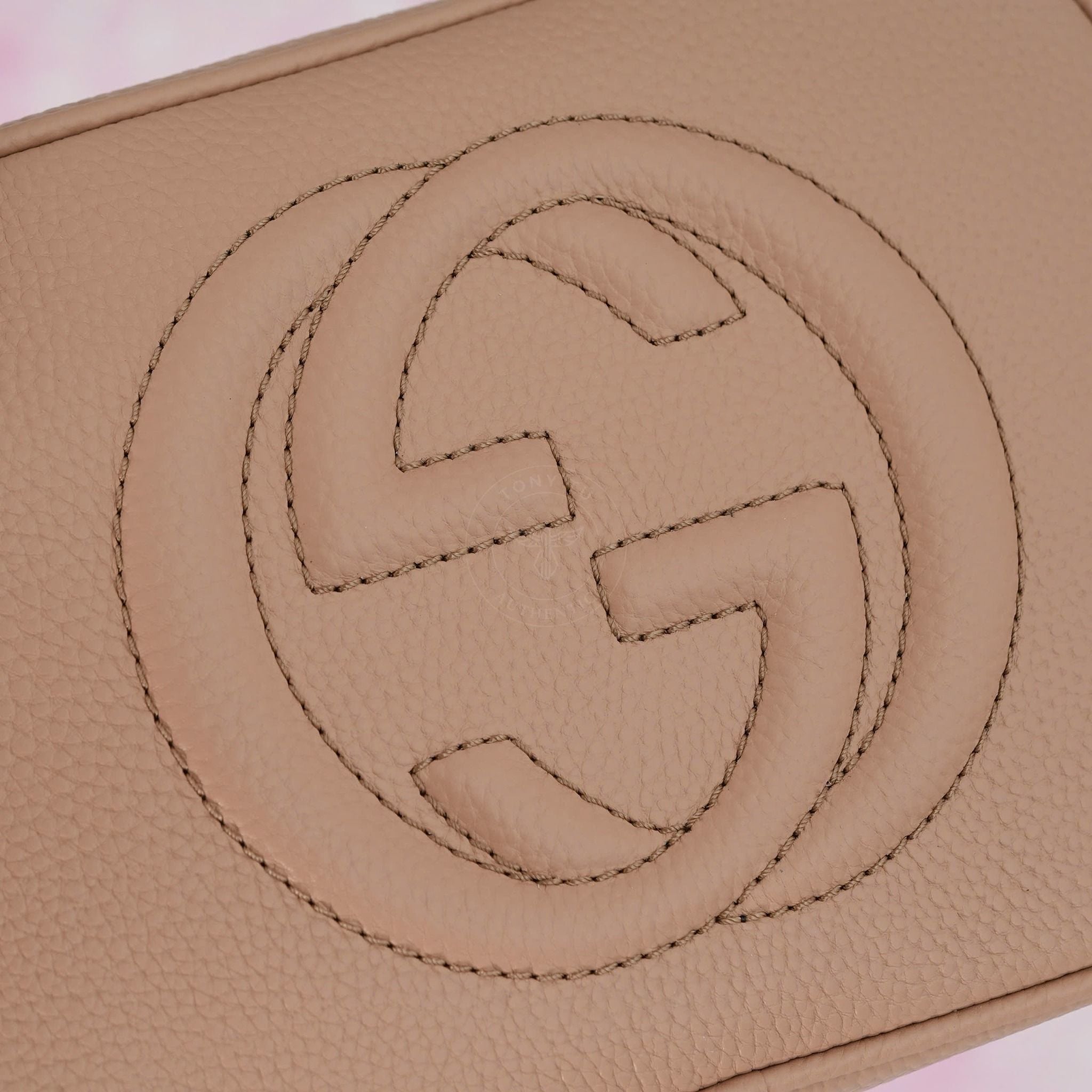 - Họa tiết GG khâu nổi trên nền da màu Nude, tạo nên một cảm giác tinh tế và duyên dáng.