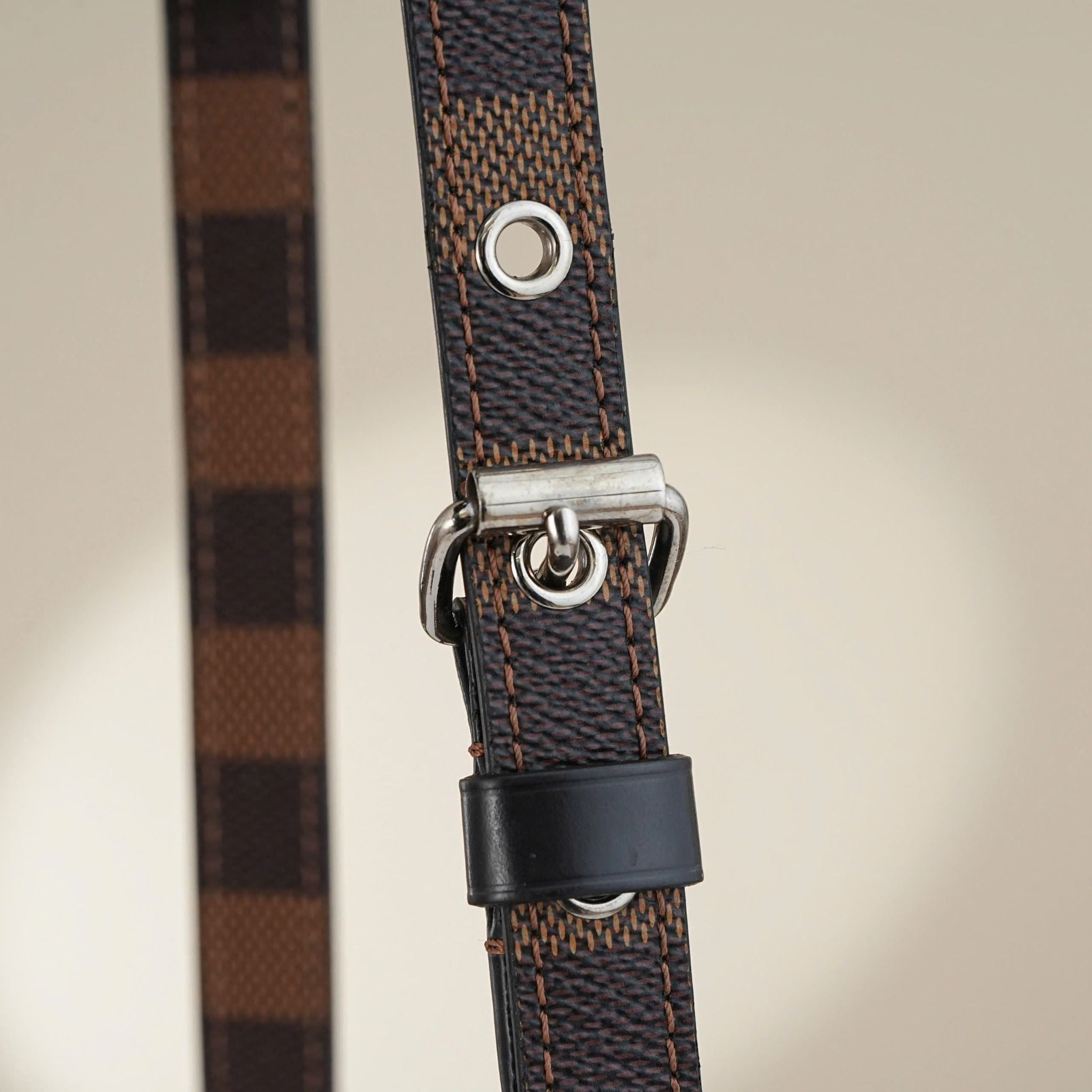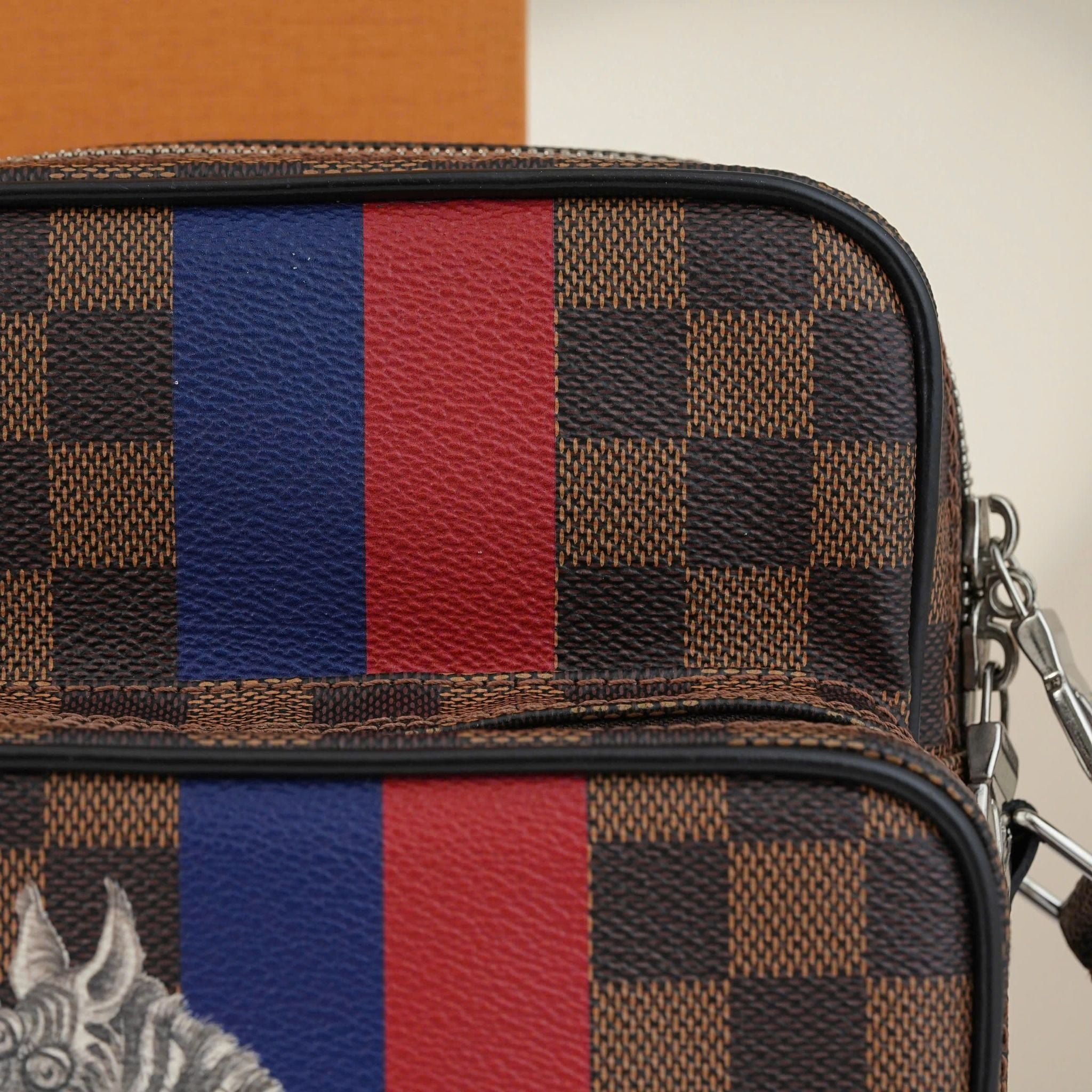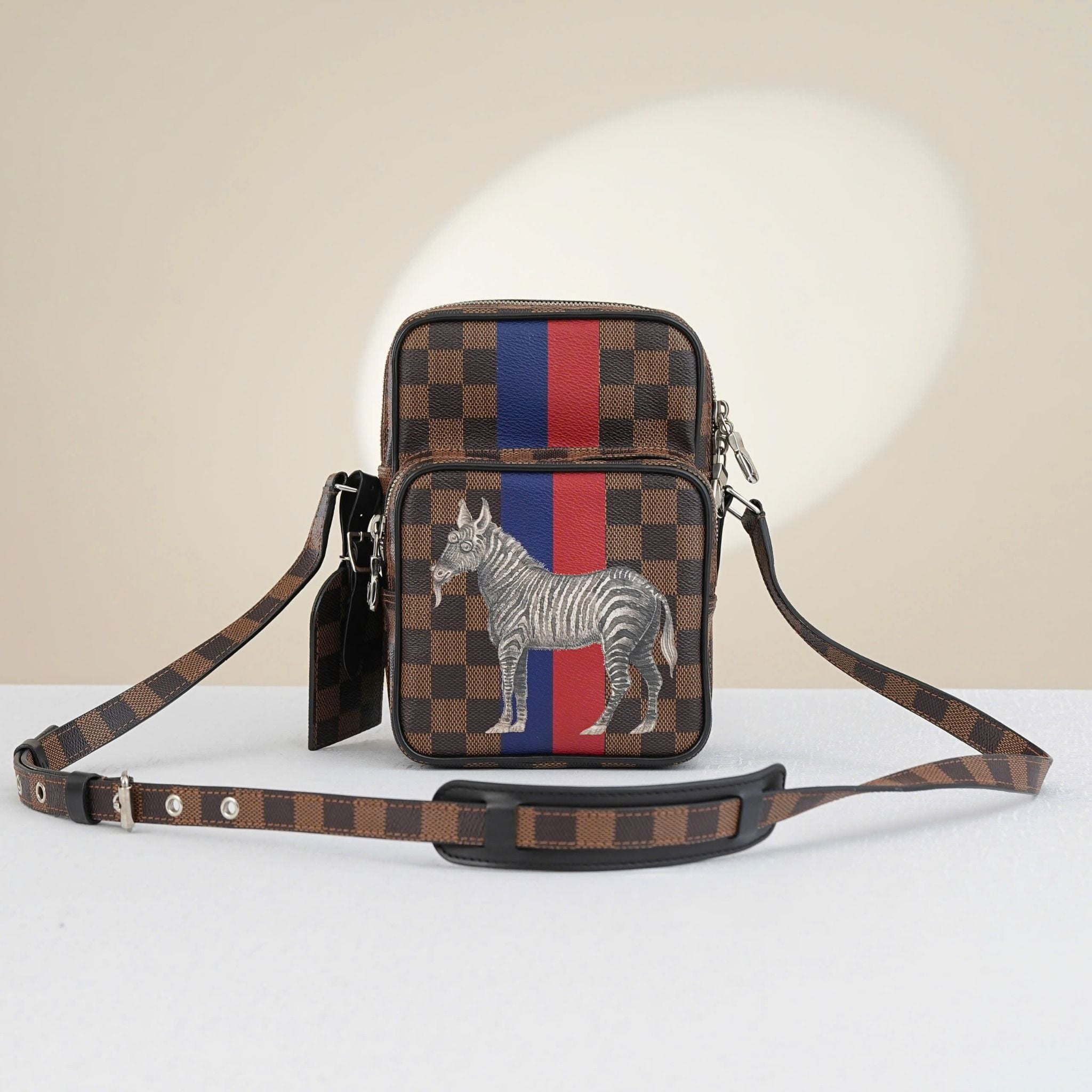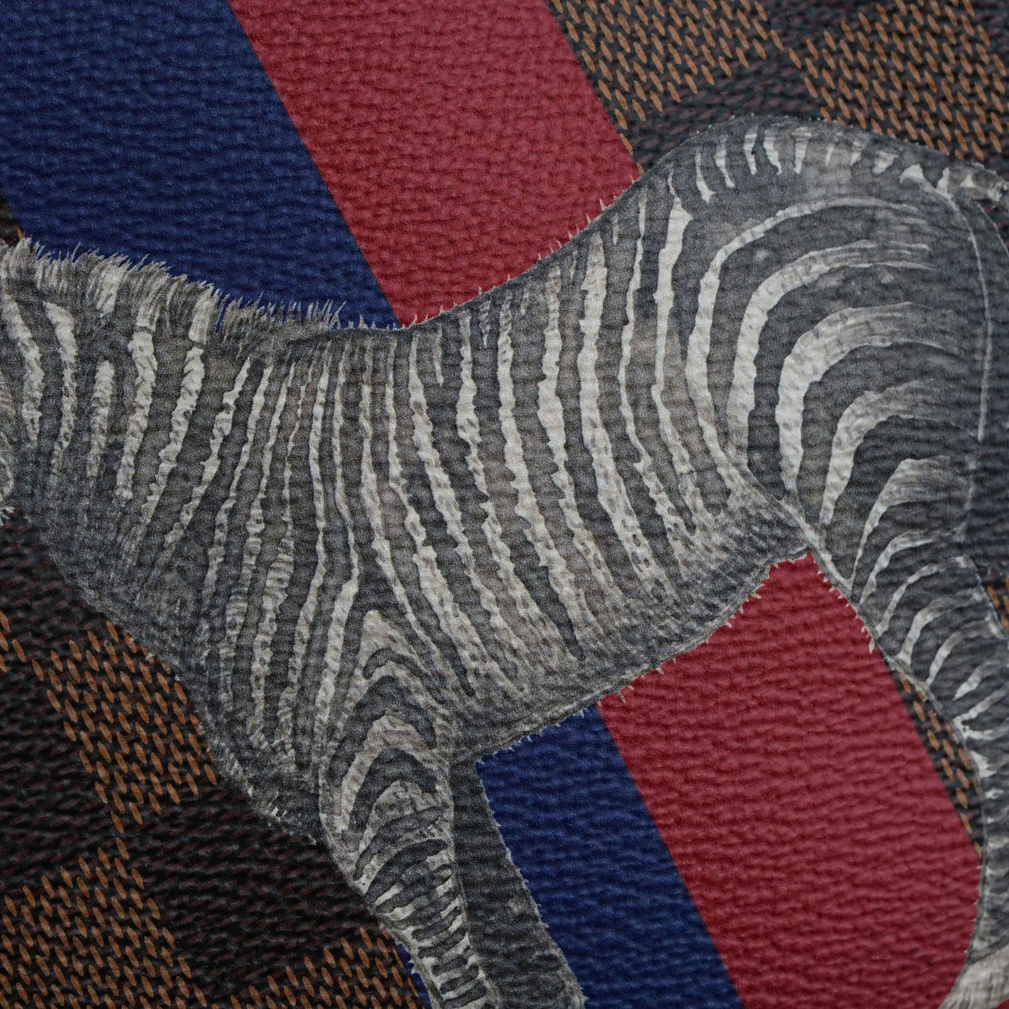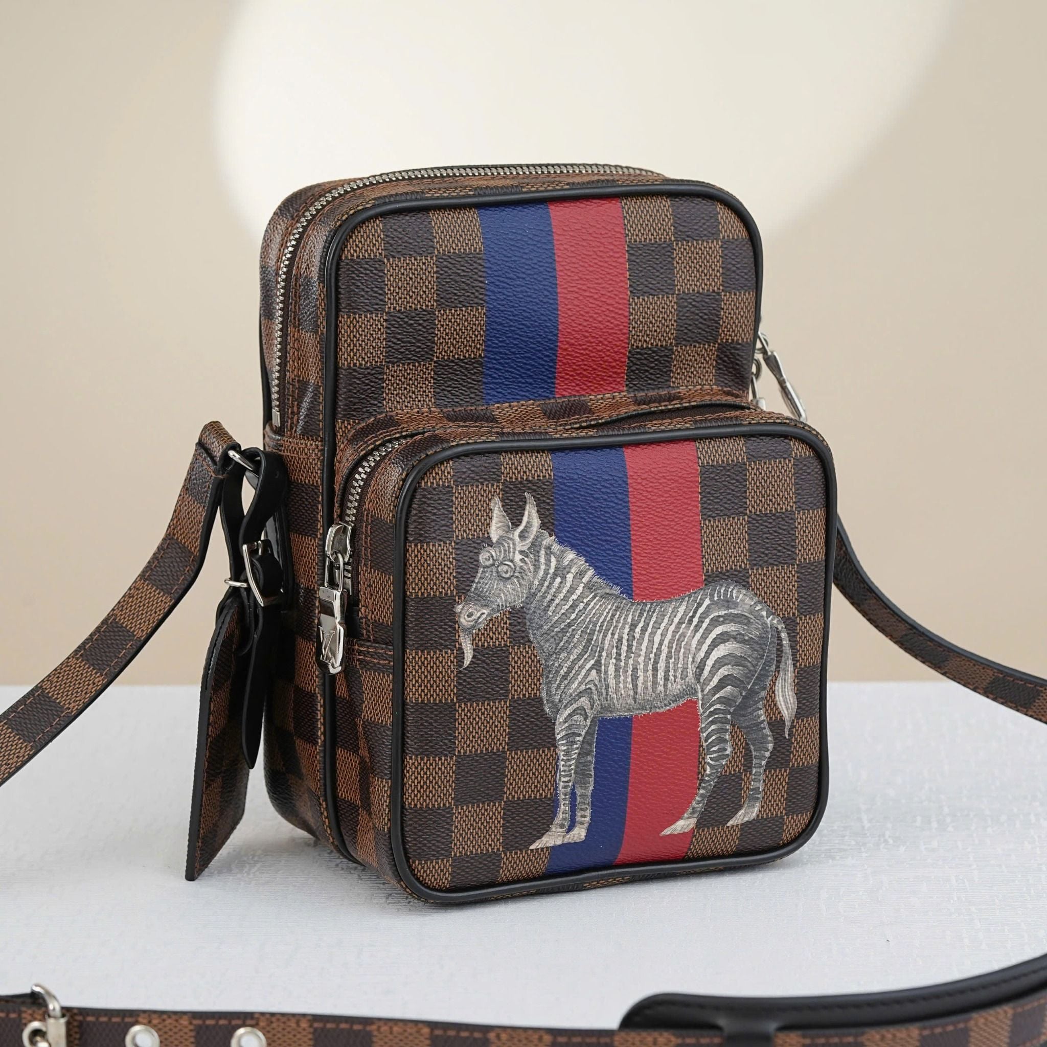 - Tông màu nâu đặc trưng của Damier Ebene kết hợp với sọc xanh đỏ tạo nên một phong cách vừa trẻ trung vừa năng động, cùng với đó là hình ảnh sáng tạo của chú ngựa vằn.