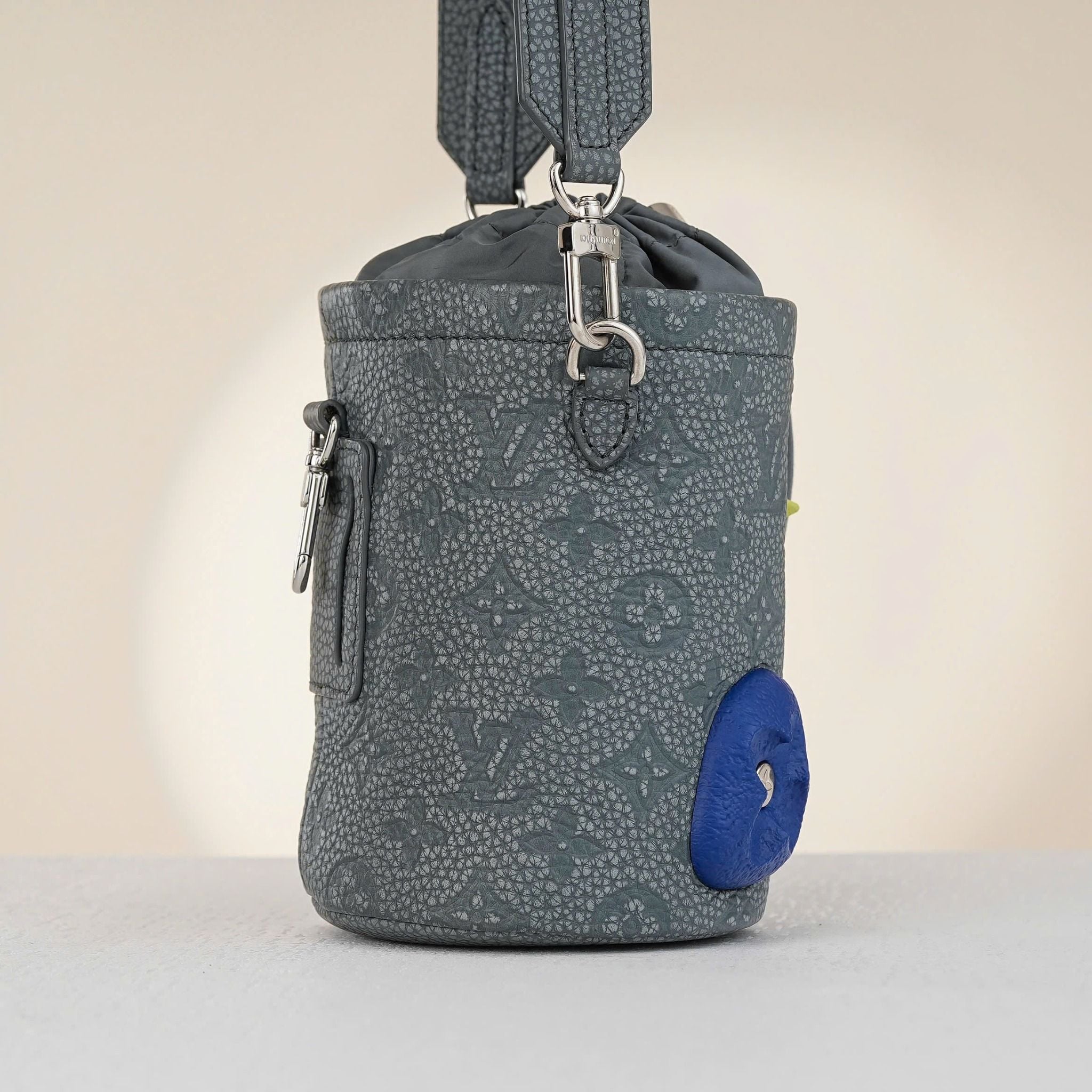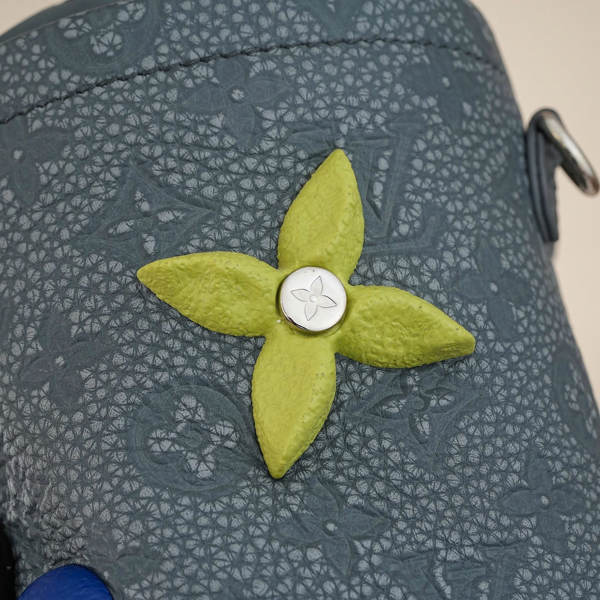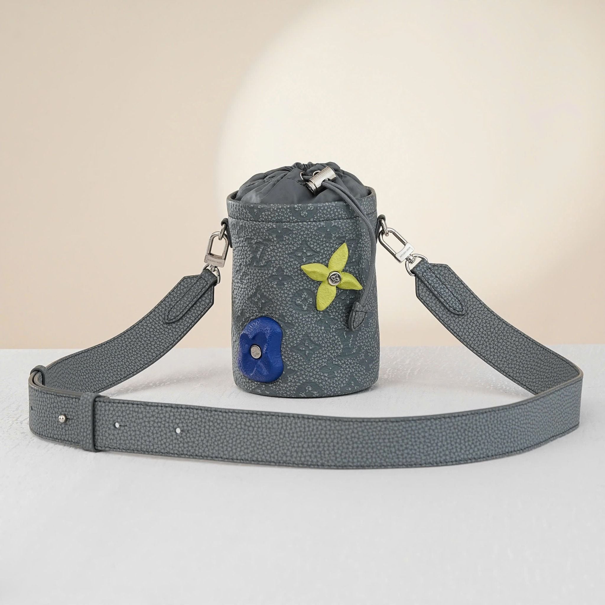 - Stone-gray Monogram Shadow with vibrant floral accents in blue, complemented by polished silver hardware for a distinctive, luxurious look.