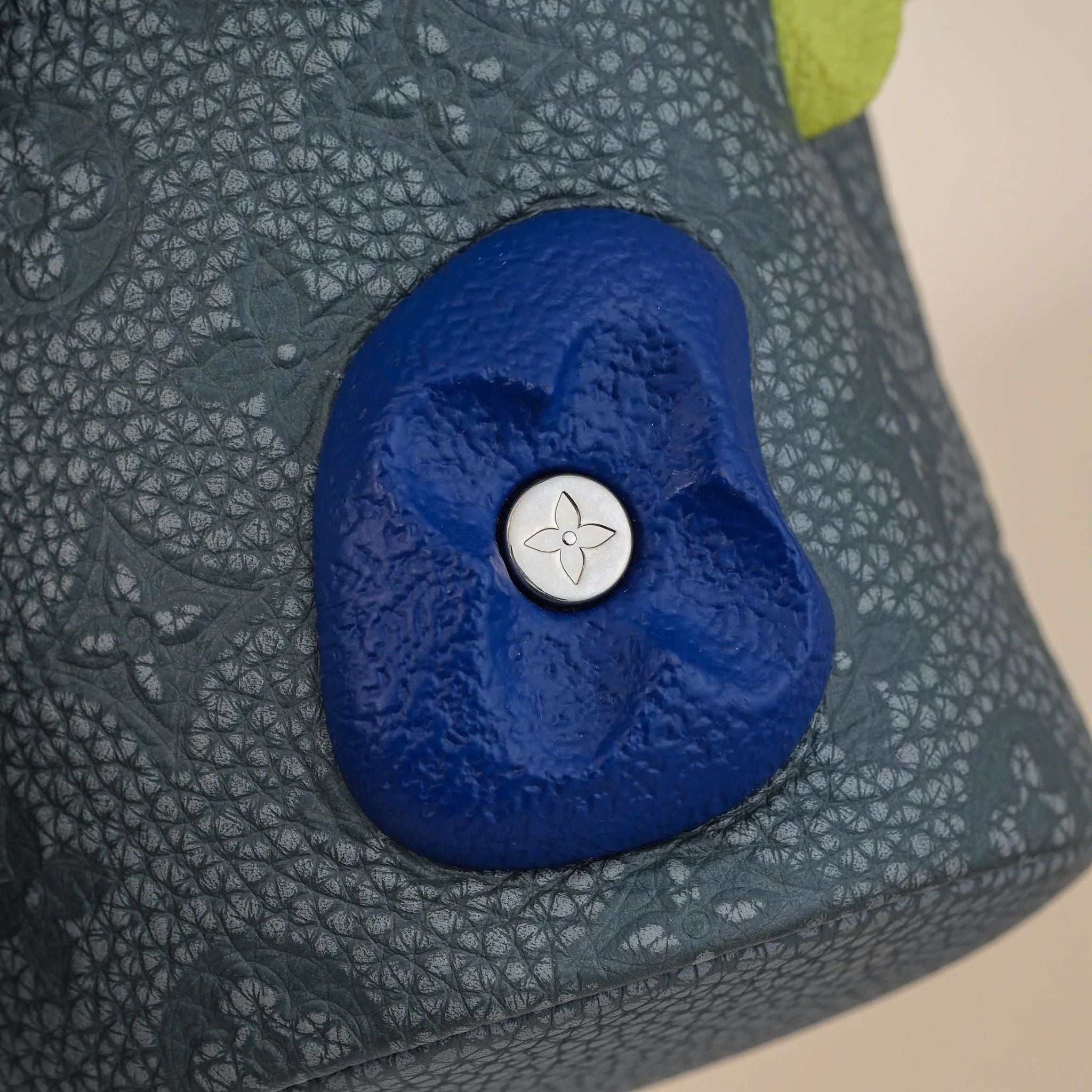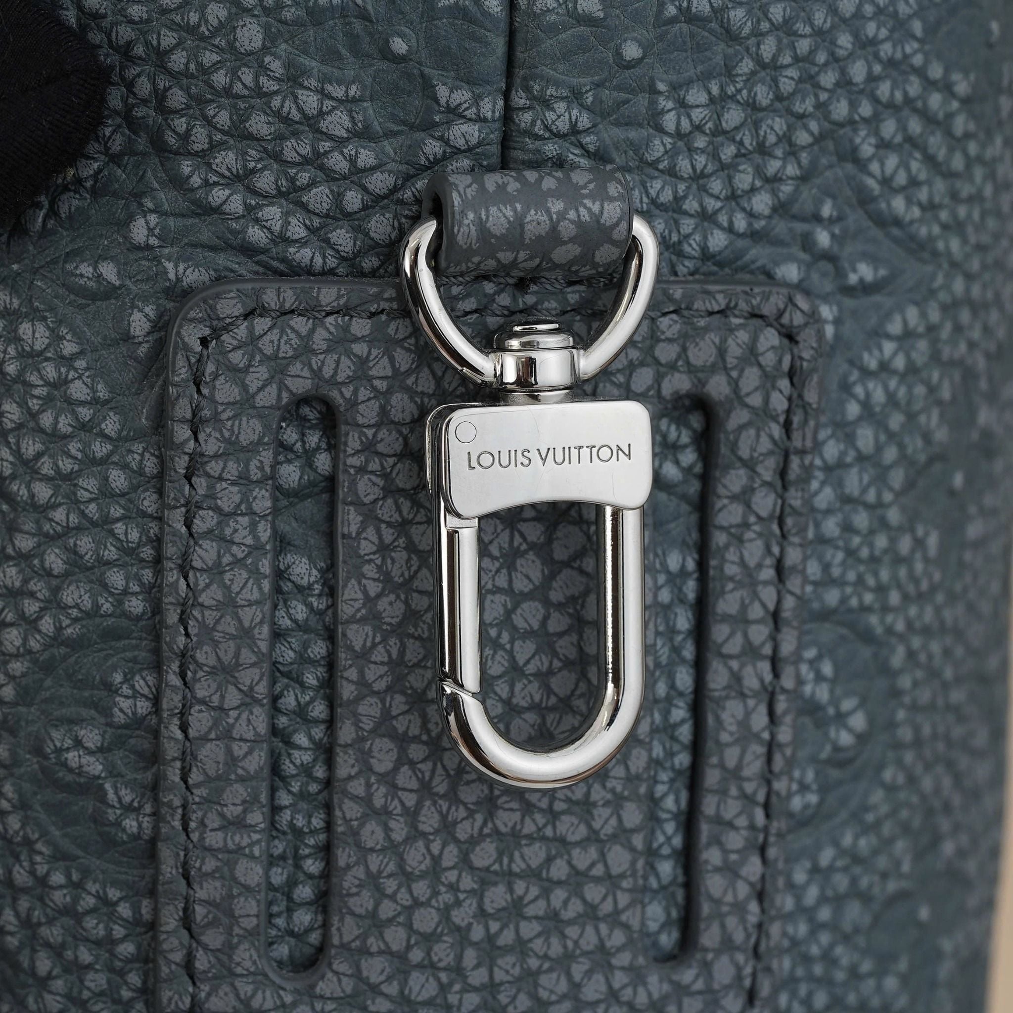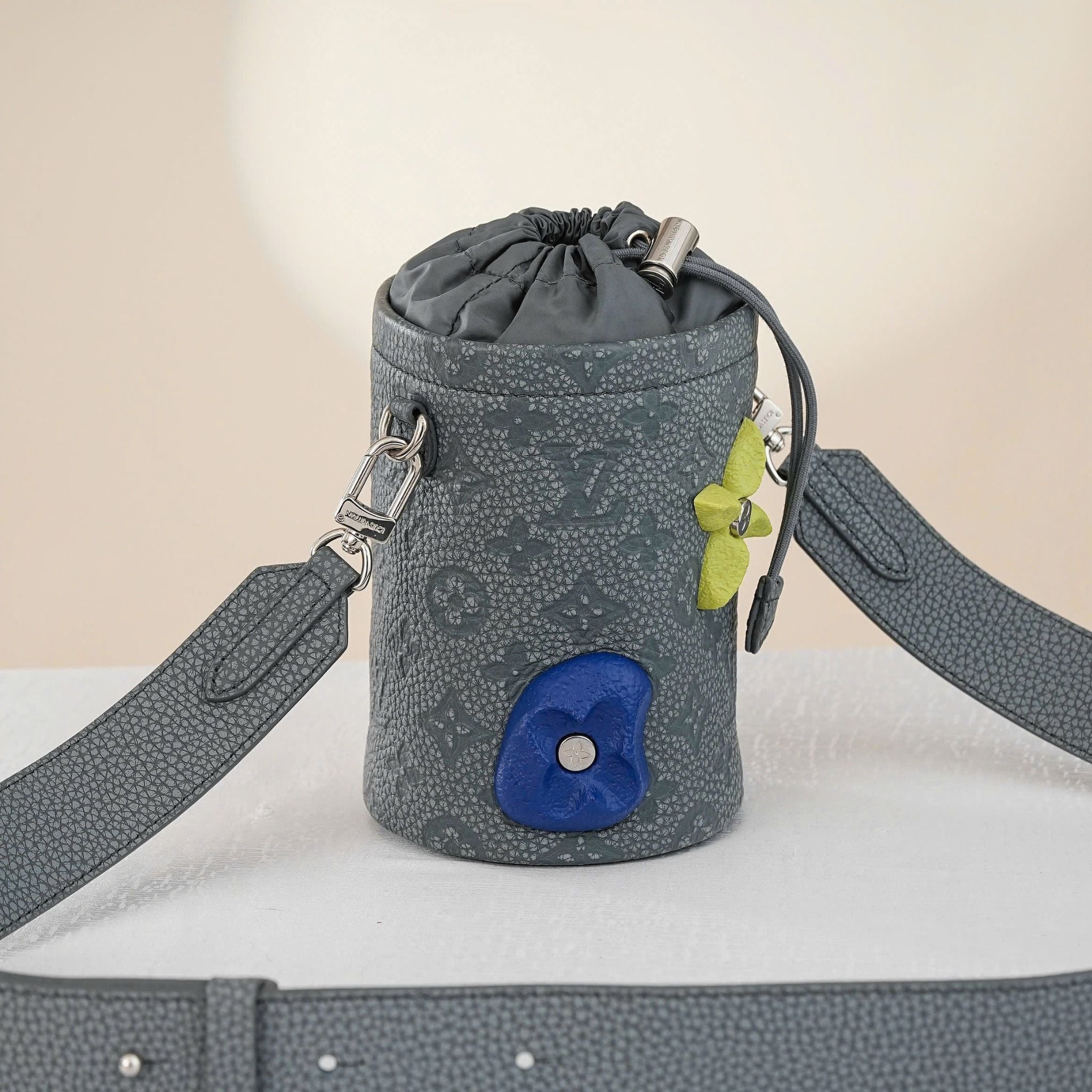 - Stone-gray Monogram Shadow with vibrant floral accents in blue, complemented by polished silver hardware for a distinctive, luxurious look.