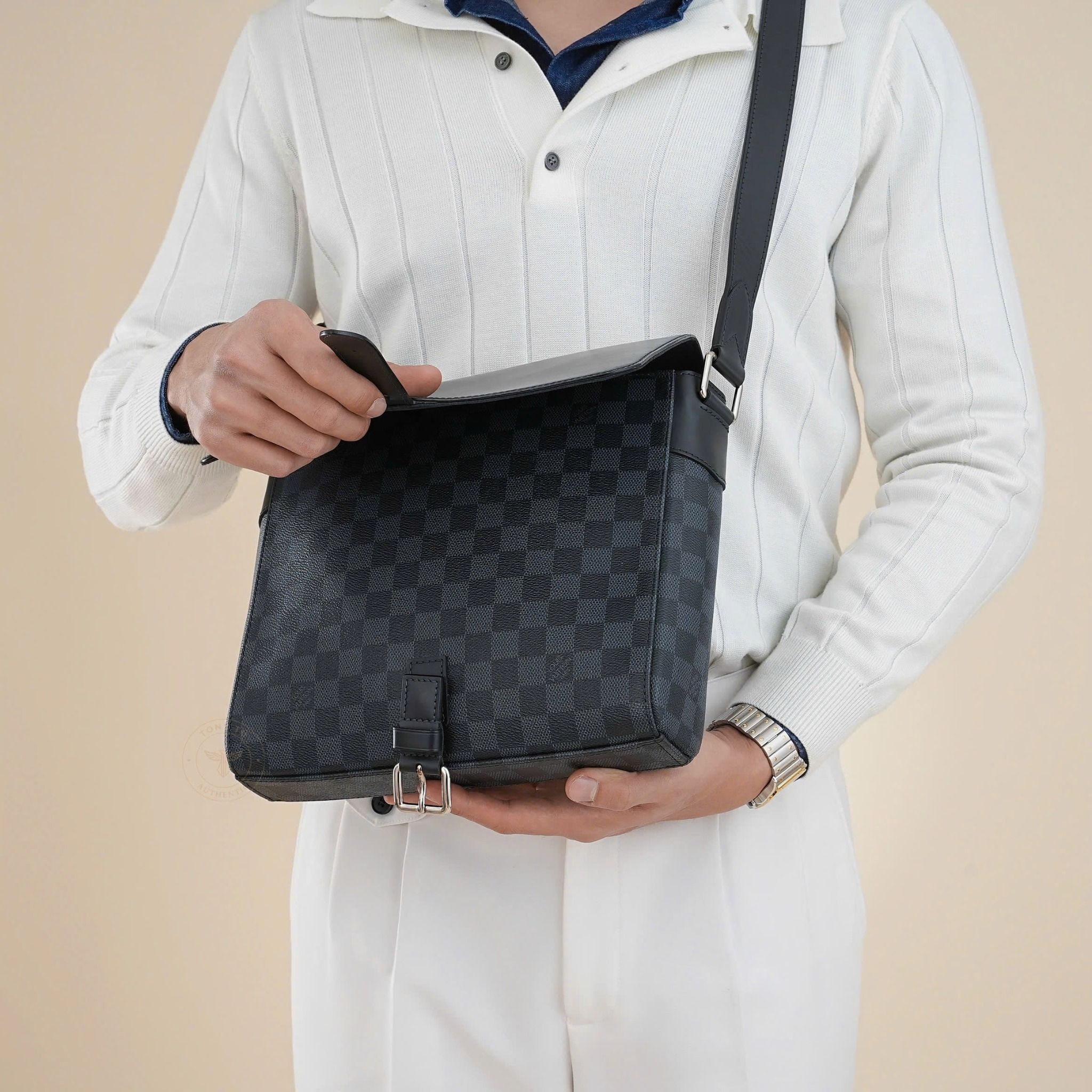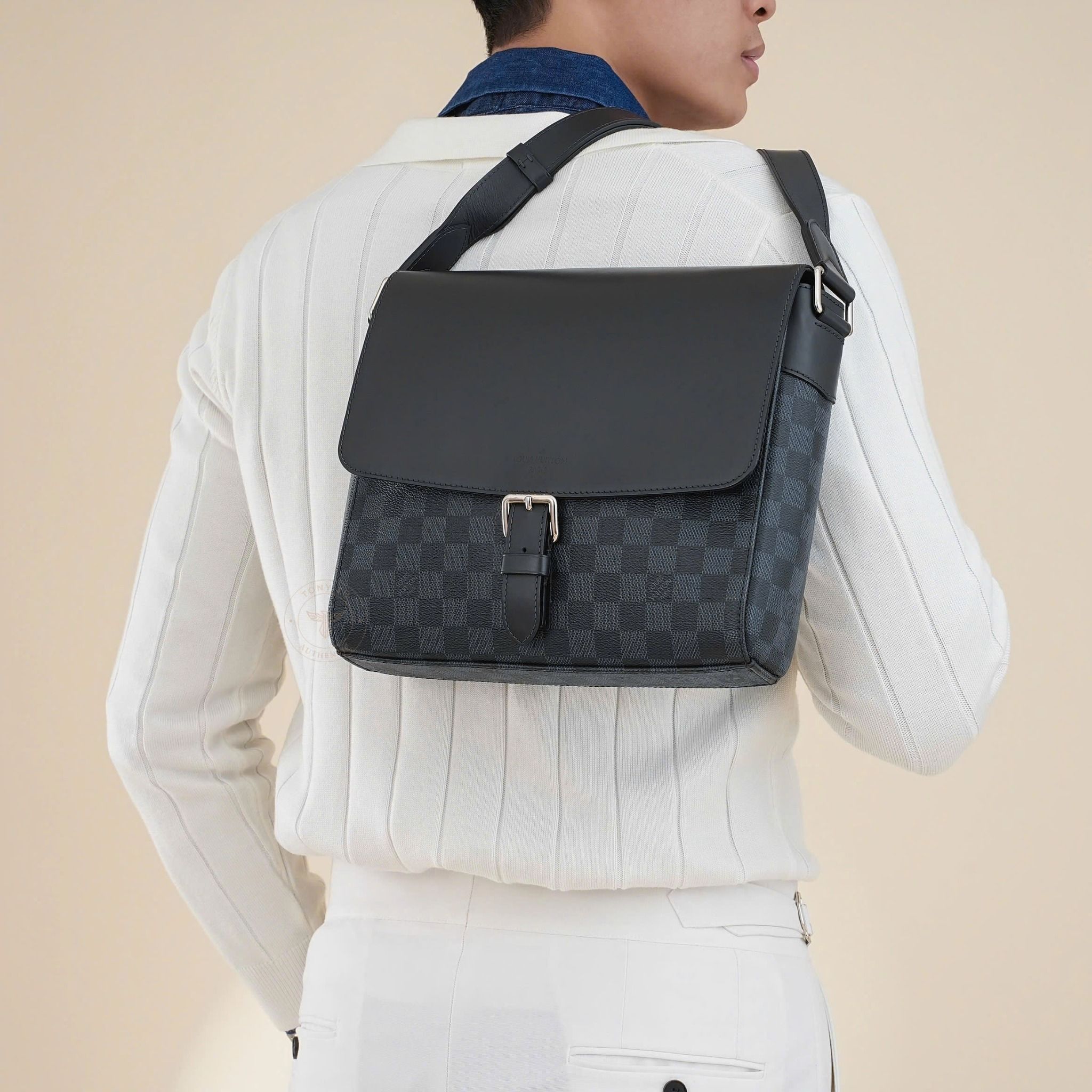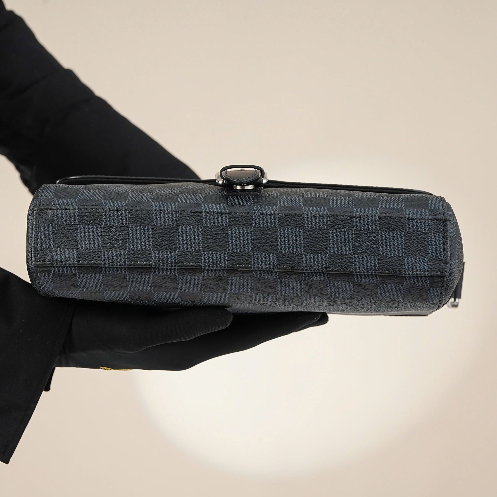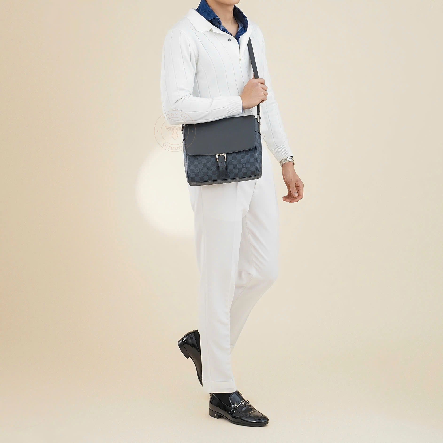 - Sử dụng họa tiết và tông màu Damier Cobalt, phối hợp hài hòa giữ tông xanh đậm và đen tên những ô vuông đặc trưng của Louis Vuitton, tạo nên vẻ ngoài nam tính, thanh lịch và nổi bật.
