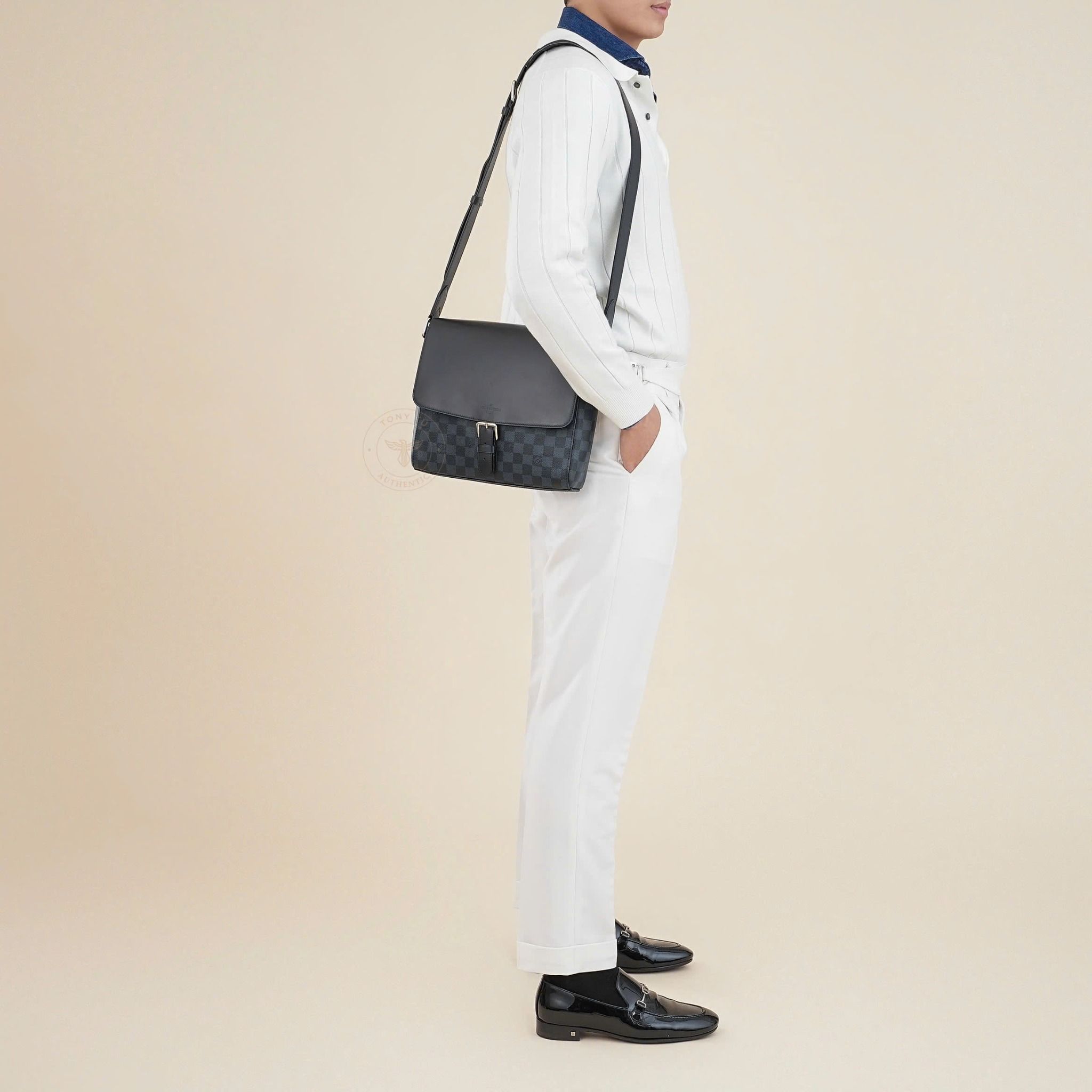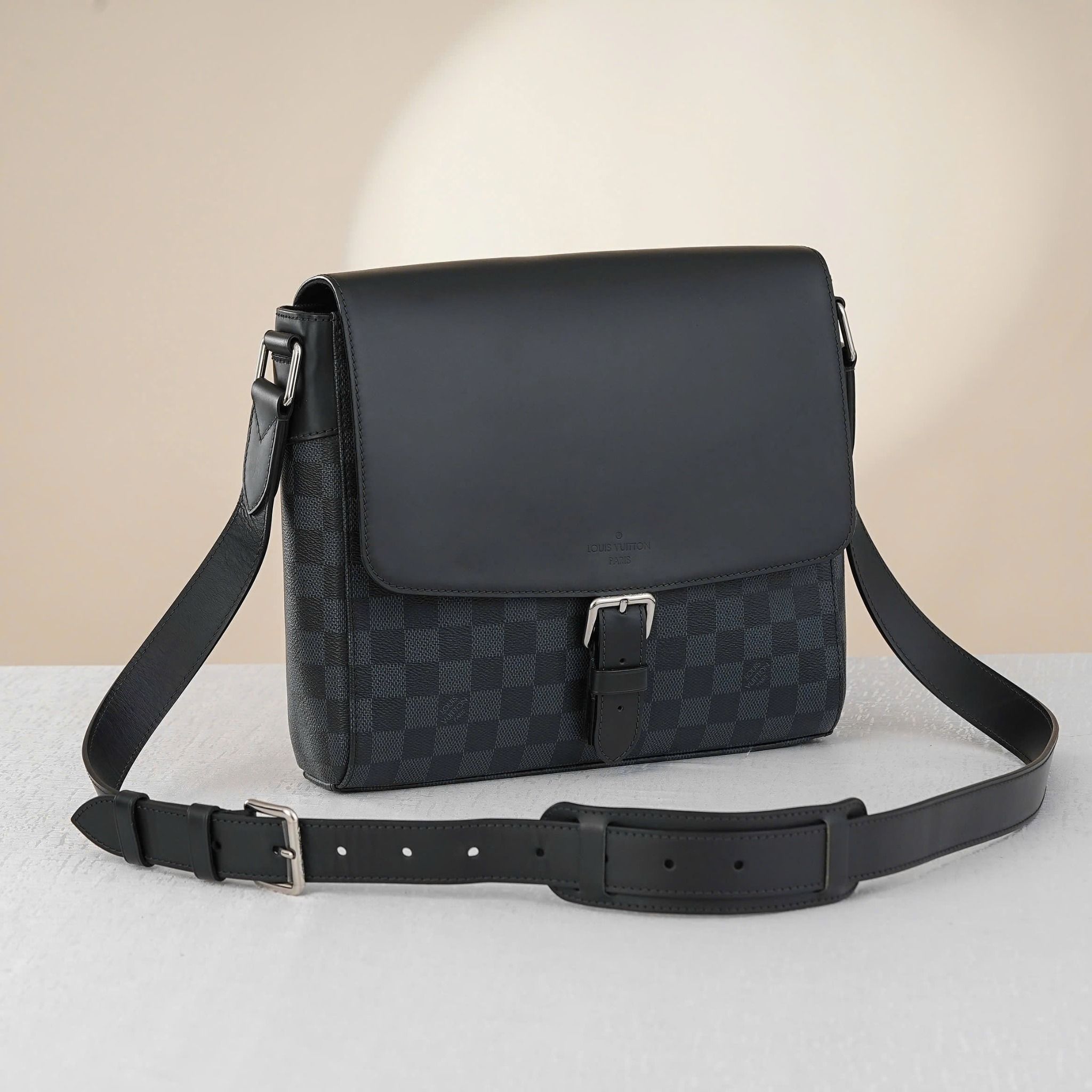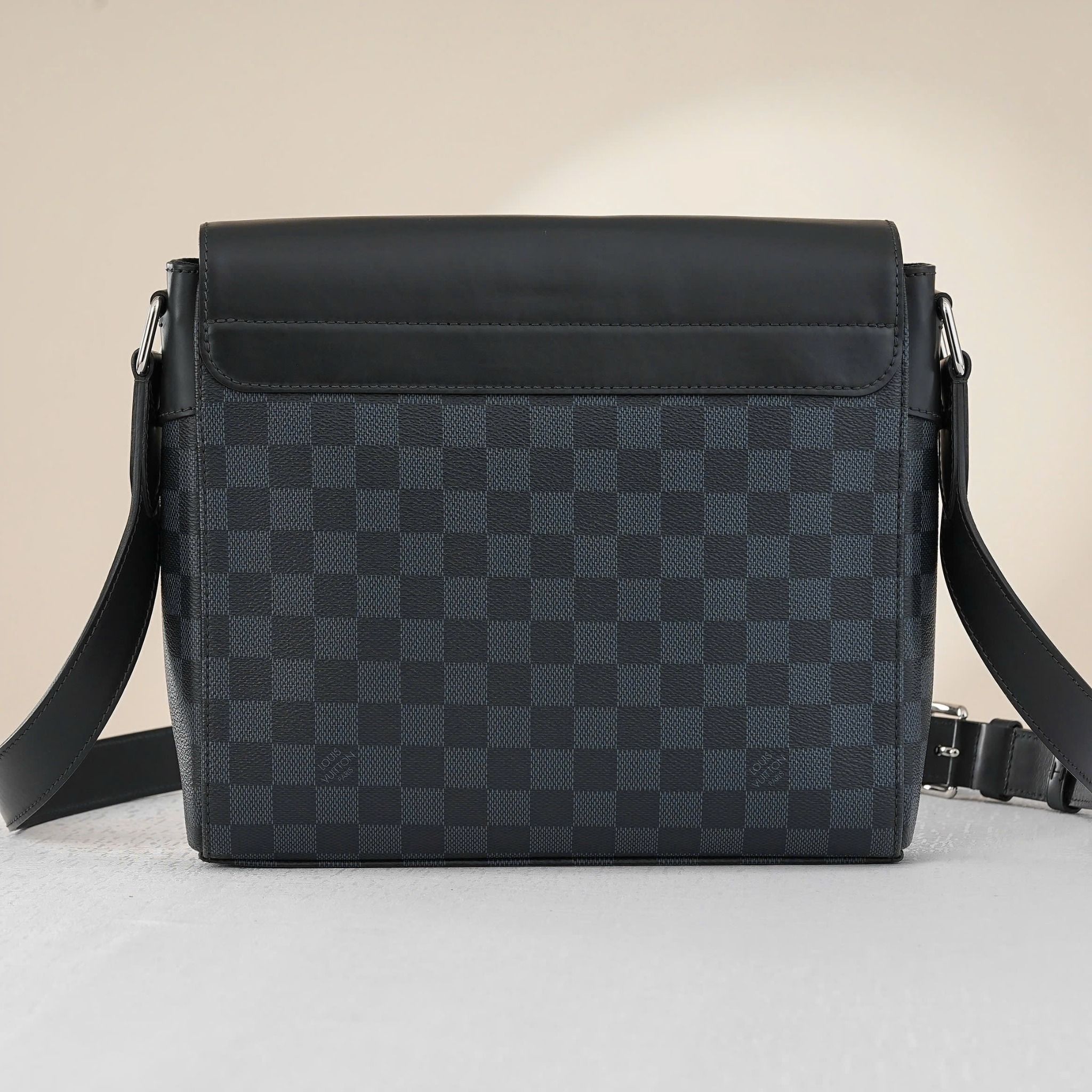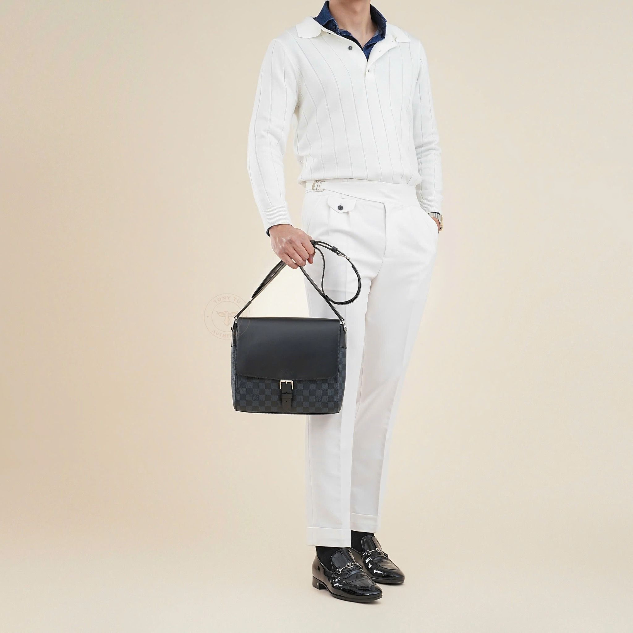 - Sử dụng họa tiết và tông màu Damier Cobalt, phối hợp hài hòa giữ tông xanh đậm và đen tên những ô vuông đặc trưng của Louis Vuitton, tạo nên vẻ ngoài nam tính, thanh lịch và nổi bật.