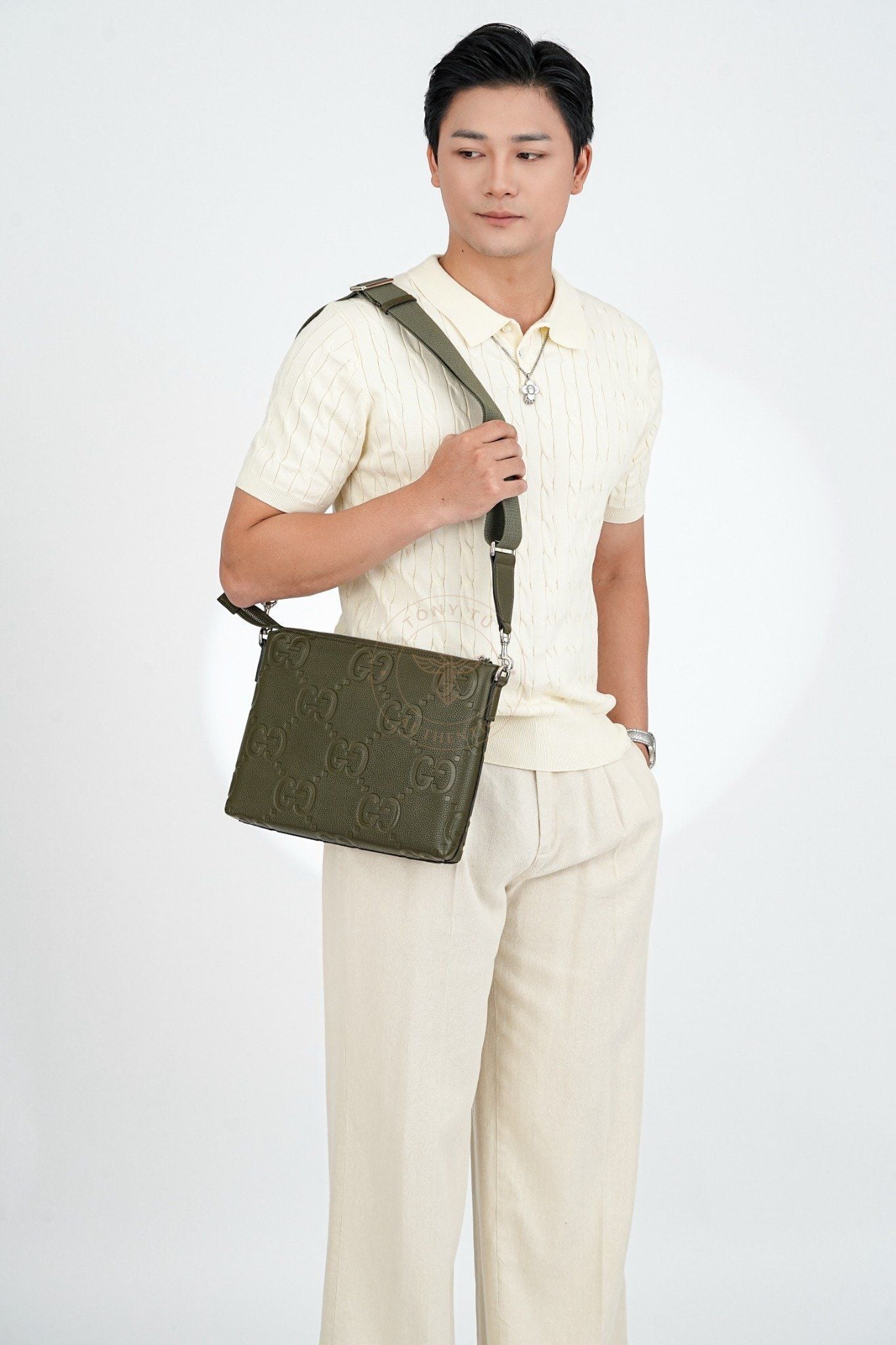 - Thiết kế Jumbo GG trở lại trong bộ sưu tập Tiền-Thu 2025 với họa tiết logo GG kích thước Maxi nổi bật thu hút ánh nhìn, mang hơi thở mới mẻ,đậm chất thời trang đương đại, nhưng vẫn gắn liền với di sản của Gucci.