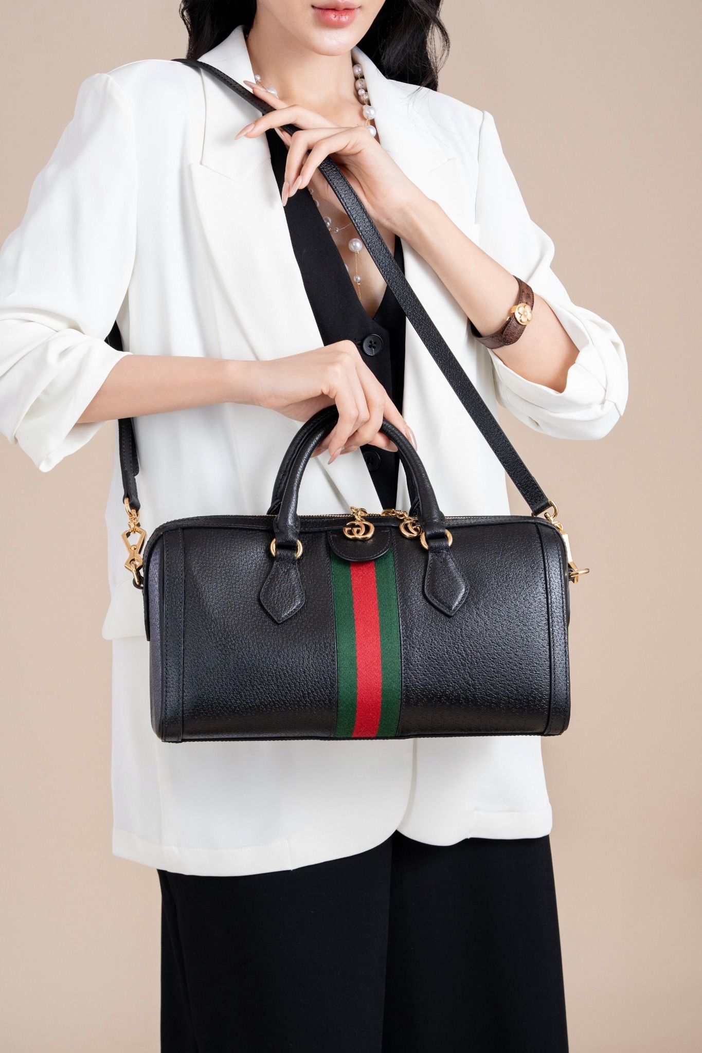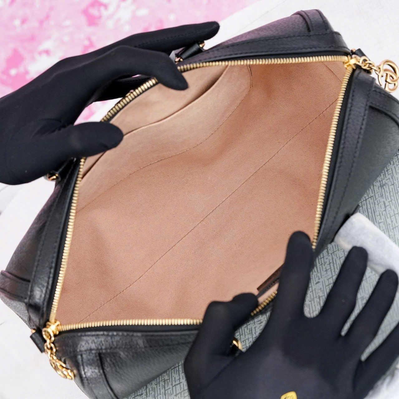 - Chế tác từ da dê Ý, được xử lý đặc biệt, mang đến sự dẻo dai và bền bỉ cùng khả năng chống xước tốt. Tông đen, All Black, kết hợp cùng họa tiết “Vintage web” xanh đỏ, toát lên sự quyền lực nhưng vẫn vô cùng thanh lịch.