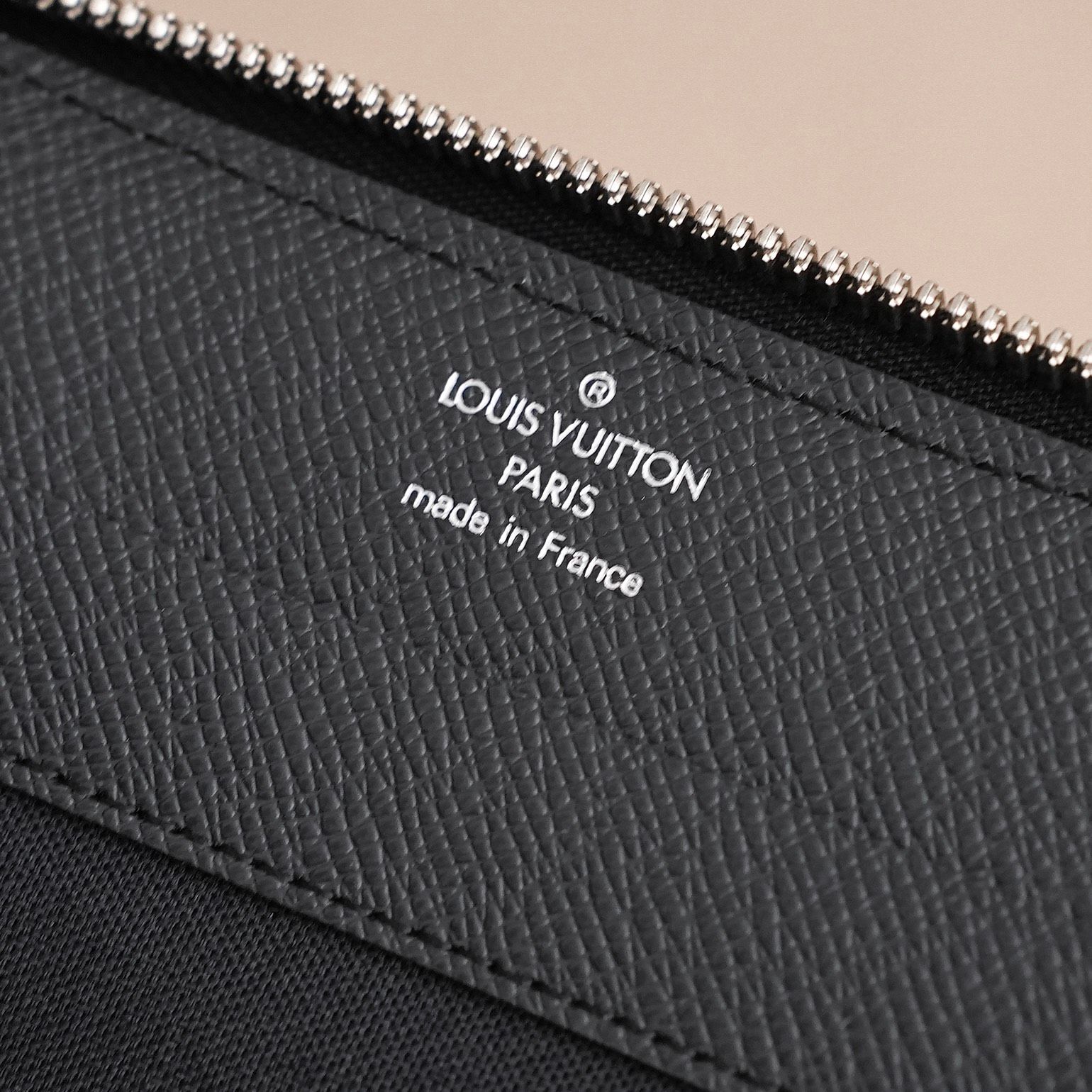 - Made from durable and exquisite Taiga leather in an elegant and mysterious black tone, leaving a lasting impression. Minimalist design featuring the LV logo subtly embossed in the corner, complemented by silver-tone hardware details.