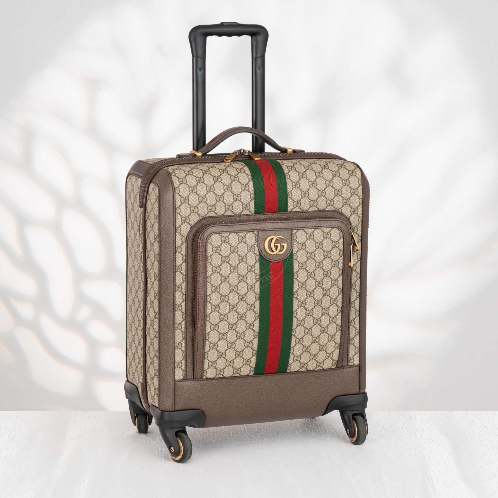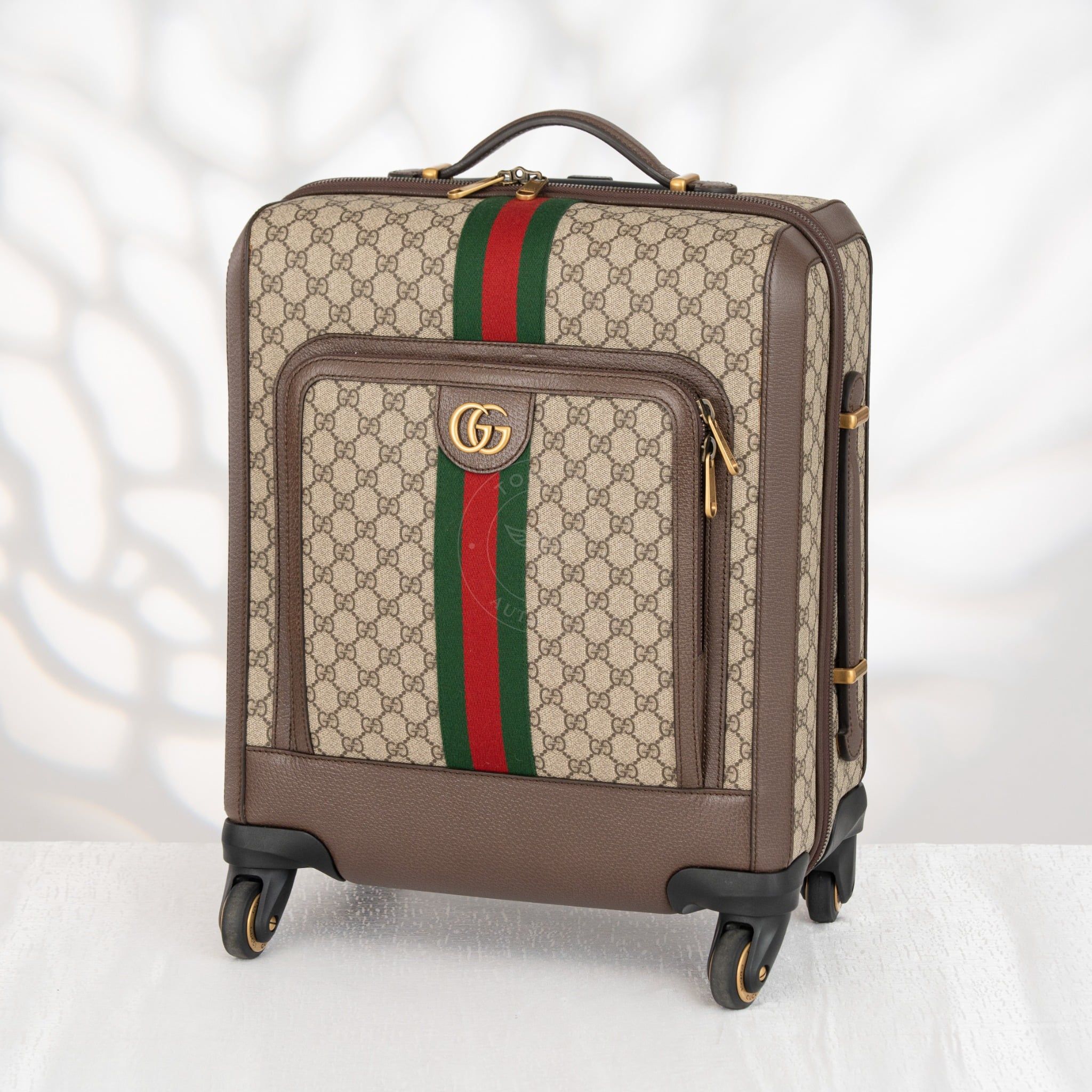 - Thiết kế sang trọng với canvas GG Supreme bền bỉ, viền da cao cấp và chi tiết kim loại tinh xảo, phản ánh tay nghề thủ công chuẩn mực của Gucci trong các dòng hành lý cao cấp.