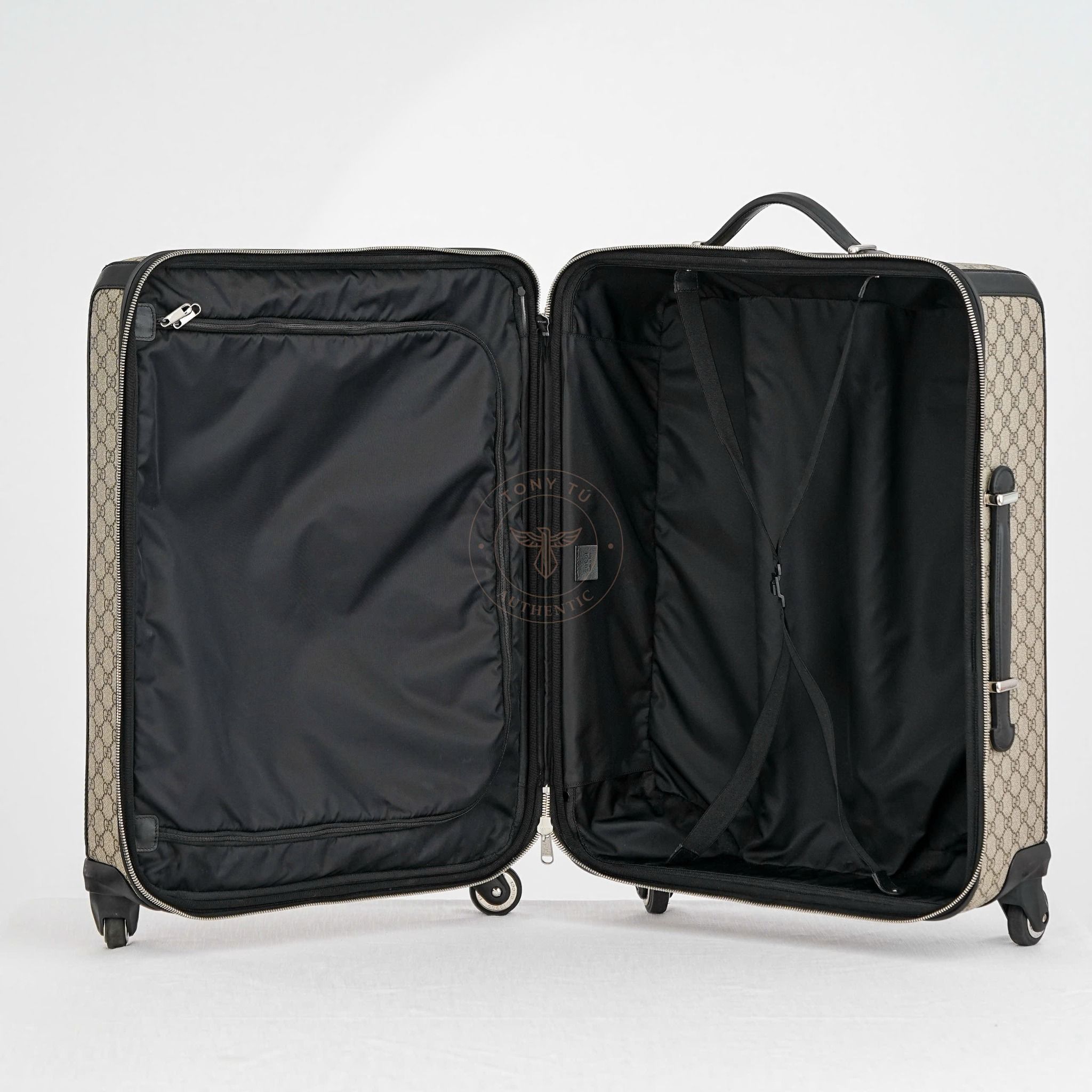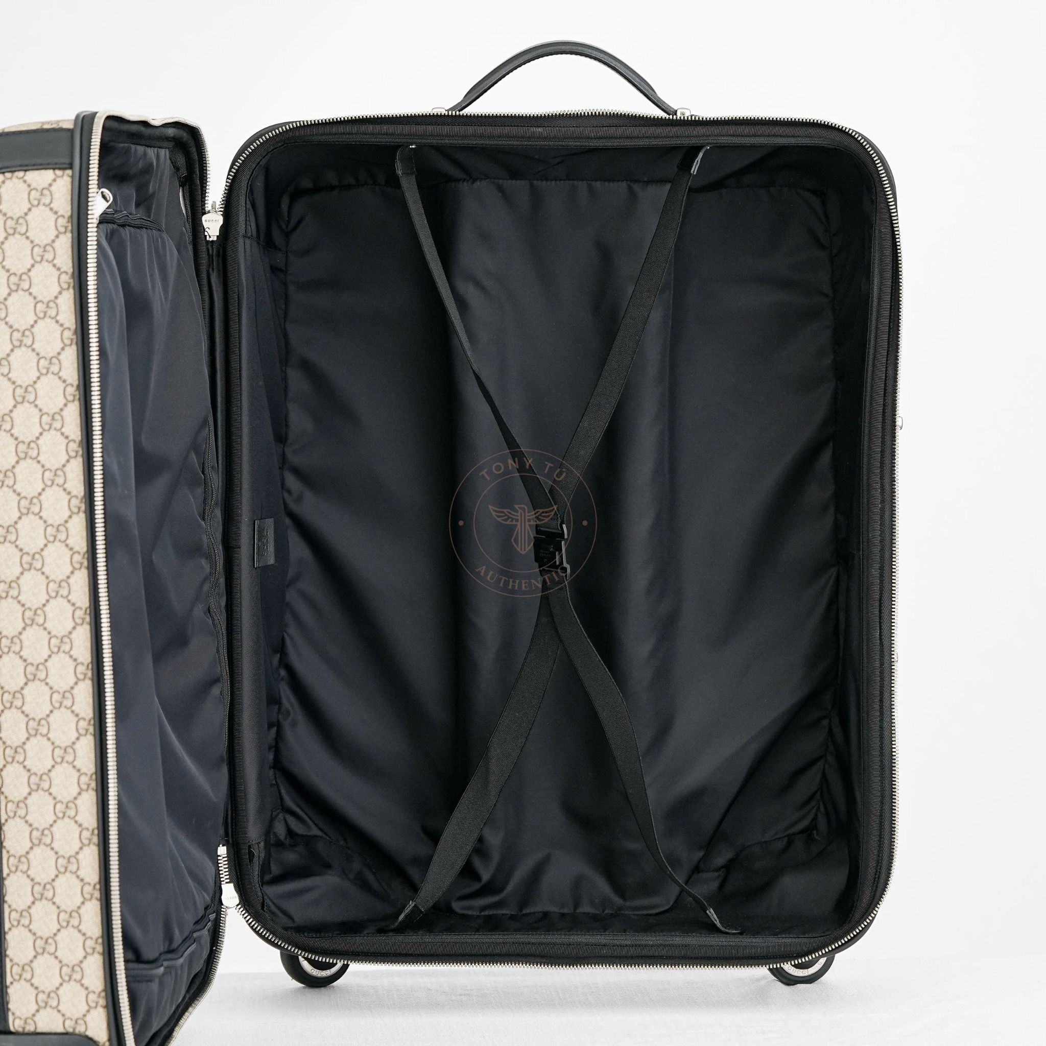 - Lấy cảm hứng từ tinh thần du hành thanh lịch, “Gucci Trolley”” kết hợp hài hòa giữa thiết kế cổ điển và tiện nghi hiện đại. Với canvas GG Supreme đặc trưng, hệ thống bánh xe xoay 360° và tay kéo linh hoạt, chiếc vali này là bạn đồng hành lý tưởng cho những hành trình đầy phong cách.
