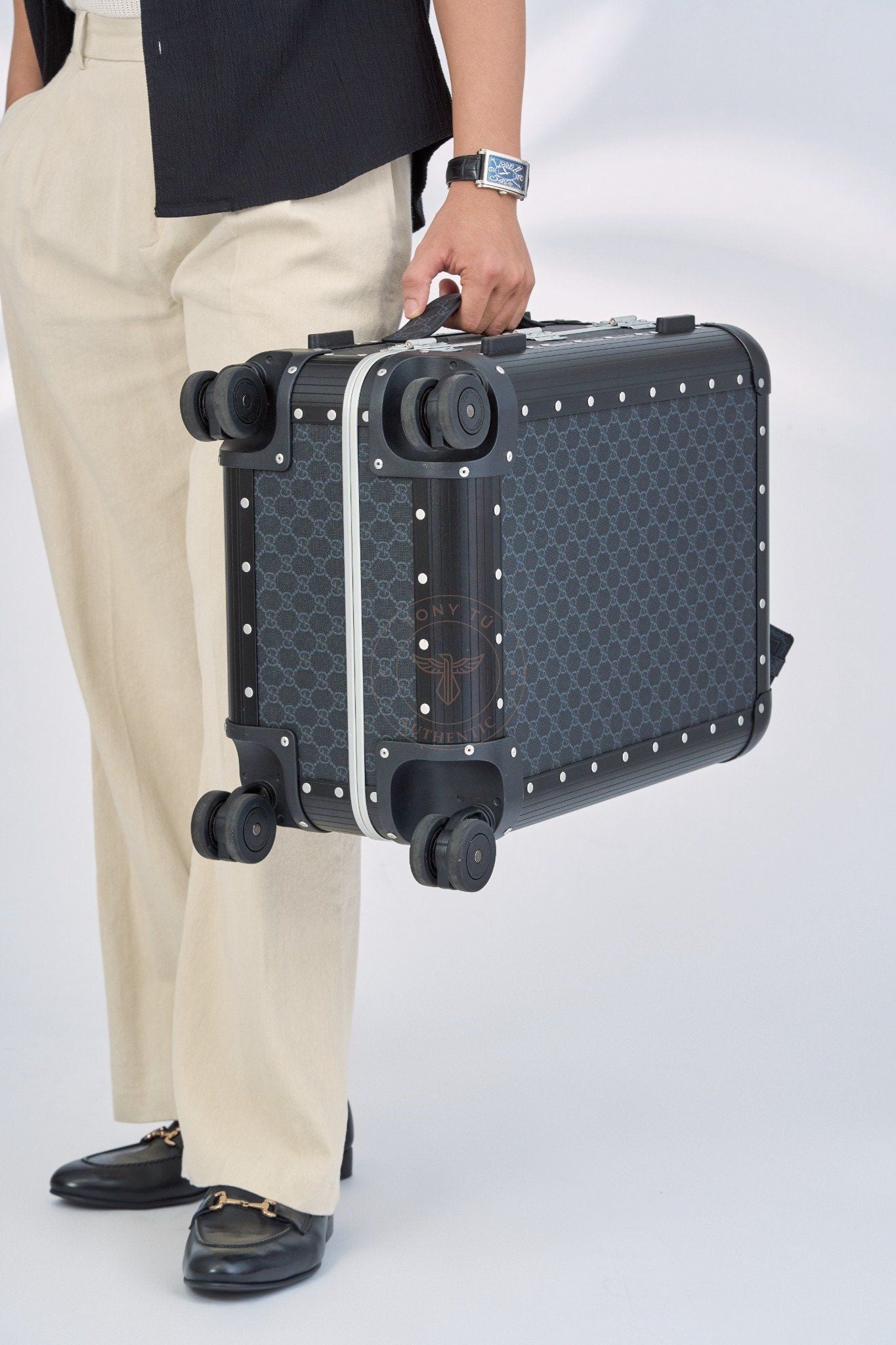 - Chế tác từ chất liệu canvas GG Supreme đặc trưng của Gucci, khung và viền được làm từ nhôm bạc, nội thất được lót bằng nylon bền nhẹ, đi kèm dây da cố định hành lý và ngăn kéo tiện lợi.