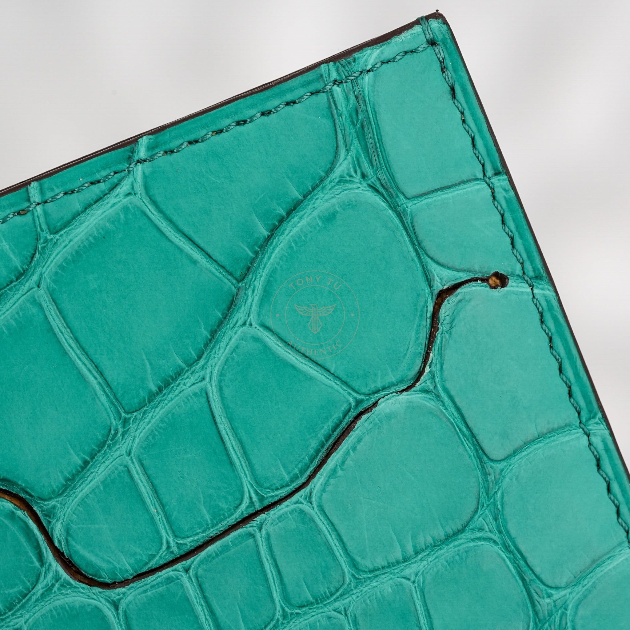 - Ví được chế tác từ da cá sấu American Alligator – loại da quý hiếm với độ bóng tinh tế. Mỗi chiếc ví cần trải qua hàng chục giờ xử lý thủ công, từ chọn vân vảy cân đối, nhuộm màu emerald để tạo độ sâu đặc trưng, đến khâu gấp mép mỏng chuẩn xác theo kỹ thuật piqué retourné. Nội thất được hoàn thiện tỉ mỉ với các khe thẻ và đường may đều tăm tắp, thể hiện sự chính xác tuyệt đối của nghệ nhân Hermès.